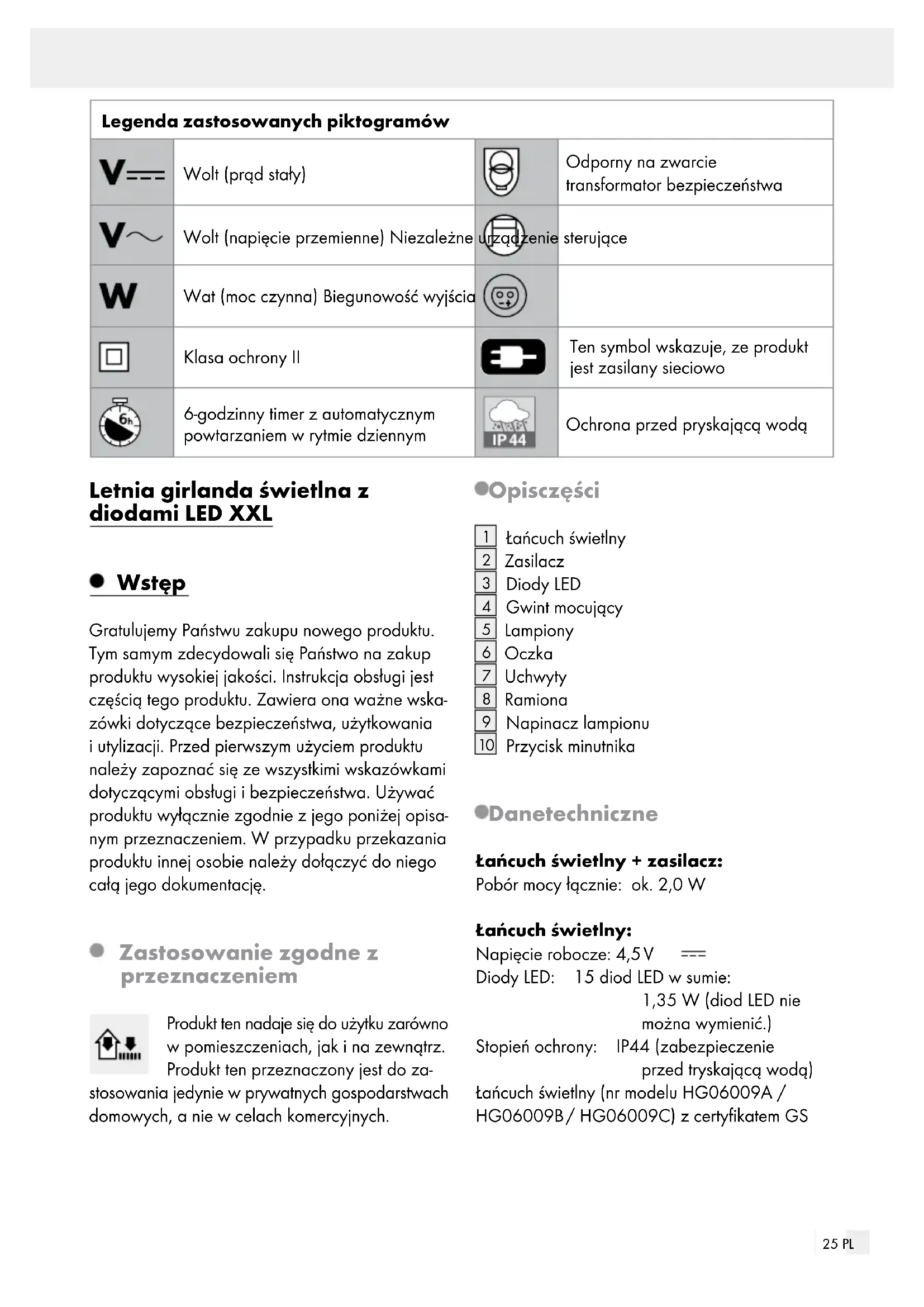 Przycisk minutnika Dane techniczne Łańcuch świetlny + zasilacz: Pobór mocy łącznie: ok. 2,0 W Łańcuch świetlny: Napięcie robocze: 4,5 V Diody LED: 15 diod LED w sumie: 1,35 W (diod LED nie można wymienić.) Stopień ochrony: IP44 (zabezpieczenie przed tryskającą wodą) Łańcuch świetlny (nr modelu HG06009A / HG06009B / HG06009C) z certyfikatem GS26 PL Zasilacz: Napięcie znamionowe główne: 100–240 V∼, 50 / 60 Hz Napięcie znamionowe wtórne: 4,5 V , 1,35 W Klasa ochrony: II / Stopień ochrony: IP44 (zabezpieczenie przed tryskającą wodą) Zasilacz (nr modelu DS-DZ045DC0135H-IP44) z certyfikatem GS SELV: bardzo niskie napięcie bezpieczne (Safety extra low voltage) Ta: Maksymalna temperatura otoczenia Zawartość 1 letnia girlanda świetlna z diodami LED XXL 15 latarni 1 zasilacz sieciowy 1 instrukcja obsługi Wskazówki bezpieczeństwa