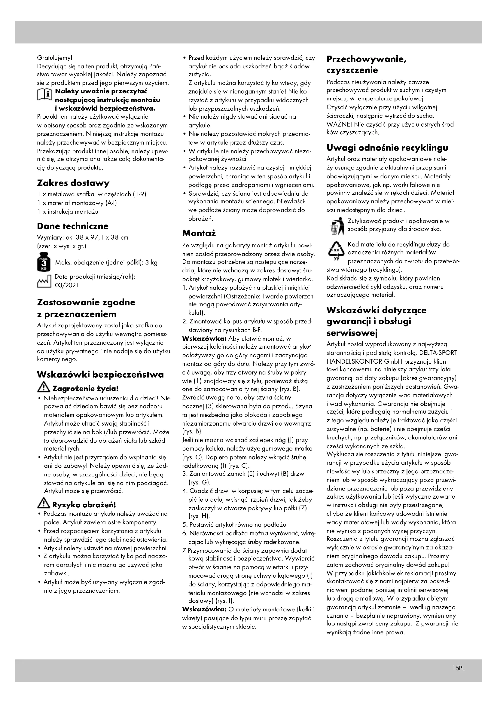kową stabilność i bezpieczeństwo. Wywiercić otwór w ścianie za pomocą wiertarki i przy- mocować drugą stronę uchwytu kątowego (I) do ściany, korzystając z odpowiedniego ma- teriału montażowego (nie wchodzi w zakres dostawy) (rys. I). Wskazówka: O materiały montażowe (kołki i wkręty) pasujące do typu muru proszę zapytać w specjalistycznym sklepie. Przechowywanie, czyszczenie Podczas nieużywania należy zawsze przechowywać produkt w suchym i czystym miejscu, w temperaturze pokojowej. Czyścić wyłącznie przy użyciu wilgotnej ściereczki, następnie wytrzeć do sucha. WAŻNE! Nie czyścić przy użyciu ostrych środ- ków czyszczących. Uwagi odnośnie recyklingu Artykuł oraz materiały opakowaniowe nale- ży usunąć zgodnie z aktualnymi przepisami obowiązującymi w danym miejscu. Materiały opakowaniowe, jak np. worki foliowe nie powinny znaleźć się w rękach dzieci. Materiał opakowaniowy należy przechowywać w miej- scu niedostępnym dla dzieci. Zutylizować produkt i opakowanie w sposób przyjazny dla środowiska. Kod materiału do recyklingu służy do oznaczenia różnych materiałów przeznaczonych do zwrotu do przetwór- stwa wtórnego (recyklingu). Kod składa się z symbolu, który powinien odzwierciedlać cykl odzysku, oraz numeru oznaczającego materiał. Wskazówki dotyczące gwarancji i obsługi serwisowej Artykuł został wyprodukowany z najwyższą starannością i pod stałą kontrolą. DELTA-SPORT HANDELSKONTOR GmbH przyznaje klien- towi końcowemu na niniejszy artykuł trzy lata gwarancji od daty zakupu (okres gwarancyjny) z zastrzeżeniem poniższych postanowień. Gwa- rancja dotyczy wyłącznie wad materiałowych i wad wykonania. Gwarancja nie obejmuje części, które podlegają normalnemu zużyciu i z tego względu należy je traktować jako części zużywalne (np. baterie) i nie obejmuje części kruchych, np. przełączników, akumulatorów ani części wykonanych ze szkła. Wyklucza się roszczenia z tytułu niniejszej gwa- rancji w przypadku użycia artykułu w sposób niewłaściwy lub sprzeczny z jego przeznacze- niem lub w sposób wykraczający poza przewi- dziane przeznaczenie lub poza przewidziany zakres użytkowania lub jeśli wytyczne zawarte w instrukcji obsługi nie były przestrzegane, chyba że klient końcowy udowodni istnienie wady materiałowej lub wady wykonania, która nie wynika z podanych wyżej przyczyn. Roszczenia z tytułu gwarancji można zgłaszać wyłącznie w okresie gwarancyjnym za okaza- niem oryginalnego dowodu zakupu. Prosimy zatem zachować oryginalny dowód zakupu! W przypadku jakichkolwiek reklamacji prosimy skontaktować się z nami najpierw za pośred- nictwem podanej poniżej infolinii serwisowej lub drogą e-mailową. W przypadku objętym gwarancją artykuł zostanie – według naszego uznania – bezpłatnie naprawiony, wymieniony lub nastąpi zwrot ceny zakupu. Z gwarancji nie wynikają żadne inne prawa.16 PL Niniejsza gwarancja nie ogranicza Państwa ustawowych praw, w szczególności roszczeń gwarancyjnych wobec danego sprzedawcy. W przypadku wymiany części lub całego arty- kułu okres gwarancji przedłuża się o trzy lata zgodnie z art. 581 § 1 kodeksu cywilnego. Po upłynięciu czasu gwarancji powstałe naprawy są płatne. IAN: 368959_2010 Serwis Polska Tel.: 22 397 4996 E-Mail: deltasport@lidl.pl17CZ Srdečně blahopřejeme! Svým nákupem jste se rozhodli pro kvalitní výro- bek. Před prvním použitím se prosím seznamte s tímto výrobkem. Pozorně si přečtete následující návod k sestavení a bezpečnostní pokyny. Používejte tento výrobek pouze tak, jak je popsá- no, a pro uvedené účely. Dobře si tento návod k sestavení uschovejte. Pokud výrobek předáte třetí osobě, předejte jí i veškerou dokumentaci. Rozsah dodávky 1 x kovová skřínka, rozložená (1- 9) 1 x montážní materiál (A-I) 1 x návod k sestavení Technická data Rozměry: cca 38 x 97,1 x 38 cm (š x v x hl.)