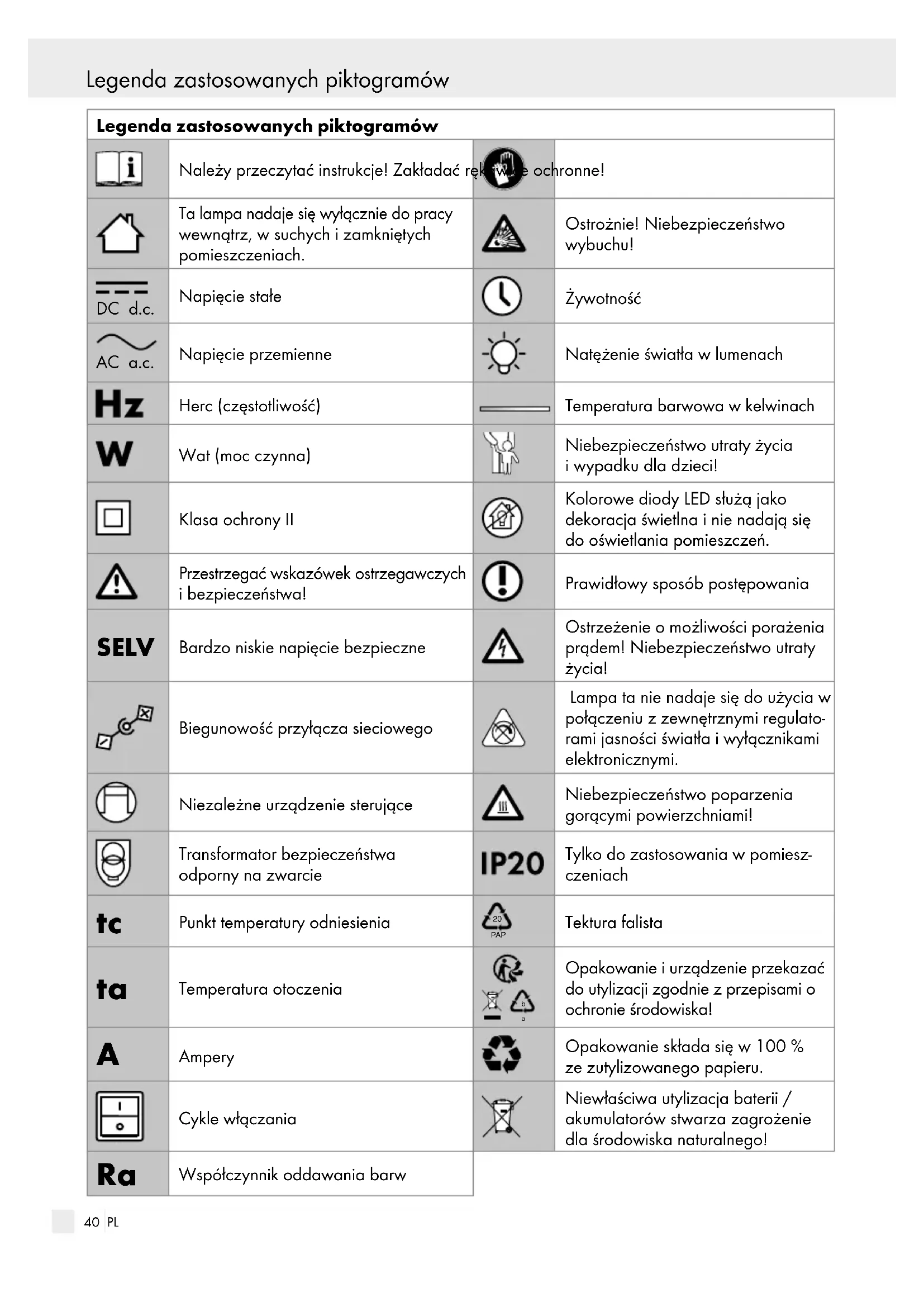 Współczynnik oddawania barw Instrukcja41 PL Legenda zastosowanych piktogramów Instrukcja Nastrojowe oświetlenie LED Instrukcja Gratulujemy Państwu zakupu nowego urządzenia. Zdecydowali się Państwo na zakup produktu najwyższej jakości. Proszę dokładnie przeczytać całą niniejszą instruk- cję obsługi. Niniejsza instrukcja obsługi należy do produktu i zawiera ważne wskazówki dotyczące uruchamiania i posługiwania się nim. Zawsze należy przestrzegać wszystkich wskazówek dotyczących bezpieczeństwa. Przed uruchomieniem proszę spraw- dzić, czy występuje prawidłowe napięcie i czy wszyst- kie części są prawidłowo zamontowane. W przypadku zapytań lub niepewności odnośnie obchodzenia się z urządzeniem prosimy o kontakt ze sprzedawcą lub punktem serwisowym. Proszę starannie prze- chowywać niniejszą instrukcję obsługi i ewentualnie przekazać ją osobom trzecim. Zastosowanie zgodne z przeznaczeniem Ta lampa nadaje się wyłącznie do pracy wewnątrz, w suchych i zamkniętych po- mieszczeniach. Lampa przeznaczona jest do zastosowania jedynie w prywatnych gospo- darstwach domowych, a nie w celach komercyjnych. Inne zastosowanie niż opisane powyżej jest niedo- zwolone i prowadzi do uszkodzenia produktu. Po- nadto łączy się to z ryzykiem, takim jak np. spięcie, pożar, porażenie prądem itp. Ten produkt przezna- czony jest do normalnego użytku. Kolorowe diody LED służą jako dekora- cja świetlna i nie nadają się do oświetla- nia pomieszczeń. Zawartość Bezpośrednio po wypakowaniu należy sprawdzić, czy zestaw jest kompletny oraz czy urządzenie jest w nienagannym stanie. 1 światło nastrojowe LED, model 14148906L 1 instrukcja obsługi Opis części