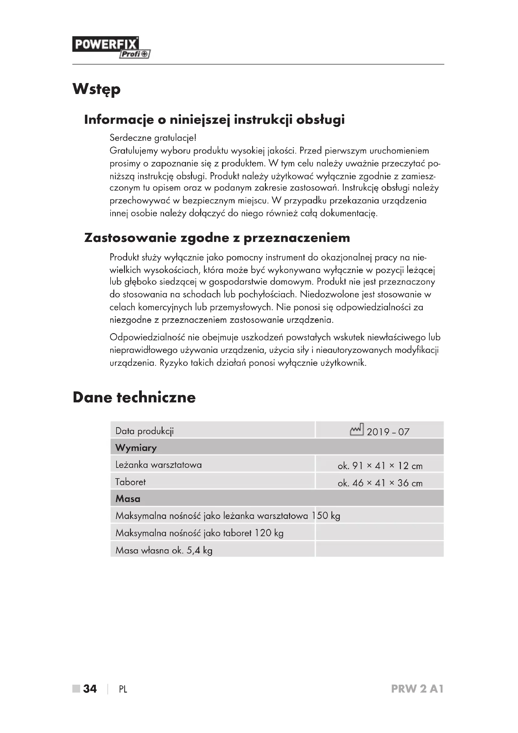 PL PRW 2 A1 Wstęp Informacje oniniejszej instrukcji obsługi Serdeczne gratulacje! Gratulujemy wyboru produktu wysokiej jakości. Przed pierwszym uruchomieniem prosimy o zapoznanie się z produktem. W tym celu należy uważnie przeczytać po- niższą instrukcję obsługi. Produkt należy użytkować wyłącznie zgodnie zzamiesz- czonym tu opisem oraz wpodanym zakresie zastosowań. Instrukcję obsługi należy przechowywać w bezpiecznym miejscu. Wprzypadku przekazania urządzenia innej osobie należy dołączyć do niego również całą dokumentację. Zastosowanie zgodne zprzeznaczeniem Produkt służy wyłącznie jako pomocny instrument do okazjonalnej pracy na nie- wielkich wysokościach, która może być wykonywana wyłącznie w pozycji leżącej lub głęboko siedzącej w gospodarstwie domowym. Produkt nie jest przeznaczony do stosowania na schodach lub pochyłościach. Niedozwolone jest stosowanie w celach komercyjnych lub przemysłowych. Nie ponosi się odpowiedzialności za niezgodne z przeznaczeniem zastosowanie urządzenia. Odpowiedzialność nie obejmuje uszkodzeń powstałych wskutek niewłaściwego lub nieprawidłowego używania urządzenia, użycia siły i nieautoryzowanych modyfikacji urządzenia. Ryzyko takich działań ponosi wyłącznie użytkownik. Dane techniczne Data produkcji 2019 – 07 Wymiary Leżanka warsztatowa ok. 91 × 41 × 12 cm Taboret ok. 46 × 41 × 36 cm Masa Maksymalna nośność jako leżanka warsztatowa 150 kg Maksymalna nośność jako taboret 120 kg Masa własna ok. 5,4 kgPL