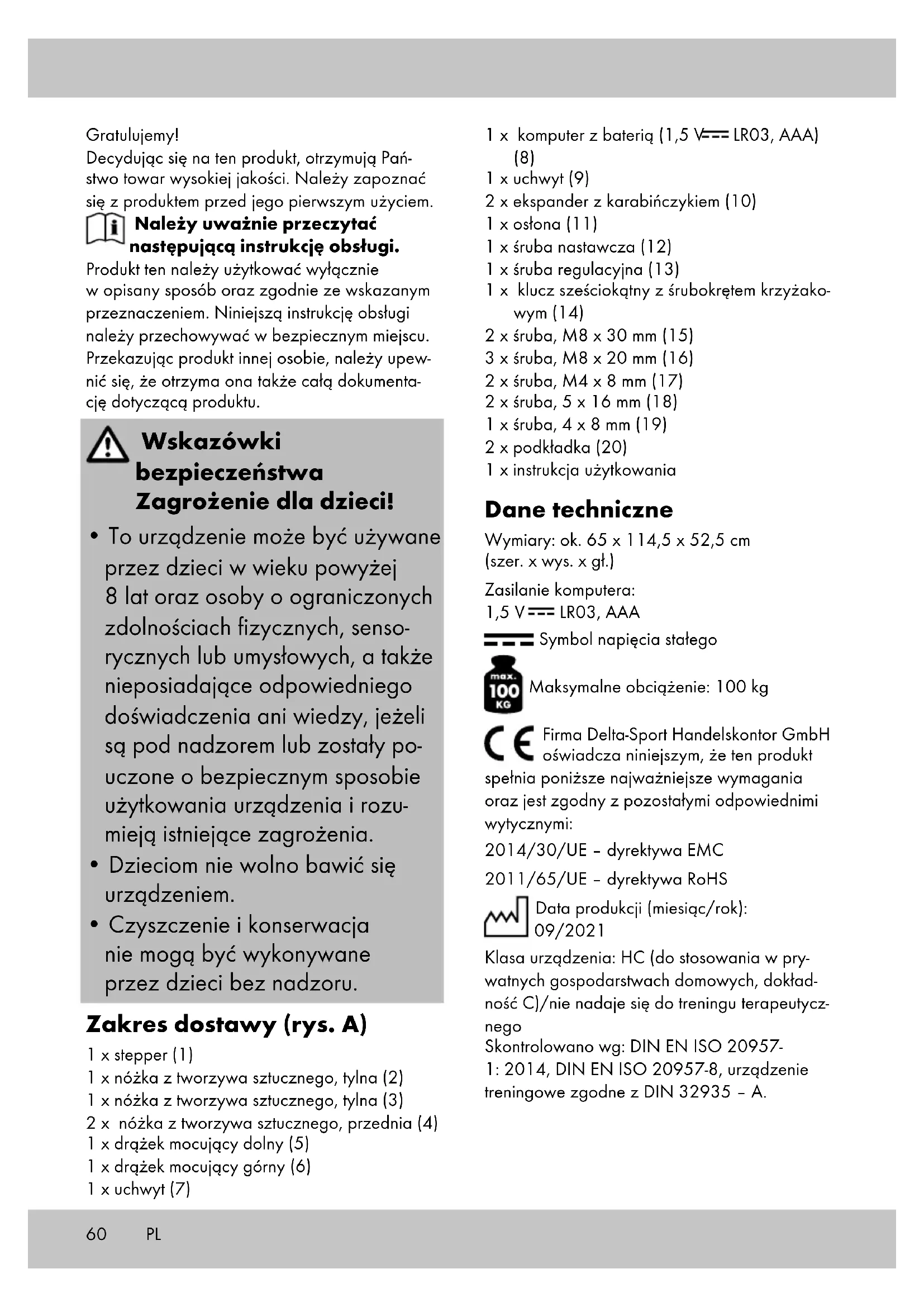 - Czyszczenie i konserwacja nie mogą być wykonywane przez dzieci bez nadzoru. Zakres dostawy (rys. A) 1 x stepper (1) 1 x nóżka z tworzywa sztucznego, tylna (2) 1 x nóżka z tworzywa sztucznego, tylna (3) 2 x nóżka z tworzywa sztucznego, przednia (4) 1 x drążek mocujący dolny (5) 1 x drążek mocujący górny (6) 1 x uchwyt (7) 1 x komputer z baterią (1,5 V LR03, AAA) (8) 1 x uchwyt (9) 2 x ekspander z karabińczykiem (10) 1 x osłona (11) 1 x śruba nastawcza (12) 1 x śruba regulacyjna (13) 1 x klucz sześciokątny z śrubokrętem krzyżako- wym (14) 2 x śruba, M8 x 30 mm (15) 3 x śruba, M8 x 20 mm (16) 2 x śruba, M4 x 8 mm (17) 2 x śruba, 5 x 16 mm (18) 1 x śruba, 4 x 8 mm (19) 2 x podkładka (20) 1 x instrukcja użytkowania Dane techniczne Wymiary: ok. 65 x 114,5 x 52,5 cm (szer. x wys. x gł.) Zasilanie komputera: 1,5 V LR03, AAA Symbol napięcia stałego Maksymalne obciążenie: 100 kg Firma Delta-Sport Handelskontor GmbH oświadcza niniejszym, że ten produkt spełnia poniższe najważniejsze wymagania oraz jest zgodny z pozostałymi odpowiednimi wytycznymi: 2014/30/UE – dyrektywa EMC 2011/65/UE – dyrektywa RoHS Data produkcji (miesiąc/rok): 09/2021 Klasa urządzenia: HC (do stosowania w pry- watnych gospodarstwach domowych, dokład- ność C)/nie nadaje się do treningu terapeutycz- nego Skontrolowano wg: DIN EN ISO 20957- 1: 2014, DIN EN ISO 20957-8, urządzenie treningowe zgodne z DIN 32935 – A. PL61 Długość przy maksymalnym rozciągnięciu: 165 cm przy sile 19,5 N. Zakres tolerancji dla siły wynosi maksymalnie 20% (+/-). Urządzenie treningowe typ A jest zgodne z nor- mą DIN 32935. Symulacja kroków Stepper wyposażony jest w pedały poruszające się zależnie od siebie. System hamowania oporowego Stepper wyposażony jest w układ zależny od prędkości. Użytkowanie zgodne z przeznaczeniem Produkt nadaje się wyłącznie do stosowania jako sprzęt treningowy. Produkt jest przezna- czony do użytku prywatnego i nie nadaje się do celów medycznych ani komercyjnych. Pro- dukt przeznaczony do użytkowania w pomiesz- czeniach. Wskazówki bezpieczeństwa Zagrożenia ogólne