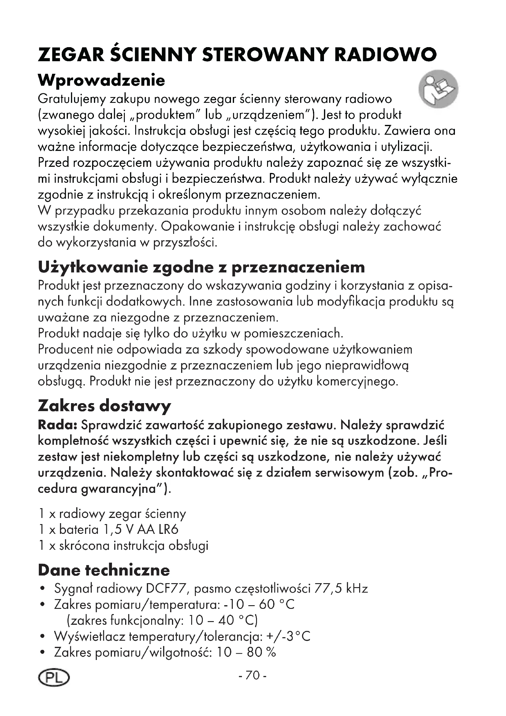 Wprowadzenie Gratulujemy zakupu nowego zegar ścienny sterowany radiowo (zwanego dalej „produktem” lub „urządzeniem”) Jest to produkt wysokiej jakości Instrukcja obsługi jest częścią tego produktu Zawiera ona ważne informacje dotyczące bezpieczeństwa, użytkowania i utylizacji Przed rozpoczęciem używania produktu należy zapoznać się ze wszystki- mi instrukcjami obsługi i bezpieczeństwa Produkt należy używać wyłącznie zgodnie z instrukcją i określonym przeznaczeniem W przypadku przekazania produktu innym osobom należy dołączyć wszystkie dokumenty Opakowanie i instrukcję obsługi należy zachować do wykorzystania w przyszłości Użytkowanie zgodne zprzeznaczeniem Produkt jest przeznaczony do wskazywania godziny i korzystania z opisa- nych funkcji dodatkowych Inne zastosowania lub modyfikacja produktu są uważane za niezgodne z przeznaczeniem Produkt nadaje się tylko do użytku w pomieszczeniach Producent nie odpowiada za szkody spowodowane użytkowaniem urządzenia niezgodnie z przeznaczeniem lub jego nieprawidłową obsługą Produkt nie jest przeznaczony do użytku komercyjnego Zakres dostawy Rada: Sprawdzić zawartość zakupionego zestawu. Należy sprawdzić kompletność wszystkich części i upewnić się, że nie są uszkodzone. Jeśli zestaw jest niekompletny lub części są uszkodzone, nie należy używać urządzenia. Należy skontaktować się z działem serwisowym (zob. „Pro- cedura gwarancyjna”). 1 x radiowy zegar ścienny 1 x bateria 1,5 V AA LR6 1 x skrócona instrukcja obsługi Dane techniczne