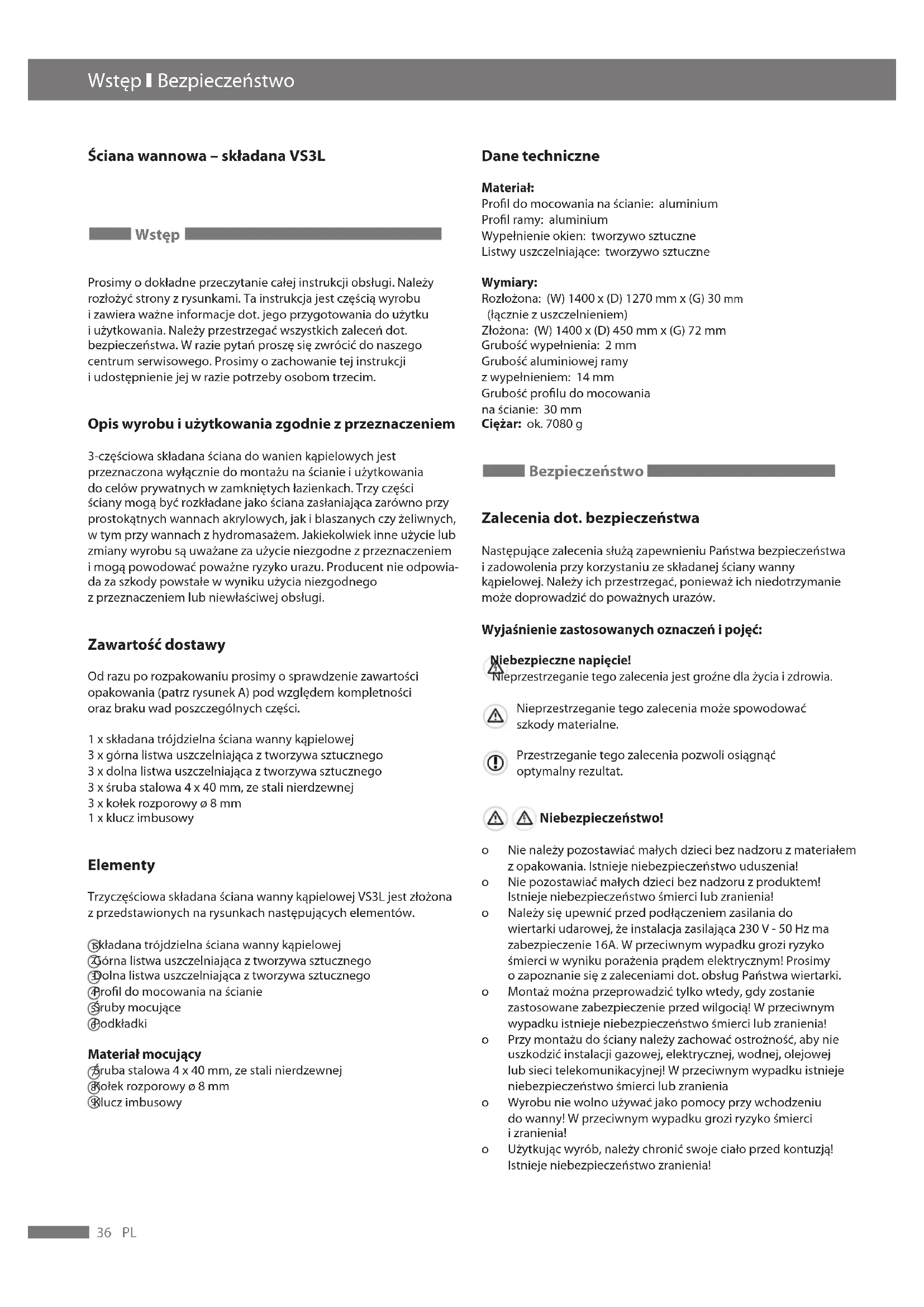 Dane techniczne Materiał:Prol do mocowania na ścianie: aluminiumProl ramy: aluminiumWypełnienie okien: tworzywo sztuczneListwy uszczelniające: tworzywo sztuczneWymiary:Rozłożona: (W) 1400 x (D) 1270 mm x (G) 30 mm (łącznie z uszczelnieniem)Złożona: (W) 1400 x (D) 450 mm x (G) 72 mm Grubość wypełnienia: 2 mmGrubość aluminiowej ramy z wypełnieniem: 14 mmGrubość prolu do mocowania na ścianie: 30 mmCiężar: ok. 7080 g Bezpieczeństwo Zalecenia dot. bezpieczeństwa Następujące zalecenia służą zapewnieniu Państwa bezpieczeństwa i zadowolenia przy korzystaniu ze składanej ściany wanny kąpielowej. Należy ich przestrzegać, ponieważ ich niedotrzymanie może doprowadzić do poważnych urazów.Wyjaśnienie zastosowanych oznaczeń i pojęć: Niebezpieczne napięcie! Nieprzestrzeganie tego zalecenia jest groźne dla życia i zdrowia. Nieprzestrzeganie tego zalecenia może spowodować szkody materialne. Przestrzeganie tego zalecenia pozwoli osiągnąć optymalny rezultat. Niebezpieczeństwo!o Nie należy pozostawiać małych dzieci bez nadzoru z materiałem z opakowania. Istnieje niebezpieczeństwo uduszenia! o Nie pozostawiać małych dzieci bez nadzoru z produktem! Istnieje niebezpieczeństwo śmierci lub zranienia!o Należy się upewnić przed podłączeniem zasilania do wiertarki udarowej, że instalacja zasilająca 230 V - 50 Hz ma zabezpieczenie 16A. W przeciwnym wypadku grozi ryzyko śmierci w wyniku porażenia prądem elektrycznym! Prosimy o zapoznanie się z zaleceniami dot. obsług Państwa wiertarki.o Montaż można przeprowadzić tylko wtedy, gdy zostanie zastosowane zabezpieczenie przed wilgocią! W przeciwnym wypadku istnieje niebezpieczeństwo śmierci lub zranienia!o Przy montażu do ściany należy zachować ostrożność, aby nie uszkodzić instalacji gazowej, elektrycznej, wodnej, olejowej lub sieci telekomunikacyjnej! W przeciwnym wypadku istnieje niebezpieczeństwo śmierci lub zranieniao Wyrobu nie wolno używać jako pomocy przy wchodzeniu do wanny! W przeciwnym wypadku grozi ryzyko śmierci i zranienia!o Użytkując wyrób, należy chronić swoje ciało przed kontuzją! Istnieje niebezpieczeństwo zranienia!