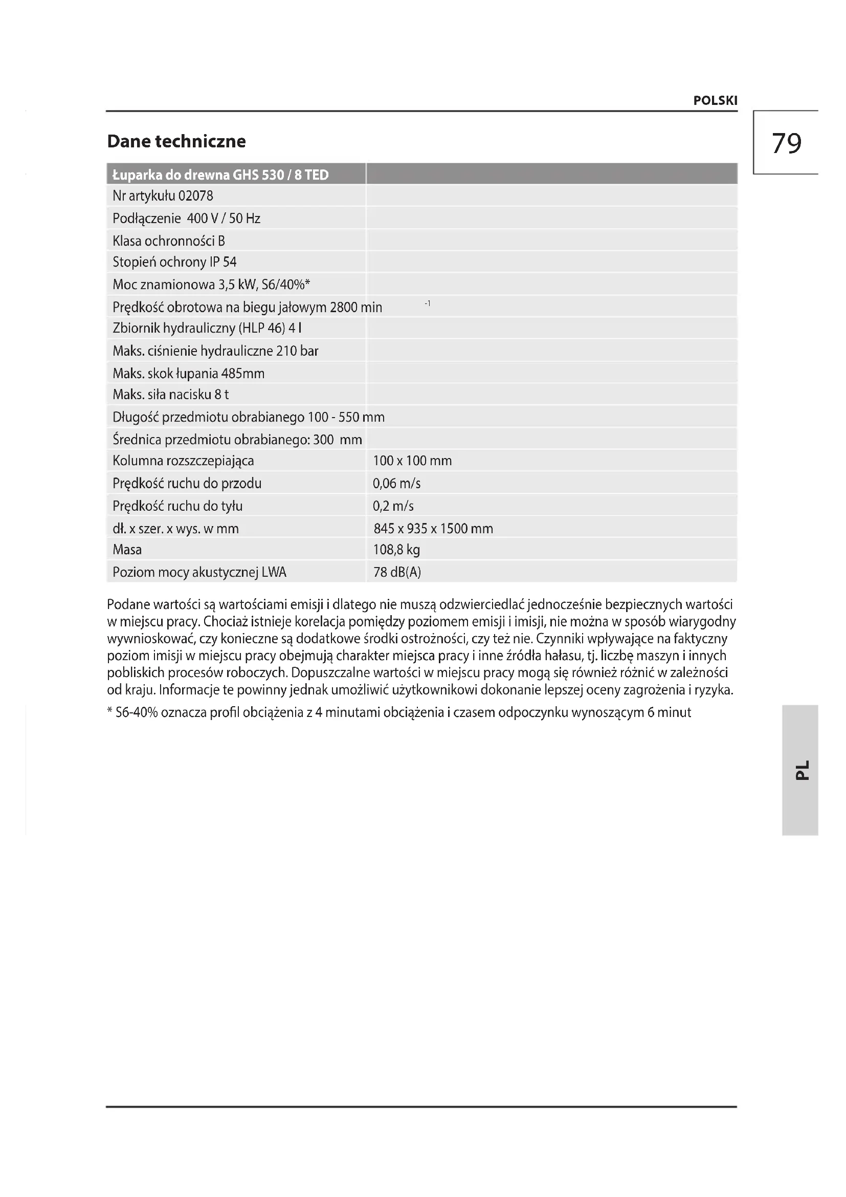 POLSKI Dane techniczne Łuparka do drewna GHS 530 / 8 TED Nr artykułu 02078 Podłączenie 400 V / 50 Hz Klasa ochronności B Stopień ochrony IP 54 Moc znamionowa 3,5 kW, S6/40%* Prędkość obrotowa na biegu jałowym 2800 min