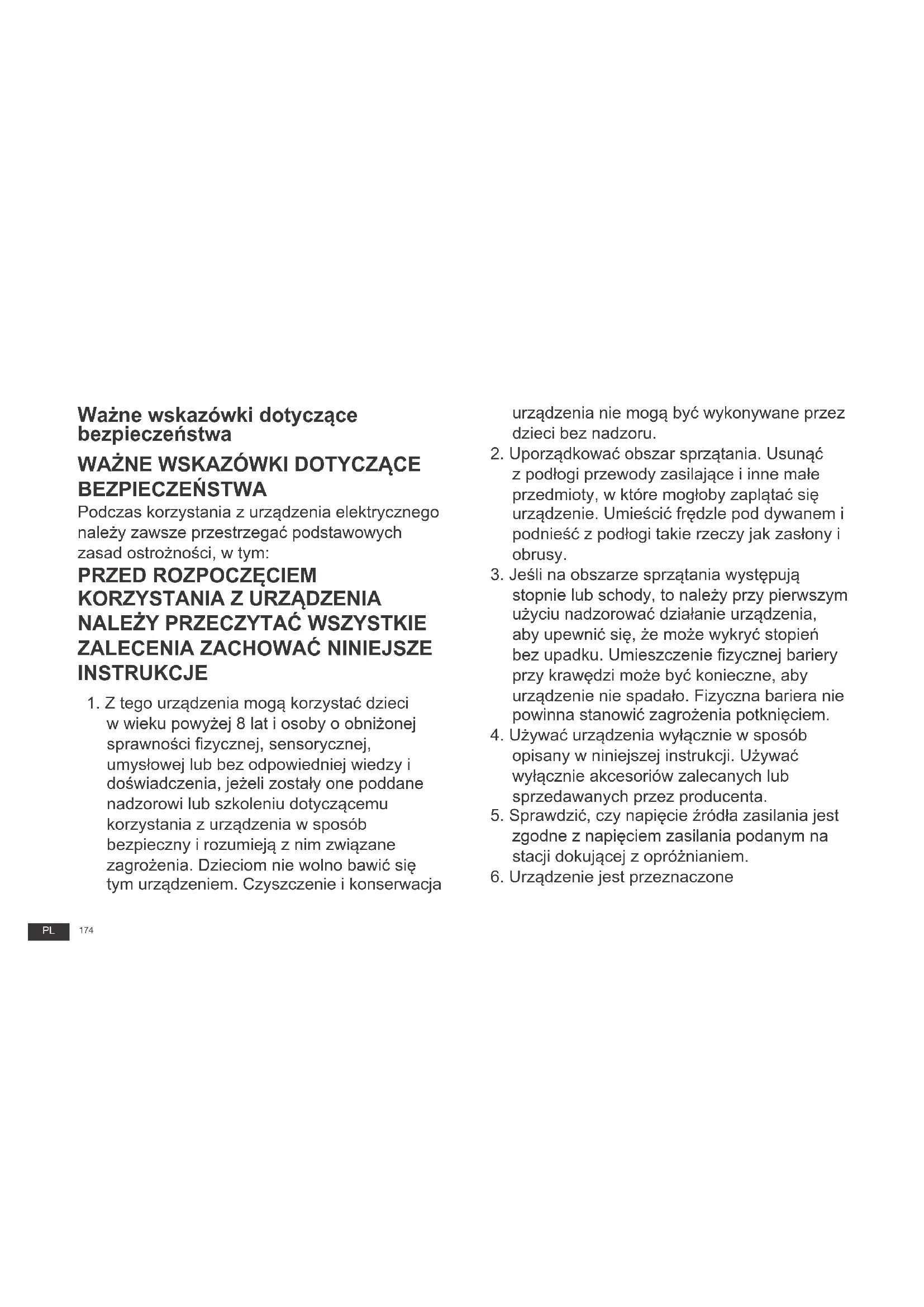 - Jesli na obszarze sprzątania wystepuju stopnie lub schody, to naleź wy przy pierwszym uzyciu nadzorowej dzialanie urzadzenia, aby upewnić sie, ze要去 wykryc stopién bez upadku. Umieszczenie fizycznej bariery przy krawędzi要去 być konieczne, aby urzadzenia nie spadalo. Fizyczna bariera nie powinna stanowic zagrożenia potknięciem.