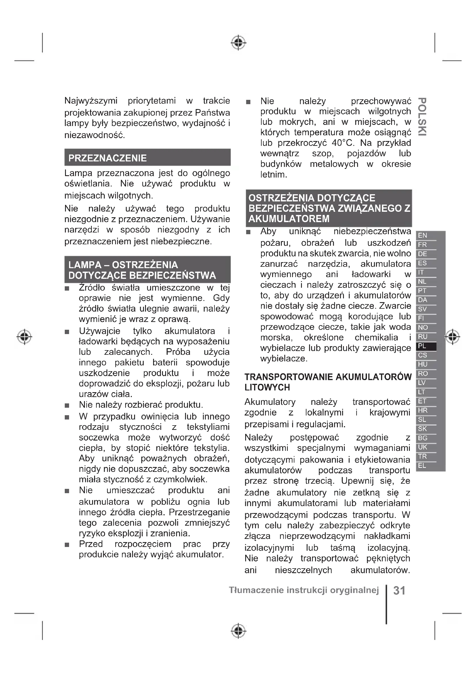 ■ Źródło światła umieszczone w tej oprawie nie jest wymienne. Gdy źródło światła ulegnie awarii, należy wymienić je wraz z oprawą. ■ Używajcie tylko akumulatora i ładowarki będących na wyposażeniu lub zalecanych. Próba użycia innego pakietu baterii spowoduje uszkodzenie produktu i może doprowadzić do eksplozji, pożaru lub urazów ciała. ■ Nie należy rozbierać produktu. ■ W przypadku owinięcia lub innego rodzaju styczności z tekstyliami soczewka może wytworzyć dość ciepła, by stopić niektóre tekstylia. Aby uniknąć poważnych obrażeń, nigdy nie dopuszczać, aby soczewka miała styczność z czymkolwiek. ■ Nie umieszczać produktu ani akumulatora w pobliżu ognia lub innego źródła ciepła. Przestrzeganie tego zalecenia pozwoli zmniejszyć ryzyko eksplozji i zranienia. ■ Przed rozpoczęciem prac przy produkcie należy wyjąć akumulator. ■ Nie należy przechowywać produktu w miejscach wilgotnych lub mokrych, ani w miejscach, w których temperatura może osiągnąć lub przekroczyć 40°C. Na przykład wewnątrz szop, pojazdów lub budynków metalowych w okresie letnim.
