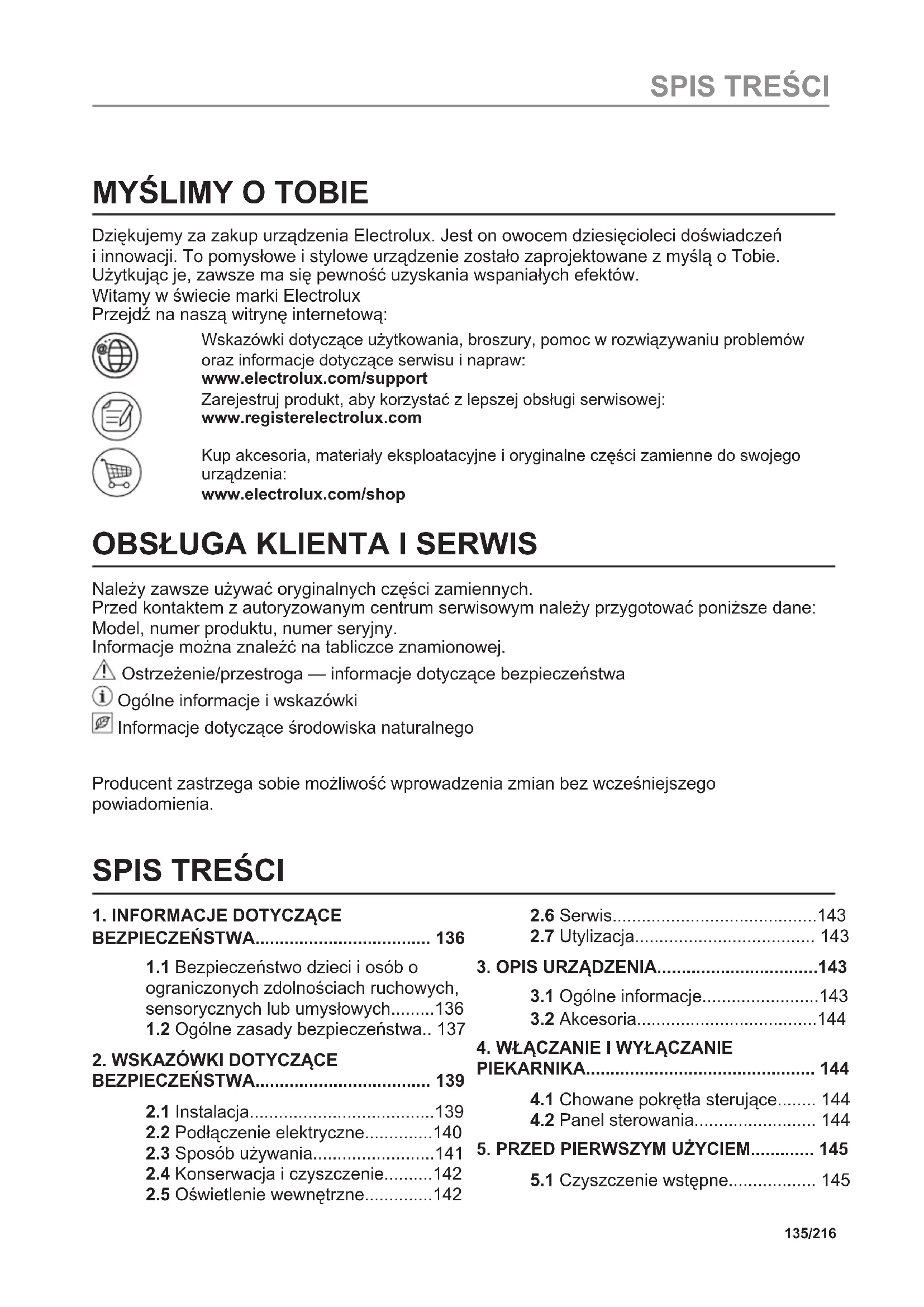 Dziękujemy za zakup urządzenia Electrolux. Jest on owocem dziesięcioleci doświadczeń i innowacji. To pomysłowe i stylowe urządzenie zostało zaprojektowane z myślą o Tobie. Użytkując je, zawsze ma się pewność uzyskania wspaniałych efektów. Witamy w świecie marki Electrolux Przejdź na naszą witrynę internetową: Wskazówki dotyczące użytkowania, broszury, pomoc w rozwiązywaniu problemów oraz informacje dotyczące serwisu i napraw: www.electrolux.com/support Zarejestruj produkt, aby korzystać z lepszej obsługi serwisowej: www.registerelectrolux.com Kup akcesoria, materiały eksploatacyjne i oryginalne części zamienne do swojego urządzenia: www.electrolux.com/shop