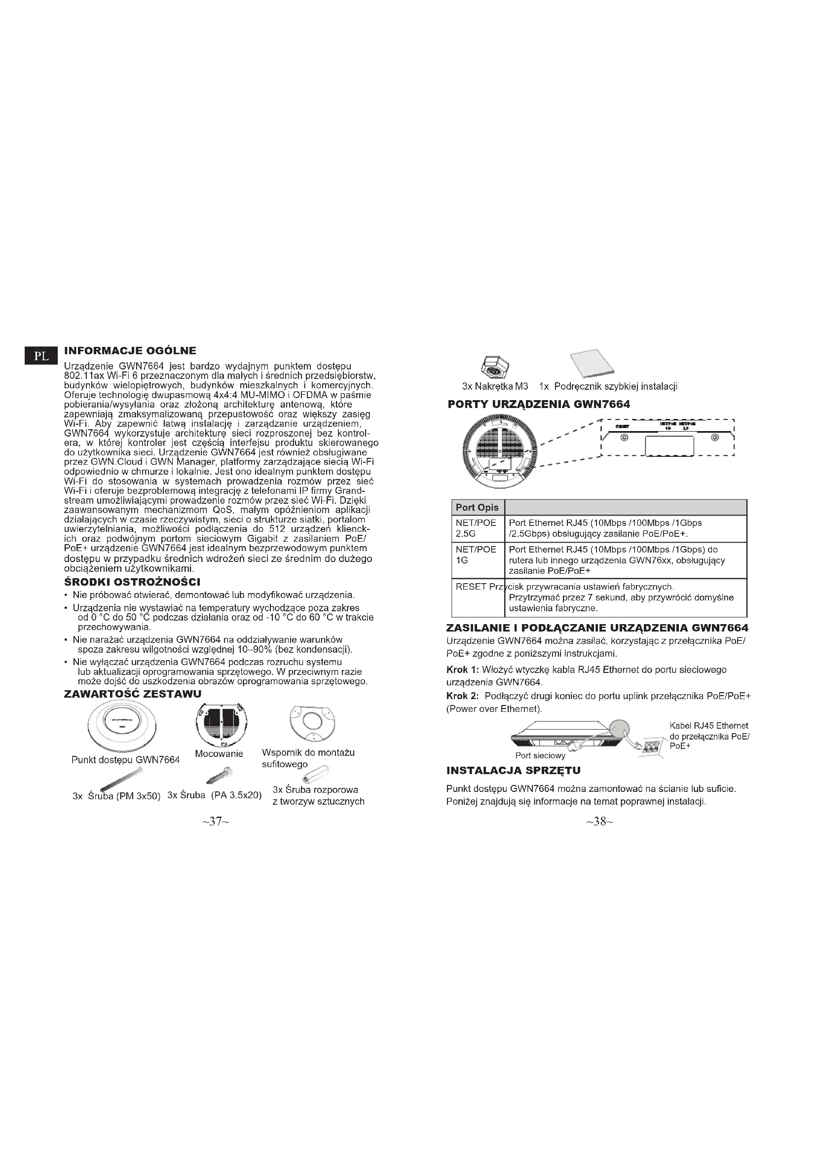 - Aby zarządzać GWN7664 przy wsparciu chmury prosimy o odwiedzenie strony: https://www.gwn.cloud Aby uzyskać szczegółową instrukcję, należy pobrać z: http://www.grandstream.com/our-products Warunki licencji GNU GPL użytej są nieodłączną częścią oprogramowania systemowego urządzenia i można uzyskać do nich dostęp za pośrednictwem sieciowego interfejsu użytkownika urządzenia, wybierając opcje my_device_ip/ gpl_license. Można do niej również uzyskać dostęp poprzez stronę: http://www. grandstream.com/legal/open-source-software Aby otrzymać płytę CD z informacjami dotyczącymi kodu źródłowego GPL, należy przesłać prośbę na piśmie na adres info@grandstream.com This device complies with part 15 of the FCC rules. Operation is subject to the following two conditions: (1) this device may not cause harmful interference, and (2) this device must accept any interference received, including interference that may cause undesired operation. CAN ICES-3(B)/NMB-3(B)IC: 11964A-GWN7664FCC ID: YZZGWN7664 Model: GWN7664 Input: 48V 0.5A PoE~43~ ~44~