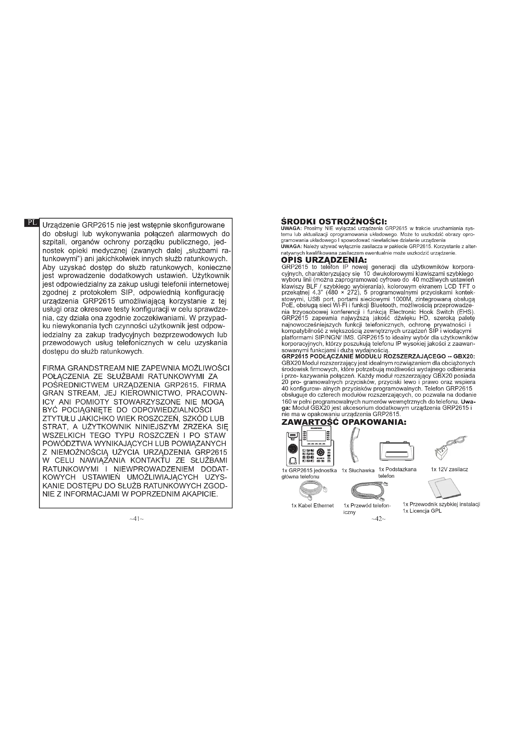internet) para consultar, se for necessário, as definições adicionais que podem ser necessárias para configurar o telefone.figure the phone. Congurar o GRP2615 utilizando o teclado: CONFIGURAÇÃO DO TELEFONE: Congurar o GRP2615 utilizando a interface web: Por favor, baixe o Manual do Usuário e verifique a seção FAQ para instruções mais detalhadas: http://www.grandstream.com/our-products Tecla de função Teclas de Navegação Mensagem Reter Transferir Headset Mudo Volume Viva-Voz Enviar/Chamar Teclado Padrão Teclas de Linha Tecla Menu/OK~41~ ~42~ Urządzenie GRP2615 nie jest wstępnie skonfigurowane do obsługi lub wykonywania połączeń alarmowych do szpitali, organów ochrony porządku publicznego, jed- nostek opieki medycznej (zwanych dalej „służbami ra- tunkowymi”) ani jakichkolwiek innych służb ratunkowych. Aby uzyskać dostęp do służb ratunkowych, konieczne jest wprowadzenie dodatkowych ustawień. Użytkownik jest odpowiedzialny za zakup usługi telefonii internetowej zgodnej z protokołem SIP, odpowiednią konfigurację urządzenia GRP2615 umożliwiającą korzystanie z tej usługi oraz okresowe testy konfiguracji w celu sprawdze- nia, czy działa ona zgodnie zoczekiwaniami. W przypad- ku niewykonania tych czynności użytkownik jest odpow- iedzialny za zakup tradycyjnych bezprzewodowych lub przewodowych usług telefonicznych w celu uzyskania dostępu do służb ratunkowych. FIRMA GRANDSTREAM NIE ZAPEWNIA MOŻLIWOŚCI POŁĄCZENIA ZE SŁUŻBAMI RATUNKOWYMI ZA