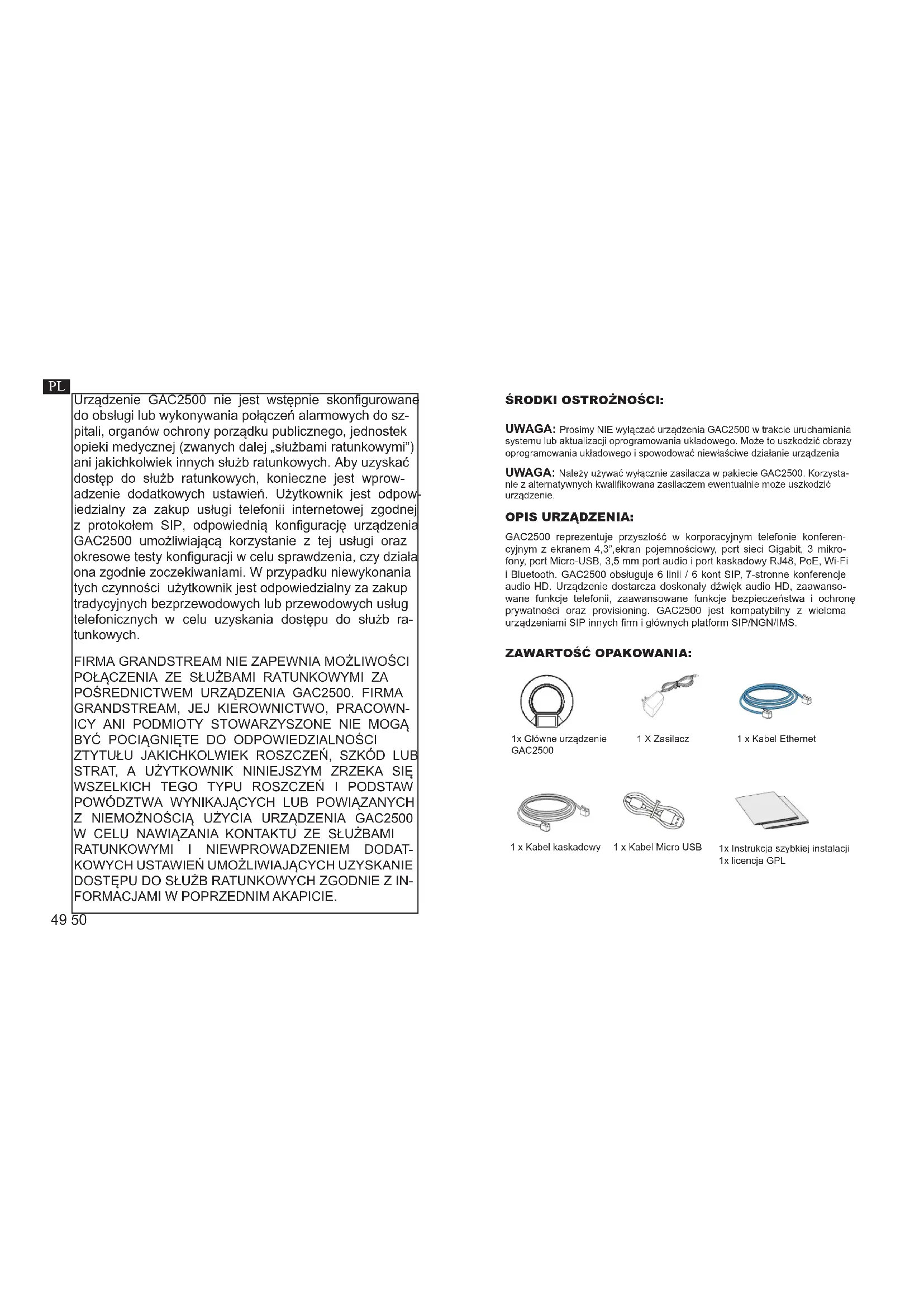 com seu ITSP (Internet Telephony Service Provider) para congurações adicionais que podem ser necessárias para congurar o telefone. CONFIGURAÇÃO DO DISPOSITIVO: Congurando o GAC2500 Usando Web Browser: Congurando o GAC2500 usando Touch Screen: Nota: Para o manual do usuário detalhado, faça o download a partir de: http://www.grandstream.com/support49 50 Urządzenie GAC2500 nie jest wstępnie skongurowane do obsługi lub wykonywania połączeń alarmowych do sz- pitali, organów ochrony porządku publicznego, jednostek opieki medycznej (zwanych dalej „służbami ratunkowymi”) ani jakichkolwiek innych służb ratunkowych. Aby uzyskać dostęp do służb ratunkowych, konieczne jest wprow- adzenie dodatkowych ustawień. Użytkownik jest odpow- iedzialny za zakup usługi telefonii internetowej zgodnej z protokołem SIP, odpowiednią kongurację urządzenia GAC2500 umożliwiającą korzystanie z tej usługi oraz okresowe testy konguracji w celu sprawdzenia, czy działa ona zgodnie zoczekiwaniami. W przypadku niewykonania tych czynności użytkownik jest odpowiedzialny za zakup tradycyjnych bezprzewodowych lub przewodowych usług telefonicznych w celu uzyskania dostępu do służb ra- tunkowych. FIRMA GRANDSTREAM NIE ZAPEWNIA MOŻLIWOŚCI POŁĄCZENIA ZE SŁUŻBAMI RATUNKOWYMI ZA