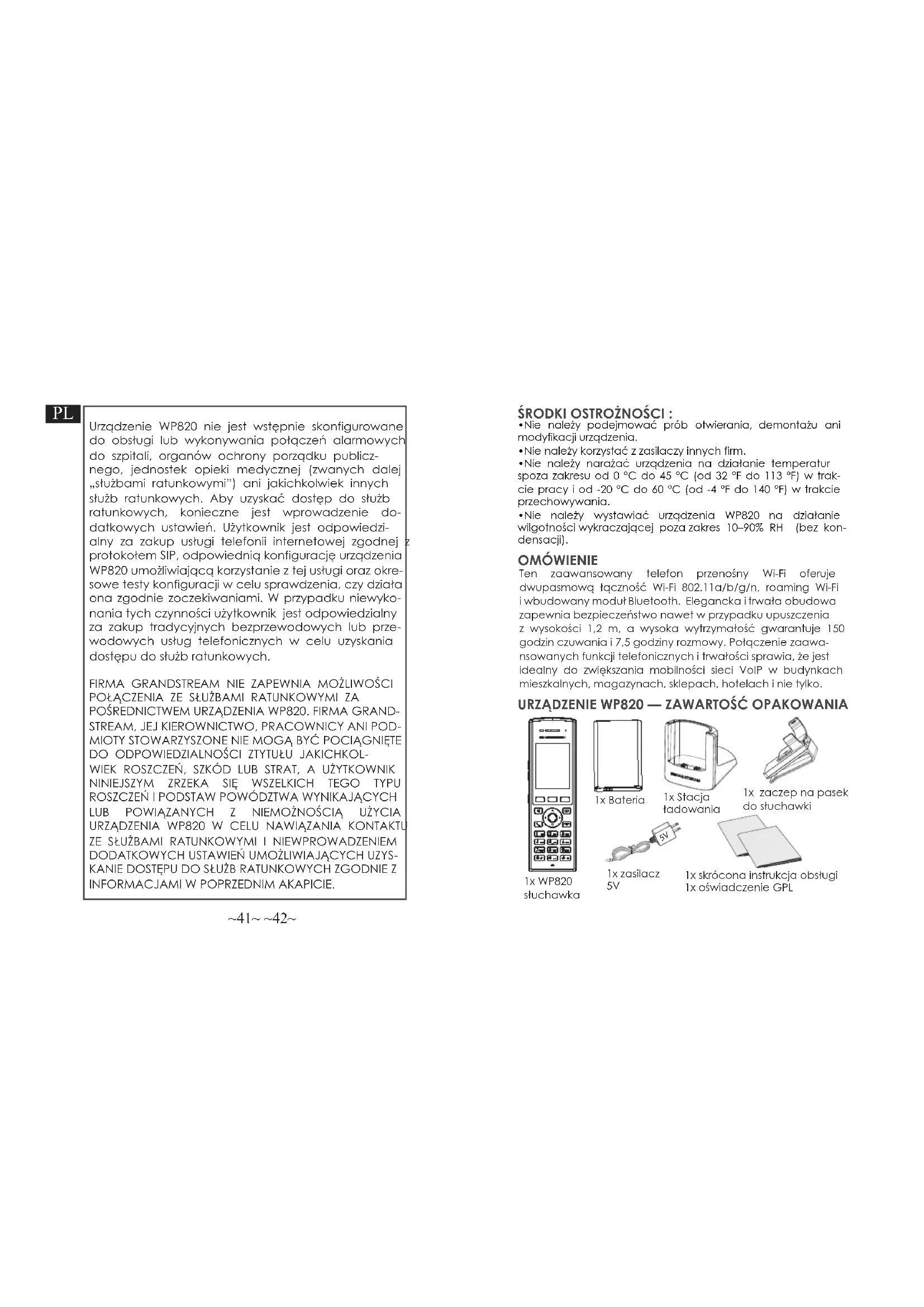“admin”; o nome de usuário padrão do usuário é “user” e a senha é “123. Consulte os documentos em linha e os FAQ para informação mais detalhada: http://www.grandstream.com/our-products~41~ ~42~ ŚRODKI OSTROŻNOŚCI : 1x Stacja ładowania Urządzenie WP820 nie jest wstępnie skonfigurowane do obsługi lub wykonywania połączeń alarmowych do szpitali, organów ochrony porządku publicz- nego, jednostek opieki medycznej (zwanych dalej „służbami ratunkowymi”) ani jakichkolwiek innych służb ratunkowych. Aby uzyskać dostęp do służb ratunkowych, konieczne jest wprowadzenie do- datkowych ustawień. Użytkownik jest odpowiedzi- alny za zakup usługi telefonii internetowej zgodnej z protokołem SIP, odpowiednią konfigurację urządzenia WP820 umożliwiającą korzystanie z tej usługi oraz okre- sowe testy konfiguracji w celu sprawdzenia, czy działa ona zgodnie zoczekiwaniami. W przypadku niewyko- nania tych czynności użytkownik jest odpowiedzialny za zakup tradycyjnych bezprzewodowych lub prze- wodowych usług telefonicznych w celu uzyskania dostępu do służb ratunkowych. FIRMA GRANDSTREAM NIE ZAPEWNIA MOŻLIWOŚCI POŁĄCZENIA ZE SŁUŻBAMI RATUNKOWYMI ZA POŚREDNICTWEM URZĄDZENIA WP820. FIRMA GRAND-