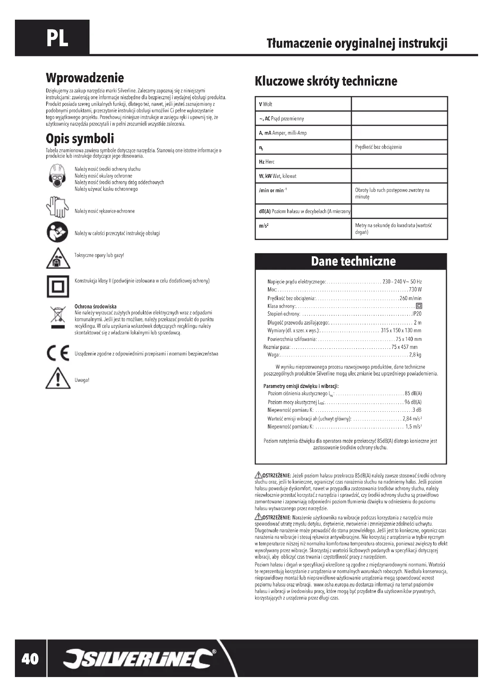 Opis symboli Tabelaznamionowazawierasymboledotyczącenarzędzia.Stanowiąoneistotneinformacjeoprodukcielubinstrukcjedotyczącejegostosowania.Należynosićśrodkiochronysłuchu Należynosićokularyochronne Należynosićśrodkiochronydrógoddechowych NależyużywaćkaskuochronnegoNależynosićrękawiceochronneNależywcałościprzeczytaćinstrukcjęobsługiToksyczneoparylubgazy!KonstrukcjaklasyII(podwójnieizolowanawceludodatkowejochrony)Ochrona środowiska Nienależywyrzucaćzużytychproduktówelektrycznychwrazzodpadamikomunalnymi.Jeślijesttomożliwe,należyprzekazaćproduktdopunkturecyklingu.Wceluuzyskaniawskazówekdotyczącychrecyklingunależyskontaktowaćsięzwładzamilokalnymilubsprzedawcą.UrządzeniezgodnezodpowiednimiprzepisamiinormamibezpieczeństwaUwaga! Wprowadzenie DziękujemyzazakupnarzędziamarkiSilverline.Zalecamyzapoznajsięzniniejszymiinstrukcjami:zawierająoneinformacjeniezbędnedlabezpiecznejiwydajnejobsługiproduktu.Produktposiadaszeregunikalnychfunkcji,dlategoteż,nawet,jeślijesteśzaznajomionyzpodobnymiproduktami,przeczytanieinstrukcjiobsługiumożliwiCipełnewykorzystanietegowyjątkowegoprojektu.Przechowujniniejszeinstrukcjewzasięgurękiiupewnijsię,żeużytkownicynarzędziaprzeczytaliiwpełnizrozumieliwszystkiezalecenia. Kluczowe skróty techniczne
