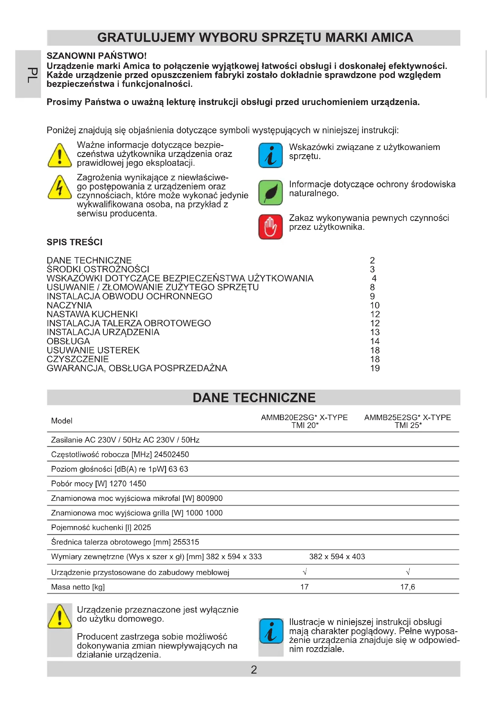 Ilustracje w niniejszej instrukcji obsługi mają charakter poglądowy. Pełne wyposa- żenie urządzenia znajduje się w odpowied- nim rozdziale. ModelAMMB20E2SG* X-TYPETMI 20*AMMB25E2SG* X-TYPETMI 25*Zasilanie AC 230V / 50Hz AC 230V / 50HzCzęstotliwość robocza [MHz] 2450 2450Poziom głośności [dB(A) re 1pW] 63 63Pobór mocy [W] 1270 1450Znamionowa moc wyjściowa mikrofal [W] 800 900Znamionowa moc wyjściowa grilla [W] 1000 1000Pojemność kuchenki [l] 20 25Średnica talerza obrotowego [mm] 255 315Wymiary zewnętrzne (Wys x szer x gł) [mm] 382 x 594 x 333 382 x 594 x 403Urządzenie przystosowane do zabudowy meblowej √ √Masa netto [kg] 17 17,6 DANE TECHNICZNE SPISTREŚCI DANE TECHNICZNE 2