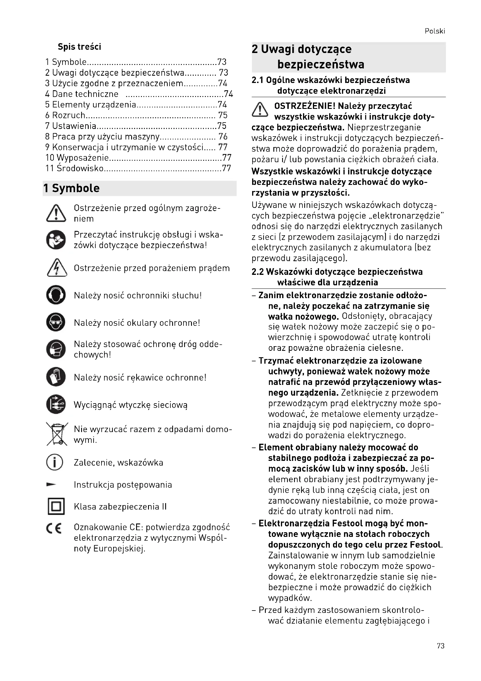 - 11 Środowisko 1 Symbole Ostrzeżenie przed ogólnym zagroże niem Przeczytać instrukcję obsługi i wska zówki dotyczące bezpieczeństwa! Ostrzeżenie przed porażeniem prądem Należy nosić ochronniki słuchu! Należy nosić okulary ochronne! Należy stosować ochronę dróg odde chowych! Należy nosić rękawice ochronne! Wyciągnąć wtyczkę sieciową Nie wyrzucać razem z odpadami domo wymi. Zalecenie, wskazówka Instrukcja postępowania Klasa zabezpieczenia II Oznakowanie CE: potwierdza zgodność elektronarzędzia z wytycznymi Wspól noty Europejskiej. 2 Uwagi dotyczące bezpieczeństwa p. 77