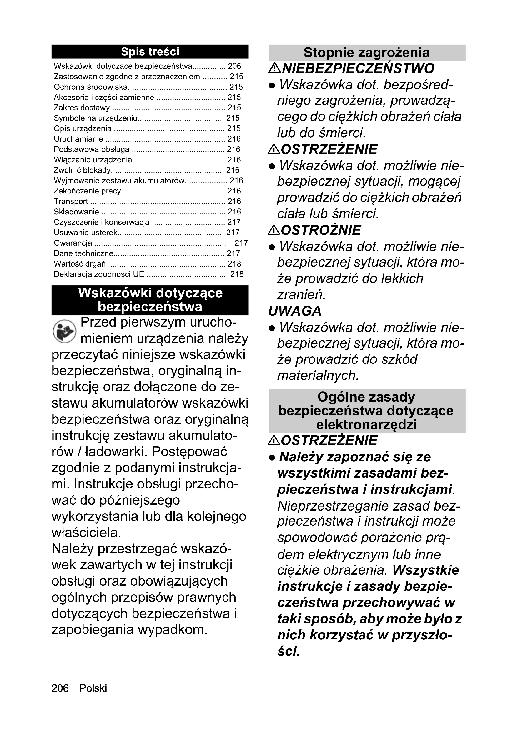 - spowodować porażenie prą- dem elektrycznym lub inne ciężkie obrażenia. Wszystkie instrukcje i zasady bezpie- czeństwa przechowywać w taki sposób, aby może było z nich korzystać w przyszło- ści. Wskazówki dotyczące bezpieczeństwa p. 206