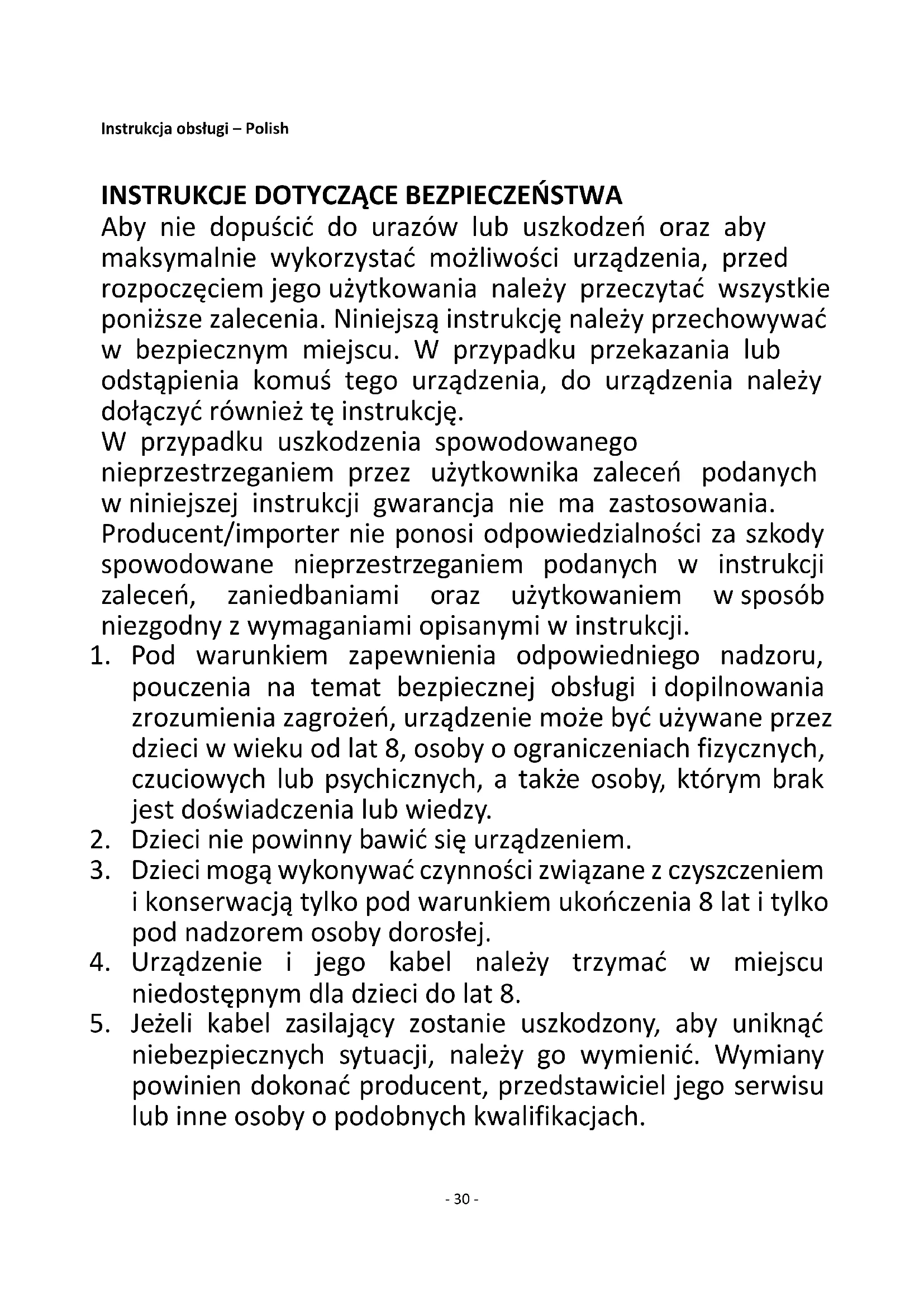 Aby nie dopuścić do urazów lub uszkodzeń oraz aby maksymalnie wykorzystać możliwości urządzenia, przed rozpoczęciem jego użytkowania należy przeczytać wszystkie poniższe zalecenia. Niniejszą instrukcję należy przechowywać w bezpiecznym miejscu. W przypadku przekazania lub odstąpienia komuś tego urządzenia, do urządzenia należy dołączyć również tę instrukcję. W przypadku uszkodzenia spowodowanego nieprzestrzeganiem przez użytkownika zaleceń podanych w niniejszej instrukcji gwarancja nie ma zastosowania. Producent/importer nie ponosi odpowiedzialności za szkody spowodowane nieprzestrzeganiem podanych w instrukcji zaleceń, zaniedbaniami oraz użytkowaniem w sposób niezgodny z wymaganiami opisanymi w instrukcji.