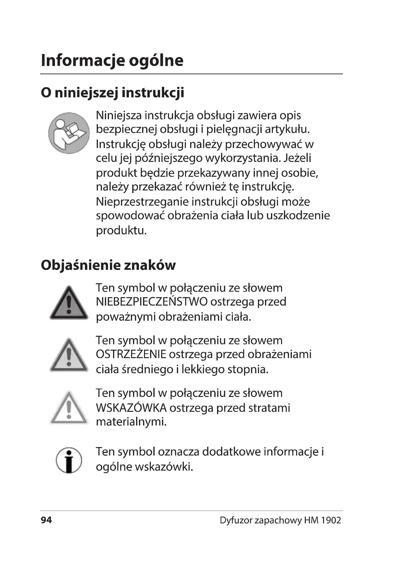 - Utylizacja 4 Dyfuzor zapachowy HM 1902 Informacje ogólne O niniejszej instrukcji Niniejsza instrukcja obsługi zawiera opis bezpiecznej obsługi i pielęgnacji artykułu. Instrukcję obsługi należy przechowywać w celu jej późniejszego wykorzystania. Jeżeli produkt będzie przekazywany innej osobie, należy przekazać również tę instrukcję. Nieprzestrzeganie instrukcji obsługi może spowodować obrażenia ciała lub uszkodzenie produktu. Objaśnienie znaków Ten symbol w połączeniu ze słowem NIEBEZPIECZEŃSTWO ostrzega przed poważnymi obrażeniami ciała. Ten symbol w połączeniu ze słowem OSTRZEŻENIE ostrzega przed obrażeniami ciała średniego i lekkiego stopnia. Ten symbol w połączeniu ze słowem WSKAZÓWKA ostrzega przed stratami materialnymi. Ten symbol oznacza dodatkowe informacje i ogólne wskazówki.95 Dyfuzor zapachowy HM 1902 Polski Użycie zgodne z przeznaczeniem Dyfuzor ten służy do poprawy jakości powietrza poprzez zwiększenie wilgotności za pomocą nebulizatora. Urządzenie pracuje w technologii ultradźwiękowej i wytwarza chłodną mgiełkę. Jest przeznaczone wyłącznie do użytku prywatnego w suchych pomieszczeniach. Nawilżacz powietrza nie może być używany jako inhalator. Bezpieczeństwo Ten produkt może być używany przez dzieci od 8roku życia oraz przez osoby z ograniczonymi zdolnościami zycznymi, sensorycznymi lub umysłowymi bądź takie, którym brakuje doświadczenia i wiedzy, tylko wtedy, gdy są nadzorowane lub przeszły przeszkolenie z zakresu bezpiecznego użytkowania produktu i rozumieją wynikające z tego niebezpieczeństwa. Przechowywać urządzenie i zasilacz z dala od dzieci poniżej 8roku życia. Dzieci nie mogą czyścić ani serwisować urządzenia, chyba że mają co najmniej 8lat i są nadzorowane.96 Dyfuzor zapachowy HM 1902 Dzieciom nie wolno bawić się urządzeniem. Przechowywać folie i opakowanie z dala od dzieci. Istnieje ryzyko uduszenia. Zwracać uwagę na to, aby torby opakowaniowej nie nakładano na głowę. Należy używać wyłącznie dostarczonego zasilacza i wymieniać go tylko na zasilacz tego samego rodzaju. Zasilacz wolno stosować wyłącznie w suchych pomieszczeniach, chroniąc go przed wilgocią. NIEBEZPIECZEŃSTWO spowodowane elektrycznością Zbiornik wody urządzenia jest wypełniony wodą. Jednakże samo urządzenie, jak również sam kabel zasilający i wtyczka adaptera sieciowego nie mogą mieć kontaktu z cieczami ani być zanurzone w wodzie lub innych płynach. Niebezpieczeństwo porażenia prądem! Przechowywać urządzenie w miejscu niedostępnym dla dzieci i nie zostawiać pracującego dyfuzora bez nadzoru. Nie użytkować urządzenia na wolnym powietrzu. Urządzenie należy podłączyć do prawidłowo zamontowanego gniazdka elektrycznego, które odpowiada napięciu podanemu w części „Dane techniczne”.97 Dyfuzor zapachowy HM 1902 Polski Upewnić się, że gniazdko jest łatwo dostępne, aby w razie potrzeby można było szybko odłączyć wtyczkę adaptera sieciowego. Nie używać urządzenia gdy: − urządzenie lub jego części są uszkodzone, − kabel zasilacza sieciowego lub wtyczka są uszkodzone, − po upadku urządzenia. Przed każdym użyciem należy całkowicie rozwinąć kabel zasilacza. Upewnić się, że kabel zasilacza nie został uszkodzony przez ostre krawędzie lub gorące przedmioty. Wyjąć wtyczkę adaptera sieciowego z gniazdka: − gdy urządzenie nie jest używane, − przed napełnieniem lub wylewaniem wody, − przed czyszczeniem lub odstawieniem urządzenia, − jeżeli podczas eksploatacji wystąpi widoczna usterka, − podczas burzy. − Zawsze ciągnąć za wtyczkę adaptera sieciowego, a nie za kabel. Nie modykować urządzenia ani kabla zasilającego. Przeprowadzać naprawy u specjalisty, niewłaściwa naprawa urządzenia może stanowić zagrożenie dla użytkownika. UWAGA - szkody majątkowe Chronić nawilżacz przed silnymi wstrząsami, wibracjami, bezpośrednim działaniem promieni słonecznych, brudem i wilgocią.98 Dyfuzor zapachowy HM 1902 Nie należy umieszczać nawilżacza na gorących powierzchniach i w bezpośrednim sąsiedztwie urządzeń elektrycznych oraz przedmiotów wrażliwych. Jeśli to możliwe, zbiornik napełniać wodą destylowaną, aby zapobiec tworzeniu się kamienia podczas używania normalnej wody z kranu. Do zbiornika można jednak wlewać również świeżą, zimną wodę pitną. W przypadku stosowania olejków eterycznych należy postępować zgodnie z instrukcjami producenta. Stosować wyłącznie aromaty rozpuszczalne w wodzie. Podczas pracy urządzenia w obszarze dyfuzora mogą pojawiać się osady lub nacieki. W razie potrzeby pod urządzenie należy umieścić odpowiednią podkładkę i trzymać z dala od urządzeń i części elektrycznych lub wrażliwych. Nie należy umieszczać dyfuzora bezpośrednio pod półką lub szafką ścienną. Zdrowe powietrze powinno mieć wilgotność względną od 40 do 60%. Przy częstym użytkowaniu wzrasta wilgotność, a wraz z nią ryzyko rozwoju pleśni. Używać tylko oryginalnych akcesoriów. Nie należy używać urządzenia, jeśli w zbiorniku nie ma lub jest bardzo mało płynu. Nie zakrywać urządzenia i nie używać go pod kocem lub poduszką. Szczeliny wentylacyjne wlotu powietrza na spodzie urządzenia powinny być wolne od kurzu i brudu. Nie kłaść urządzenia na miękkim dywanie. Wlot powietrza musi być zawsze wolny.99 Dyfuzor zapachowy HM 1902 Polski Na spodzie dyfuzora znajdują się nóżki urządzenia. Ponieważ powierzchnie składają się z różnych materiałów i są czyszczone różnymi środkami do pielęgnacji, nie można całkowicie wykluczyć, że w niektórych tych materiałach znajdą się składniki, które niszczą i rozmiękczają nóżki. W razie potrzeby pod urządzenie należy położyć podkładkę antypoślizgową. Do czyszczenia nie używać żadnych agresywnych środków czyszczących, środków do szorowania, twardych gąbek itp. Zap
