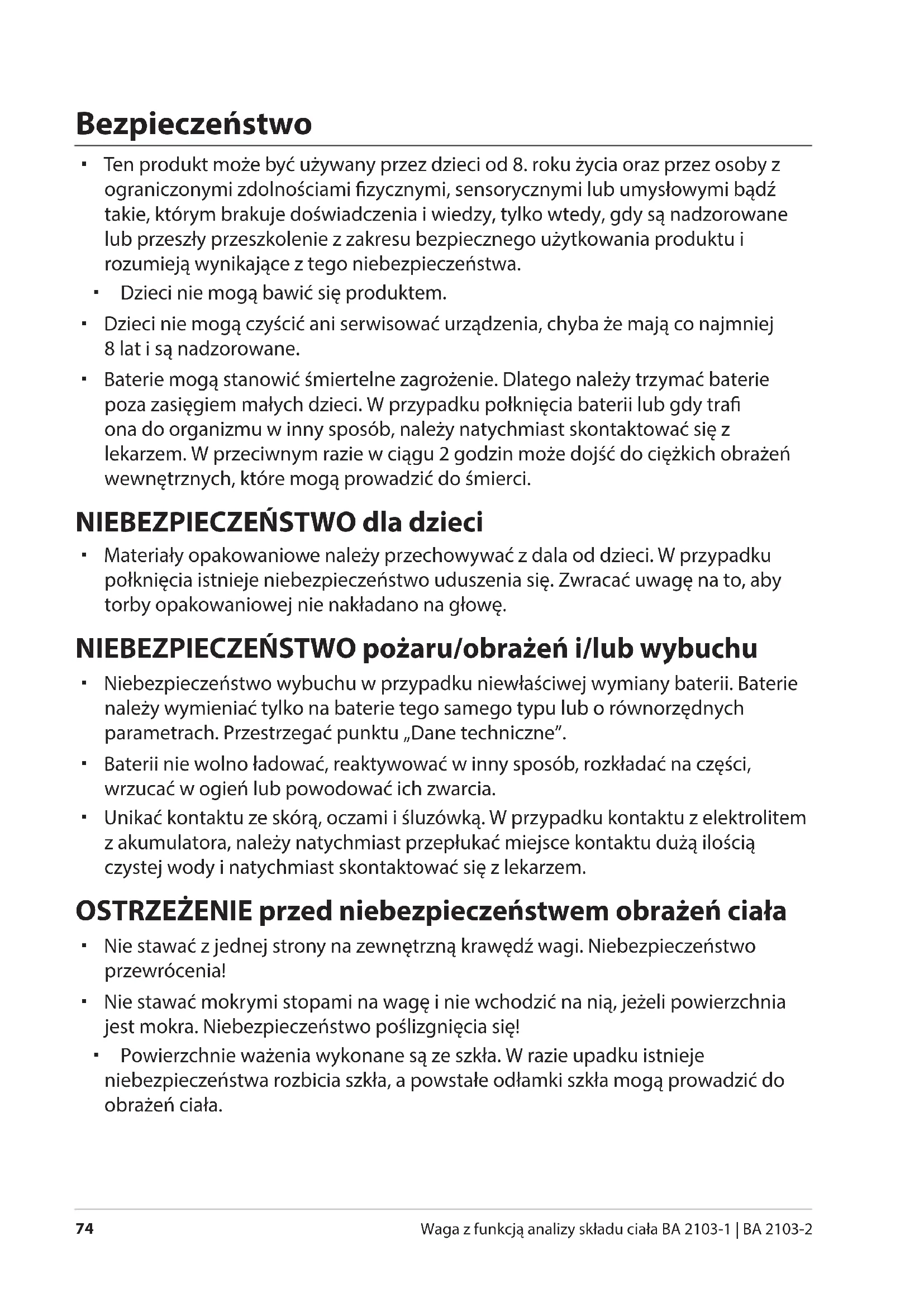 Waga z funkcją analizy składu ciała BA 2103-1 | BA 2103-2 Bezpieczeństwo Ten produkt może być używany przez dzieci od 8. roku życia oraz przez osoby z ograniczonymi zdolnościami zycznymi, sensorycznymi lub umysłowymi bądź takie, którym brakuje doświadczenia i wiedzy, tylko wtedy, gdy są nadzorowane lub przeszły przeszkolenie z zakresu bezpiecznego użytkowania produktu i rozumieją wynikające z tego niebezpieczeństwa. Dzieci nie mogą bawić się produktem. Dzieci nie mogą czyścić ani serwisować urządzenia, chyba że mają co najmniej 8lat i są nadzorowane. Baterie mogą stanowić śmiertelne zagrożenie. Dlatego należy trzymać baterie poza zasięgiem małych dzieci. W przypadku połknięcia baterii lub gdy tra ona do organizmu w inny sposób, należy natychmiast skontaktować się z lekarzem. W przeciwnym razie w ciągu 2 godzin może dojść do ciężkich obrażeń wewnętrznych, które mogą prowadzić do śmierci. NIEBEZPIECZEŃSTWO dla dzieci Materiały opakowaniowe należy przechowywać z dala od dzieci. W przypadku połknięcia istnieje niebezpieczeństwo uduszenia się. Zwracać uwagę na to, aby torby opakowaniowej nie nakładano na głowę. NIEBEZPIECZEŃSTWO pożaru/obrażeń i/lub wybuchu Niebezpieczeństwo wybuchu w przypadku niewłaściwej wymiany baterii. Baterie należy wymieniać tylko na baterie tego samego typu lub o równorzędnych parametrach. Przestrzegać punktu „Dane techniczne”. Baterii nie wolno ładować, reaktywować w inny sposób, rozkładać na części, wrzucać w ogień lub powodować ich zwarcia. Unikać kontaktu ze skórą, oczami i śluzówką. W przypadku kontaktu z elektrolitem z akumulatora, należy natychmiast przepłukać miejsce kontaktu dużą ilością czystej wody i natychmiast skontaktować się z lekarzem. OSTRZEŻENIE przed niebezpieczeństwem obrażeń ciała Nie stawać z jednej strony na zewnętrzną krawędź wagi. Niebezpieczeństwo przewrócenia! Nie stawać mokrymi stopami na wagę i nie wchodzić na nią, jeżeli powierzchnia jest mokra. Niebezpieczeństwo poślizgnięcia się! Powierzchnie ważenia wykonane są ze szkła. W razie upadku istnieje niebezpieczeństwa rozbicia szkła, a powstałe odłamki szkła mogą prowadzić do obrażeń ciała.Użycie zgodne z przeznaczeniem