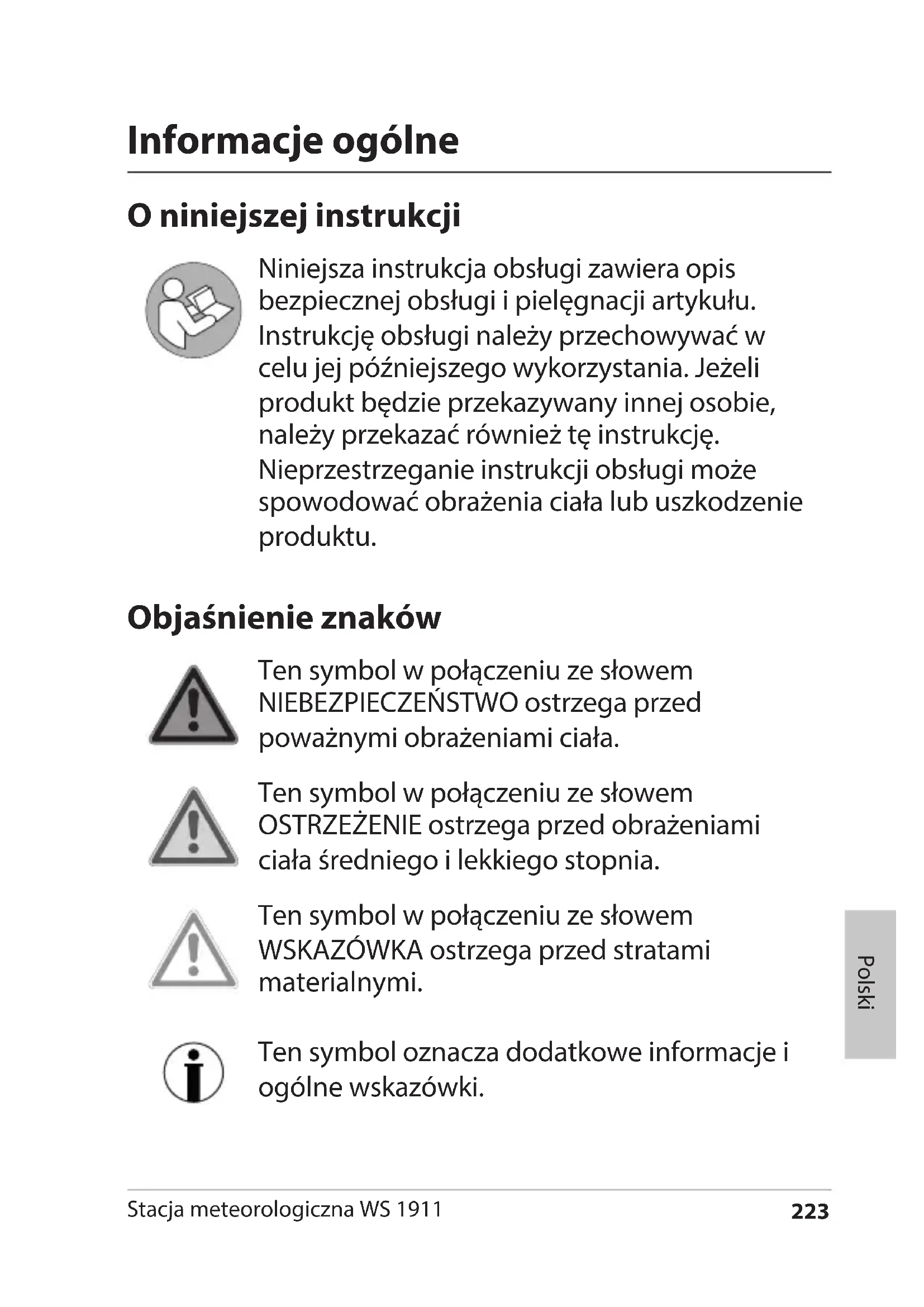 - Utylizacja 23 Stacja meteorologiczna WS 1911 Polski Informacje ogólne O niniejszej instrukcji Niniejsza instrukcja obsługi zawiera opis bezpiecznej obsługi i pielęgnacji artykułu. Instrukcję obsługi należy przechowywać w celu jej późniejszego wykorzystania. Jeżeli produkt będzie przekazywany innej osobie, należy przekazać również tę instrukcję. Nieprzestrzeganie instrukcji obsługi może spowodować obrażenia ciała lub uszkodzenie produktu. Objaśnienie znaków Ten symbol w połączeniu ze słowem NIEBEZPIECZEŃSTWO ostrzega przed poważnymi obrażeniami ciała. Ten symbol w połączeniu ze słowem OSTRZEŻENIE ostrzega przed obrażeniami ciała średniego i lekkiego stopnia. Ten symbol w połączeniu ze słowem WSKAZÓWKA ostrzega przed stratami materialnymi. Ten symbol oznacza dodatkowe informacje i ogólne wskazówki.224 Stacja meteorologiczna WS 1911 Użycie zgodne z przeznaczeniem Stacja pogodowa – składająca się ze stacji bazowej i radiowego czujnika zewnętrznego – wyświetla różne dane pogodowe z pobliskiego otoczenia. Na podstawie zmierzonych danych pogodowych stacja pogodowa ustala prognozę pogody. Stacja pogodowa wskazuje poza tym datę i godzinę, a dodatkowo posiada funkcję budzenia. Stacja pogodowa nie jest jednak przeznaczona do prognozowania pogody czy informacji o pogodzie do celów komercyjnych. Bezpieczeństwo To urządzenie może być używane przez dzieci w wieku do lat 8 oraz przez osoby z ograniczonymi zdolnościami zycznymi, sensorycznymi lub mentalnymi bądź którym brakuje doświadczenia i/lub wiedzy tylko wtedy, gdy są nadzorowane lub przeszły przeszkolenie z zakresu bezpiecznego użytkowania urządzenia i zrozumiały wynikające z tego niebezpieczeństwa. Urządzenie oraz zasilacz powinny znajdować się z dala od dzieci w wieku poniżej 8 lat.225 Stacja meteorologiczna WS 1911 Polski Dzieci nie mogą czyścić ani serwisować urządzenia, chyba że mają 8 lat lub więcej i są nadzorowane. Baterie mogą stanowić śmiertelne zagrożenie. Dlatego należy trzymać baterię poza zasięgiem małych dzieci. Jeśli bateria zostanie połknięta lub w inny sposób przedostanie się do ciała, należy natychmiast wezwać pomoc medyczną. W przeciwnym razie w ciągu 2godzin może dojść do ciężkich obrażeń wewnętrznych, które mogą prowadzić do śmierci. Dzieci muszą być pod stałym nadzorem, aby zapewnić, że nie będą bawiły się urządzeniem. Radiowej stacji pogodowej ani zasilacza nie wolno zanurzać w wodzie ani innych płynach. Niebezpieczeństwo porażenia prądem! Dlatego właśnie podstawy radiowej stacji pogodowej nie wolno również używać w pobliżu źródeł wilgoci, jak np. zlewu. Należy używać wyłącznie dostarczonego zasilacza i wymieniać go tylko na zasilacz tego samego rodzaju. Zasilacz wolno stosować wyłącznie w suchych pomieszczeniach, chroniąc go przed wilgocią.226 Stacja meteorologiczna WS 1911 Niebezpieczeństwodla dzieci Dzieci należy trzymać również z dala od opakowania i małych elementów znajdujących się w zakresie dostawy. Połknięcie grozi uduszeniem. Niebezpieczeństwo spowodowane elektrycznością Urządzenie należy podłączyć do prawidłowo zamontowanego gniazdka elektrycznego, które odpowiada napięciu podanemu w części „Dane techniczne”. Aby zapewnić możliwość szybkiego wyjęcia zasilacza w razie potrzeby, gniazdo powinno być łatwo dostępne. W przypadku uszkodzenia zasilacza lub kabla zasilającego nie wolno używać radiowej stacji pogodowej. Nie wolno zasłaniać zasilacza sieciowego zasłonami, gazetami itd. oraz należy zapewnić dostateczną wentylację. Zasilacz sieciowy może się rozgrzać. Przed podłączeniem należy całkowicie odwinąć kabel zasilacza sieciowego. Zwrócić przy tym uwagę, aby kabel nie został uszkodzony przez ostre krawędzie lub gorące przedmioty. Zasilacz sieciowy należy wyciągać z gniazdka: − przed czyszczeniem radiowej stacji pogodowej, − kiedy podczas obsługi dojdzie do oczywistej usterki, podczas burzy. − Zawsze należy przy tym ciągnąć za wtyczkę, a nie za kabel.227 Stacja meteorologiczna WS 1911 Polski Nie modykować produktu ani kabla przyłączeniowego. Naprawy zlecać tylko specjalistycznym zakładom, ponieważ niewłaściwie naprawiane urządzenia stanowią zagrożenie dla użytkownika. Nie wolno wymieniać kabla zasilacza sieciowego. W przypadku uszkodzenia kabla lub zasilacza sieciowego należy go zutylizować i zastąpić zasilaczem sieciowym tego samego typu. Niebezpieczeństwo obrażeń ciała Uwaga: Zagrożenie wybuchem w przypadku nieprawidłowego obchodzenia się z bateriami. Baterii nie wolno ładować, reaktywować w inny sposób, rozkładać na części, wrzucać w ogień lub powodować ich zwarcia. Należy unikać kontaktu płynu baterii ze skórą, oczami czy śluzówką. W przypadku takiego kontaktu dane miejsca należy spłukać obcie czystą wodą i natychmiast udać się do lekarza. Informacja o szkodach rzeczowych Stację bazową i czujnik zewnętrzny należy chronić przed kurzem, uderzeniami, skrajnymi temperaturami oraz bezpośrednim nasłonecznieniem. Stację bazową należy również chronić przed wilgocią. Należy ją umieszczać wyłącznie w suchym, zamkniętym pomieszczeniu. Czujnik zewnętrzny jest zabezpieczony przed wilgocią, musi być jednak chroniony przed bezpośrednim zawilgoceniem, np. podczas deszczu.228 Stacja meteorologiczna WS 1911 Wyjąć baterie ze stacji bazowej i z czujnika zewnętrznego, jeżeli są zużyte lub jeżeli stacja pogodowa nie będzie używana przez dłuższy czas. W ten sposób unika się uszkodzeń, jakie mogą powstać na skutek wycieku. Nie narażać baterii na oddziaływanie skrajnych warunków np. poprzez składowanie ich na grzejnikach lub bezpośrednio w miejscach nasłonecznionych. Podwyższone niebezpieczeństwo wycieku! W razie potrzeby przed włożeniem należy wyczyścić styki baterii i urządzenia. Zawsze wymieniać je