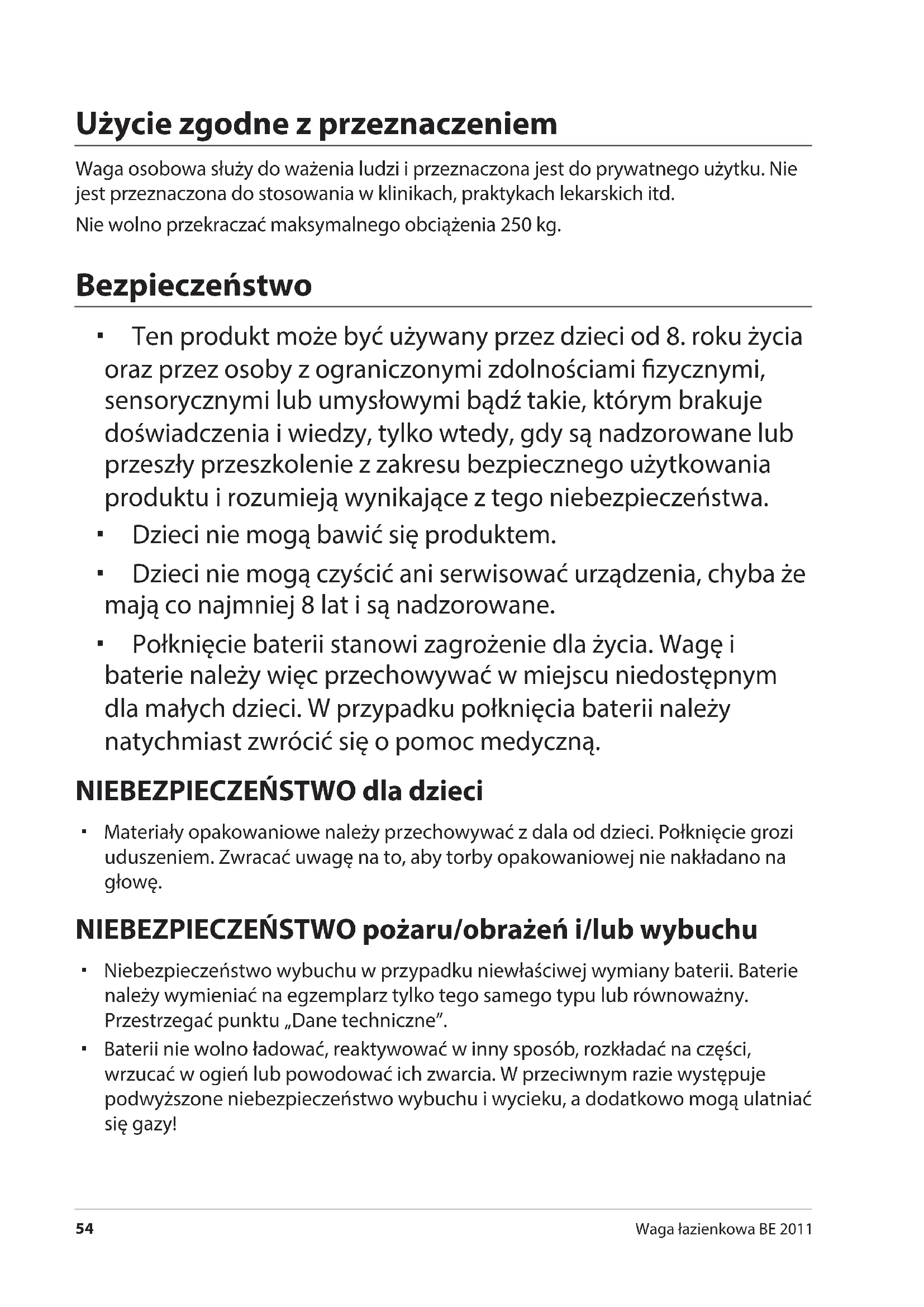 Waga łazienkowa BE 2011 Użycie zgodne z przeznaczeniem Waga osobowa służy do ważenia ludzi i przeznaczona jest do prywatnego użytku. Nie jest przeznaczona do stosowania w klinikach, praktykach lekarskich itd. Nie wolno przekraczać maksymalnego obciążenia 250 kg. Bezpieczeństwo Ten produkt może być używany przez dzieci od 8. roku życia oraz przez osoby z ograniczonymi zdolnościami zycznymi, sensorycznymi lub umysłowymi bądź takie, którym brakuje doświadczenia i wiedzy, tylko wtedy, gdy są nadzorowane lub przeszły przeszkolenie z zakresu bezpiecznego użytkowania produktu i rozumieją wynikające z tego niebezpieczeństwa. Dzieci nie mogą bawić się produktem. Dzieci nie mogą czyścić ani serwisować urządzenia, chyba że mają co najmniej 8lat i są nadzorowane. Połknięcie baterii stanowi zagrożenie dla życia. Wagę i baterie należy więc przechowywać w miejscu niedostępnym dla małych dzieci. W przypadku połknięcia baterii należy natychmiast zwrócić się o pomoc medyczną. NIEBEZPIECZEŃSTWO dla dzieci Materiały opakowaniowe należy przechowywać z dala od dzieci. Połknięcie grozi uduszeniem. Zwracać uwagę na to, aby torby opakowaniowej nie nakładano na głowę. NIEBEZPIECZEŃSTWO pożaru/obrażeń i/lub wybuchu Niebezpieczeństwo wybuchu w przypadku niewłaściwej wymiany baterii. Baterie należy wymieniać na egzemplarz tylko tego samego typu lub równoważny. Przestrzegać punktu „Dane techniczne”. Baterii nie wolno ładować, reaktywować w inny sposób, rozkładać na części, wrzucać w ogień lub powodować ich zwarcia. W przeciwnym razie występuje podwyższone niebezpieczeństwo wybuchu i wycieku, a dodatkowo mogą ulatniać się gazy!Bezpieczeństwo