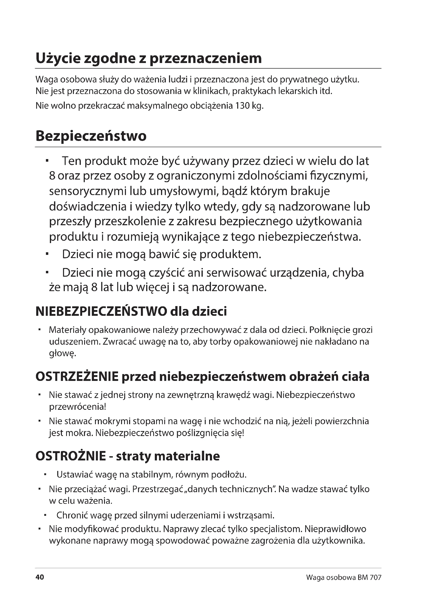 Waga osobowa BM 707 Użycie zgodne z przeznaczeniem Waga osobowa służy do ważenia ludzi i przeznaczona jest do prywatnego użytku. Niejest przeznaczona do stosowania w klinikach, praktykach lekarskich itd. Nie wolno przekraczać maksymalnego obciążenia 130 kg. Bezpieczeństwo Ten produkt może być używany przez dzieci w wielu do lat 8oraz przez osoby z ograniczonymi zdolnościami zycznymi, sensorycznymi lub umysłowymi, bądź którym brakuje doświadczenia i wiedzy tylko wtedy, gdy są nadzorowane lub przeszły przeszkolenie z zakresu bezpiecznego użytkowania produktu i rozumieją wynikające z tego niebezpieczeństwa. Dzieci nie mogą bawić się produktem. Dzieci nie mogą czyścić ani serwisować urządzenia, chyba