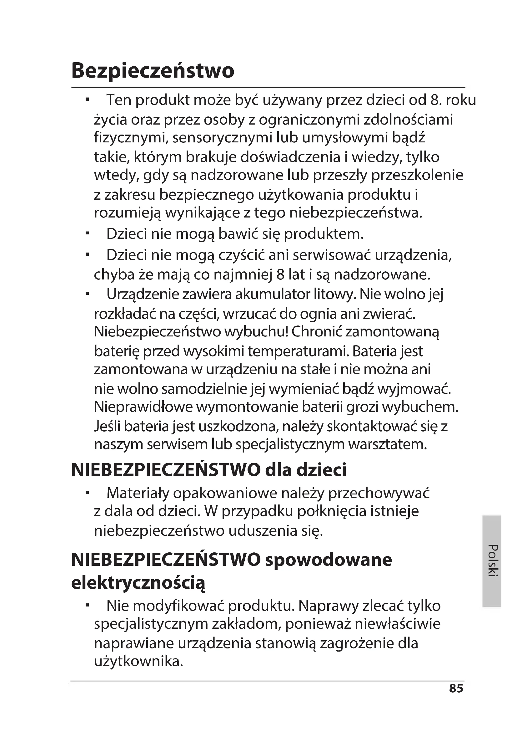 - Utylizacja Polski Bezpieczeństwo Ten produkt może być używany przez dzieci od 8. roku życia oraz przez osoby z ograniczonymi zdolnościami fizycznymi, sensorycznymi lub umysłowymi bądź takie, którym brakuje doświadczenia i wiedzy, tylko wtedy, gdy są nadzorowane lub przeszły przeszkolenie z zakresu bezpiecznego użytkowania produktu i rozumieją wynikające z tego niebezpieczeństwa. Dzieci nie mogą bawić się produktem. Dzieci nie mogą czyścić ani serwisować urządzenia, chyba że mają co najmniej 8lat i są nadzorowane. Urządzenie zawiera akumulator litowy. Nie wolno jej rozkładać na części, wrzucać do ognia ani zwierać. Niebezpieczeństwo wybuchu! Chronić zamontowaną baterię przed wysokimi temperaturami. Bateria jest zamontowana w urządzeniu na stałe i nie można ani nie wolno samodzielnie jej wymieniać bądź wyjmować. Nieprawidłowe wymontowanie baterii grozi wybuchem. Jeśli bateria jest uszkodzona, należy skontaktować się z naszym serwisem lub specjalistycznym warsztatem. NIEBEZPIECZEŃSTWO dla dzieci Materiały opakowaniowe należy przechowywać z dala od dzieci. W przypadku połknięcia istnieje niebezpieczeństwo uduszenia się. NIEBEZPIECZEŃSTWO spowodowane elektrycznością Nie modyfikować produktu. Naprawy zlecać tylko specjalistycznym zakładom, ponieważ niewłaściwie naprawiane urządzenia stanowią zagrożenie dla użytkownika.86 Nie otwierać obudowy ani nie wkładać żadnych przedmiotów do otworów obudowy. OSTROŻNIE — straty materialne Nie zanurzać wagi w wodzie ani w innych płynach. Ustawiać wagę na stabilnym, równym podłożu. Nie przeciążać wagi. Przestrzegać punktu „Danetechniczne”. Na wagę należy kłaść wyłącznie przedmioty do ważenia. Chronić wagę przed silnymi uderzeniami i wstrząsami. Nie modyfikować produktu. Naprawy zlecać tylko specjalistom. Nieprawidłowo wykonane naprawy mogą spowodować poważne zagrożenia dla użytkownika. Nie ustawiać wagi w pobliżu urządzeń, które mogą emitować promieniowanie elektromagnetyczne, np. telefonów komórkowych, urządzeń radiowych itp. Może to spowodować nieprawidłowe wskazania na wyświetlaczu lub zakłócenia działania. Nie układać ani nie ustawiać przedmiotów na wadze, jeżeli jest ona przechowywana np. w szafie. Czuła elektronika pomiarów w wadze może ulec uszkodzeniu z powodu ciężkich przedmiotów. Na spodzie wagi znajdują się nóżki. Ponieważ powierzchnie składają się z różnych materiałów i są czyszczone różnymi środkami do pielęgnacji, nie można całkowicie wykluczyć, że w niektórych tych materiałach znajdą się składniki, które niszczą i rozmiękczają nóżki. W razie potrzeby pod wagę należy położyć podkładkę antypoślizgową.87 Polski Użycie zgodne z przeznaczeniem Waga jest przeznaczona do ważenia artykułów spożywczych i przedmiotów w prywatnym gospodarstwie domowym i została zaprojektowana do najczęściej występujących tam ilości. Nie wolno przy tym przekraczać maksymalnego obciążenia 5kg. Waga nie jest przeznaczona do wykorzystania przemysłowego, np. w piekarniach, restauracjach itd. Wskazówka dla miłośników kawy: Ta waga jest również odpowiednia jako waga do kawy ztimerem skapywania. Zakres dostawy Waga kuchenna Kabel ładujący USB Instrukcja obsługi88 W skrócie p. 9685