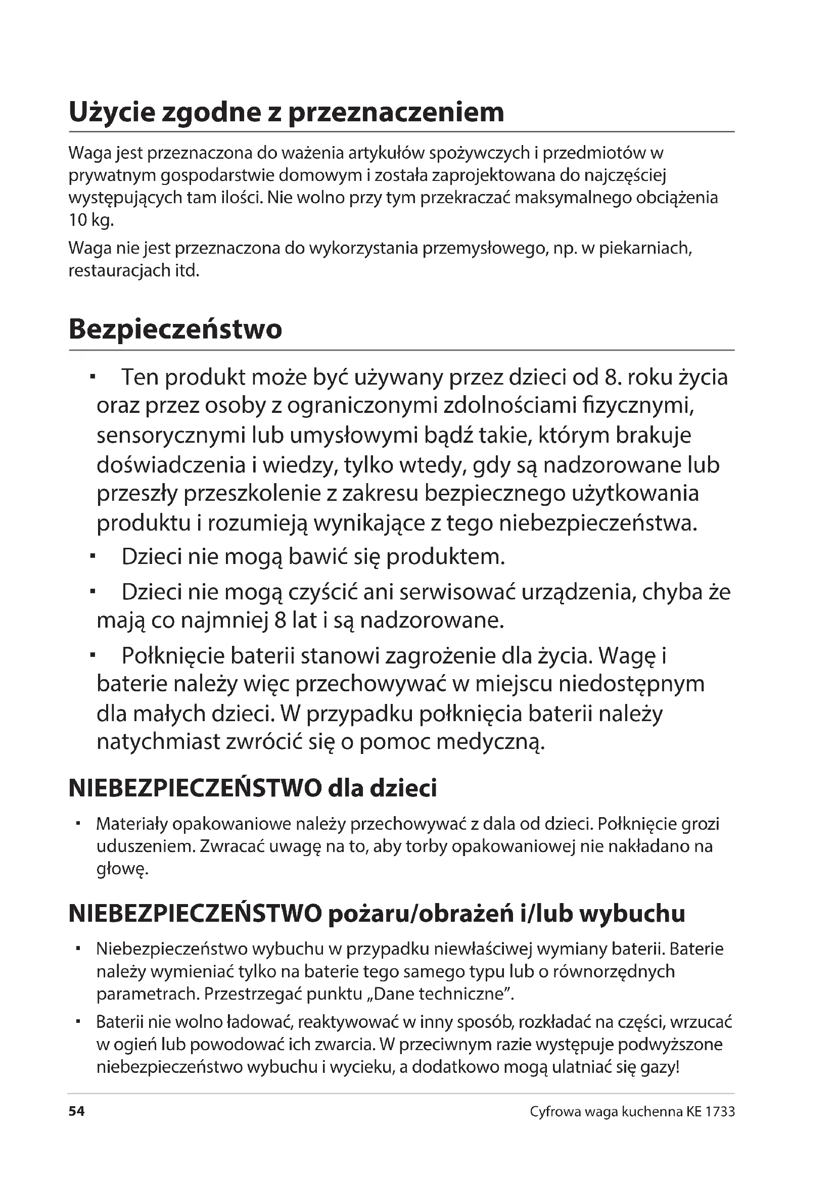 Cyfrowa waga kuchenna KE 1733 Użycie zgodne z przeznaczeniem Waga jest przeznaczona do ważenia artykułów spożywczych i przedmiotów w prywatnym gospodarstwie domowym i została zaprojektowana do najczęściej występujących tam ilości. Nie wolno przy tym przekraczać maksymalnego obciążenia 10kg. Waga nie jest przeznaczona do wykorzystania przemysłowego, np. w piekarniach, restauracjach itd. Bezpieczeństwo Ten produkt może być używany przez dzieci od 8. roku życia oraz przez osoby z ograniczonymi zdolnościami zycznymi, sensorycznymi lub umysłowymi bądź takie, którym brakuje doświadczenia i wiedzy, tylko wtedy, gdy są nadzorowane lub przeszły przeszkolenie z zakresu bezpiecznego użytkowania produktu i rozumieją wynikające z tego niebezpieczeństwa. Dzieci nie mogą bawić się produktem. Dzieci nie mogą czyścić ani serwisować urządzenia, chyba że mają co najmniej 8 lat i są nadzorowane. Połknięcie baterii stanowi zagrożenie dla życia. Wagę i baterie należy więc przechowywać w miejscu niedostępnym dla małych dzieci. W przypadku połknięcia baterii należy natychmiast zwrócić się o pomoc medyczną. NIEBEZPIECZEŃSTWO dla dzieci Materiały opakowaniowe należy przechowywać z dala od dzieci. Połknięcie grozi uduszeniem. Zwracać uwagę na to, aby torby opakowaniowej nie nakładano na głowę. NIEBEZPIECZEŃSTWO pożaru/obrażeń i/lub wybuchu Niebezpieczeństwo wybuchu w przypadku niewłaściwej wymiany baterii. Baterie należy wymieniać tylko na baterie tego samego typu lub o równorzędnych parametrach. Przestrzegać punktu „Dane techniczne”. Baterii nie wolno ładować, reaktywować w inny sposób, rozkładać na części, wrzucać w ogień lub powodować ich zwarcia. W przeciwnym razie występuje podwyższone niebezpieczeństwo wybuchu i wycieku, a dodatkowo mogą ulatniać się gazy!Bezpieczeństwo