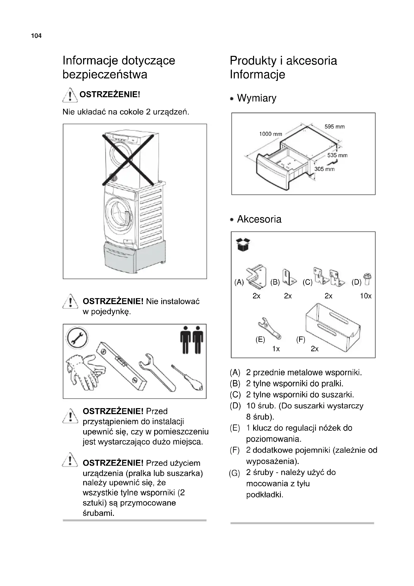 OSTRZEŻENIE! Przed przystąpieniem do instalacji upewnić się, czy w pomieszczeniu jest wystarczająco dużo miejsca. OSTRZEŻENIE! Przed użyciem urządzenia (pralka lub suszarka) należy upewnić się, że wszystkie tylne wsporniki (2 sztuki) są przymocowane śrubami.