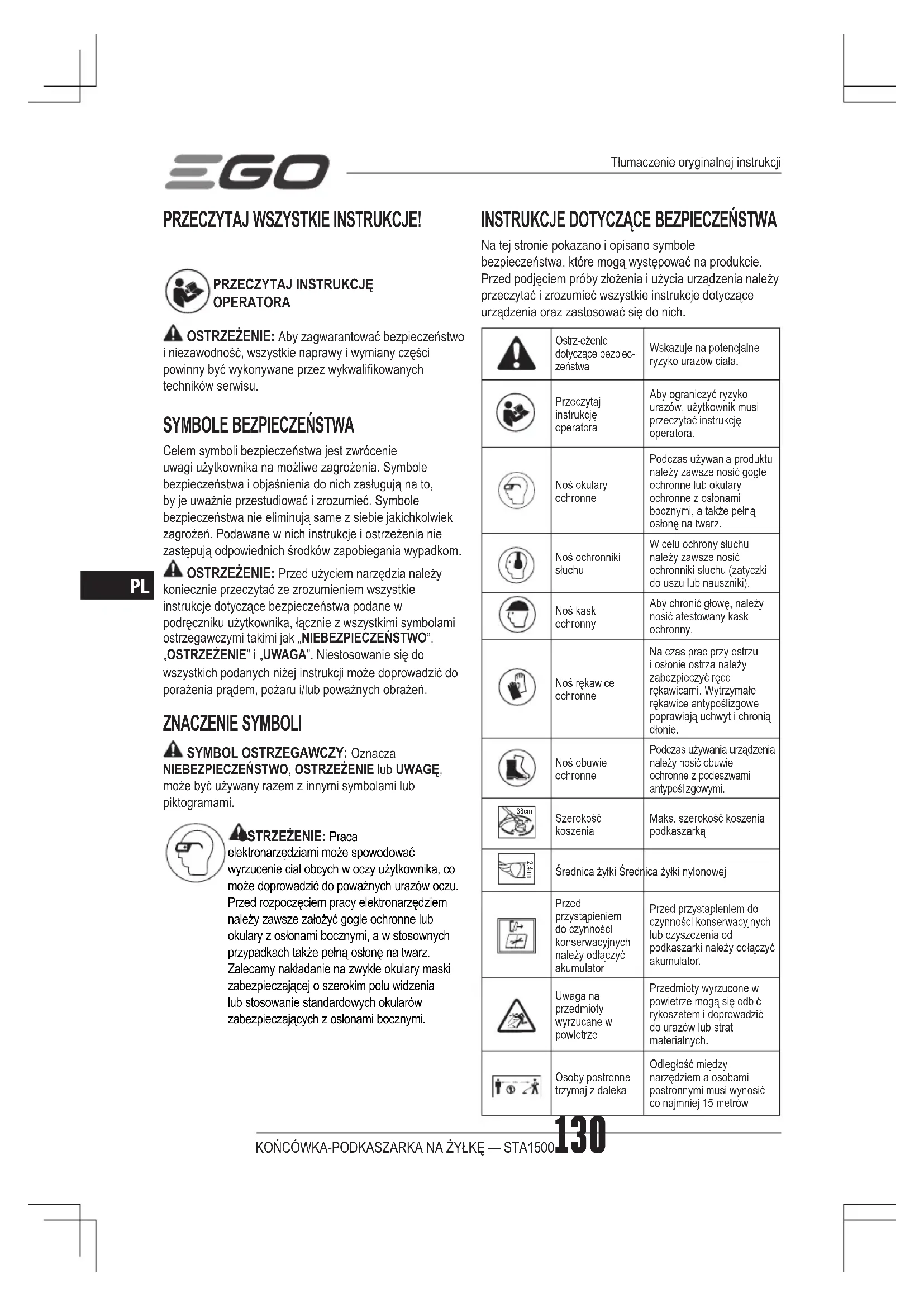 Na tej stronie pokazano i opisano symbole bezpieczeństwa, które mogą występować na produkcie. Przed podjęciem próby złożenia i użycia urządzenia należy przeczytać i zrozumieć wszystkie instrukcje dotyczące urządzenia oraz zastosować się do nich. Ostrz-eżenie dotyczące bezpiec-zeństwaWskazuje na potencjalne ryzyko urazów ciała.Przeczytaj instrukcję operatoraAby ograniczyć ryzyko urazów, użytkownik musi przeczytać instrukcję operatora.Noś okulary ochronnePodczas używania produktu należy zawsze nosić gogle ochronne lub okulary ochronne z osłonami bocznymi, a także pełną osłonę na twarz.Noś ochronniki słuchuW celu ochrony słuchu należy zawsze nosić ochronniki słuchu (zatyczki do uszu lub nauszniki).Noś kask ochronnyAby chronić głowę, należy nosić atestowany kask ochronny.Noś rękawice ochronneNa czas prac przy ostrzu i osłonie ostrza należy zabezpieczyć ręce rękawicami. Wytrzymałe rękawice antypoślizgowe poprawiają uchwyt i chronią dłonie.Noś obuwie ochronnePodczas używania urządzenia należy nosić obuwie ochronne z podeszwami antypoślizgowymi. 38cm Szerokość koszeniaMaks. szerokość koszenia podkaszarką 2.4mm Średnica żyłki Średnica żyłki nylonowejPrzed przystąpieniem do czynności konserwacyjnych należy odłączyć akumulatorPrzed przystąpieniem do czynności konserwacyjnych lub czyszczenia od podkaszarki należy odłączyć akumulator.Uwaga na przedmioty wyrzucane w powietrzePrzedmioty wyrzucone w powietrze mogą się odbić rykoszetem i doprowadzić do urazów lub strat materialnych.Osoby postronne trzymaj z dalekaOdległość między narzędziem a osobami postronnymi musi wynosić co najmniej 15 metrów Tłumaczenie oryginalnej instrukcjiKOŃCÓWKA-PODKASZARKA NA ŻYŁKĘ — STA1500