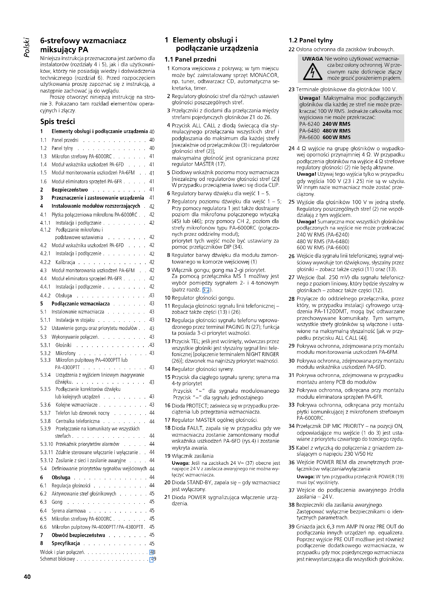 22 Osłona ochronna dla zacisków śrubowych.UWAGA Nie wolno użytkować wzmacnia-cza bez osłony ochronnej. W prze-ciwnym razie dotknięcie złączy może grozić porażeniem prądem.23 Terminale głośnikowe dla głośników 100 V.Uwaga! Maksymalna moc podłączanych głośników dla każdej ze stref nie może prze-kraczać 100 W RMS. Jednakże całkowita moc wyjściowa nie może przekraczać:PA-6240 240 W RMSPA-6480 480 W RMSPA-6600 600 W RMS 4 Ω wyjście na grupę głośników o wypadko-wej oporności przynajmniej 4 Ω. W przypadku podłączenia głośników na wyjście 4 Ω strefowe regulatory głośności (2) nie będą aktywne. Uwaga! Używaj tego wyjścia tylko w przypadku gdy wyjścia 100 V (23 i 25) nie są w użyciu. W innym razie wzmacniacz może zostać prze-ciążony. Wyjście dla głośników 100 V w jedną strefę. Regulatory poszczególnych stref (2) nie współ-działają z tym wyjściem. Uwaga! Sumaryczna moc wszystkich głośników podłączonych na wyjście nie może przekraczać 240 W RMS (PA-6240) 480 W RMS (PA-6480) 600 W RMS (PA-6600) Wejście dla sygnału linii telefonicznej; sygnał wej-ściowy wywołuje ton dźwiękowy, słyszalny przez głośniki – zobacz także części (11) oraz (13). Wejście (bal. 250 mV) dla sygnału telefonicz-nego z poziom liniowy, który będzie słyszalny w głośnikach – zobacz także części (12). Przyłącze do oddzielnego przełącznika, przez który, w przypadku instalacji cyfrowego urzą-dzenia PA-1120DMT, mogą być odtwarzane przechowywane komunikaty. Tym samym, wszystkie strefy głośników są włączone i usta-wione na maksymalną słyszalność [jak w przy-padku przycisku ALL CALL (4)]. Pokrywa ochronna, zdejmowana przy montażu modułu monitorowania uszkodzeń PA-6FM. Pokrywa ochronna, zdejmowana przy montażu modułu wskaźnika uszkodzeń PA-6FD.31 Pokrywa ochronna, zdejmowana w przypadku montażu anteny PCB do modułów Pokrywa ochronna, odkręcana przy montażu modułu eliminatora sprzężeń PA-6FR. Pokrywa ochronna, odkręcana przy montażu płytki komunikującej z mikrofonem strefowym PA-6000RC.34 Przełącznik DIP MIC PRIORITY – na pozycji ON, odpowiadające mu wejście (1 do 3) jest usta-wiane z priorytetu czwartego do trzeciego rzędu.35 Kabel z wtyczką do połączenia z gniazdem za-silającym o napięciu 230 V/50 Hz Wejście POWER REM dla zewnętrznych prze-łączników włączania/wyłączaniaUwaga: W tym przypadku przełącznik POWER (19) musi być wyciśnięty. Wejście do podłączenia awaryjnego źródła zasilania ⎓ 24 V.38 Bezpieczniki dla zasilania awaryjnego. Zastępować wyłącznie bezpiecznikami o iden-tycznych parametrach.39 Gniazda jack 6,3 mm AMP IN oraz PRE OUT do podłączania innych urządzeń np. equalizera. Poprzez wyjście PRE OUT możliwe jest również podłączenie dodatkowego wzmacniacza, w przypadku gdy moc pojedynczego wzmacniacza jest niewystarczająca dla wszystkich głośników. Spis treści 1 Elementy obsługi i podłączanie urządzenia