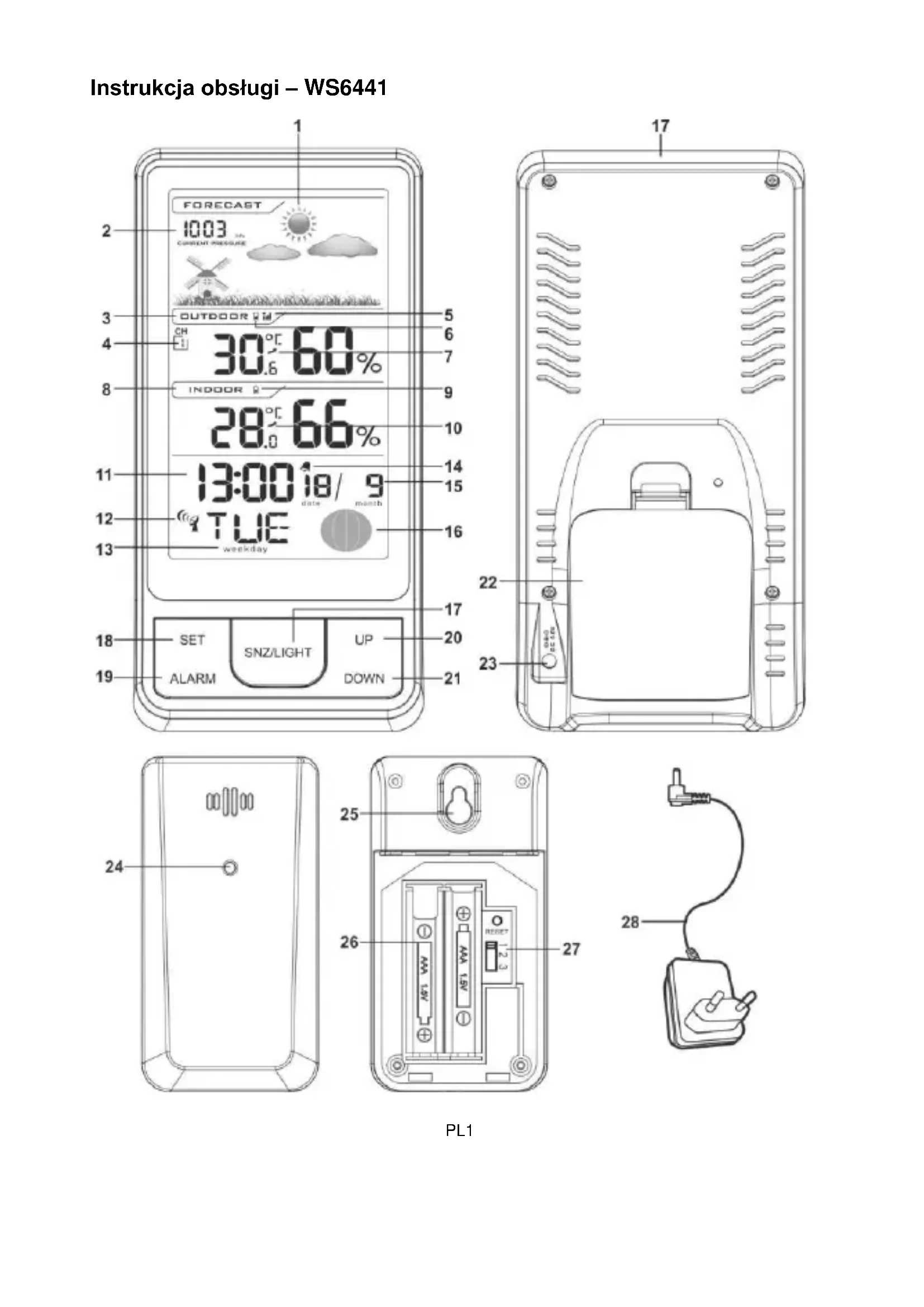 Tento symbol znamená, že po ukončení životnosti elektrického zařízení je nutno jej likvidovat odděleně od běžného domovního odpadu. Zařízení vraťte do místního sběrného místa nebo centra pro recyklaci. To platí pro všechny země Evropské unie a ostatní evropské země se samostatným systémem shromažďování odpadu.PL1 Instrukcja obsługi – WS6441PL2 Informacje ogólne o urządzeniu 1 – ikona prognozy pogody 15 – data 2 – wskazanie barometru 16 – faza księżyca 3 – temperatura/wilgotność na zewnątrz 17 – przycisk SNZ/LIGHT 4 – kanał czujnika zewnętrznego 18 – przycisk SET 5 – siła sygnału czujnika zewnętrznego 19 – przycisk ALARM 6 – wskaźnik rozładowania baterii (czujnik zewnętrzny) 20 – przycisk UP 7 – tendencja temperatury zewnętrznej 21 – przycisk DOWN 8 – temperatura/wilgotność wewnątrz 22 – komora baterii 9 – wskaźnik rozładowania baterii (stacja bazowa) 23 – gniazdo zasilacza prądu stałego 10 – tendencja temperatury wewnętrznej 24 – wskaźnik sygnału bezprzewodowego 11 – wskazanie czasu 25 – zintegrowany otwór montażowy 12 – ikona RCC (czas sterowany radiowo) 26 – komora baterii 13 – dzień tygodnia 27 – przełączanie kanału czujnika zewnętrznego 14 – ikony alarmu 28 – zasilacz AC/DC