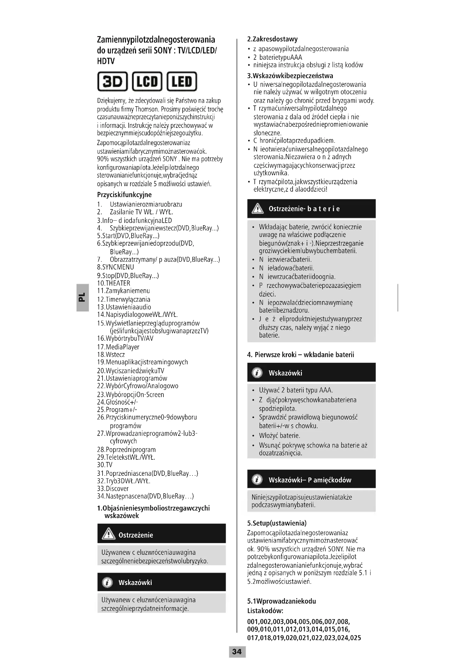 Zamienny pilot zdalnego sterowania do urządzeń serii SONY :TV/LCD/LED/ HDTV Dziękujemy, żezdecydowali się Państwo na zakup produktu firmy Thomson. Prosimy poświęcić trochę czasu na uważne przeczytanie poniższych instrukcji iinformacji. Instrukcję należyprzechowywać w bezpiecznym miejscu do późniejszego użytku. Za pomocą pilota zdalnego sterowania z ustawieniami fabrycznymi można sterować ok. 90% wszystkich urządzeń SONY .Nie ma potrzeby kongurowania pilota. Jeżeli pilot zdalnego sterowania nie funkcjonuje, wybrać jedną z opisanych wrozdziale 5możliwości ustawień. Przyciski funkcyjne