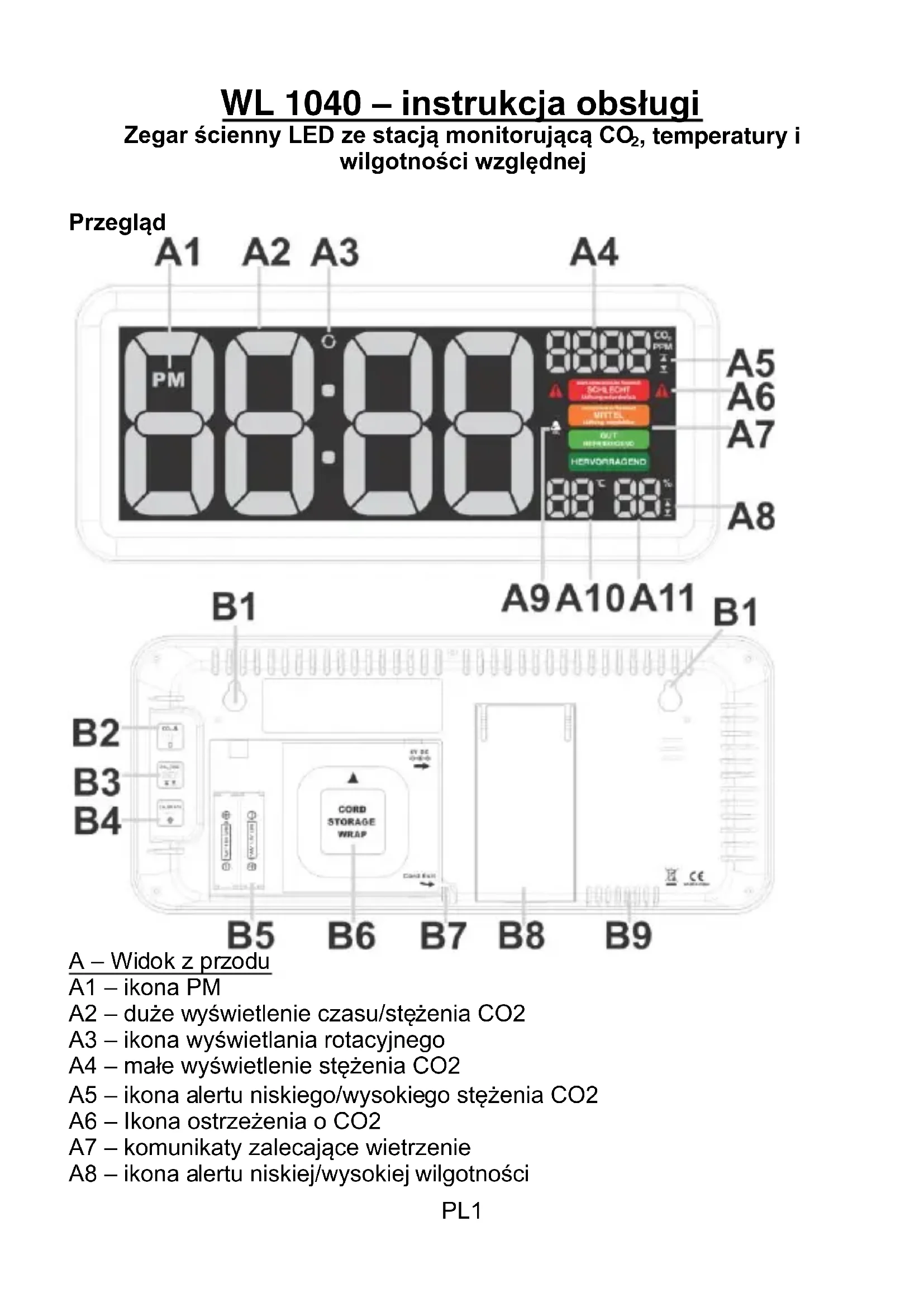 , temperatury i wilgotności względnej Przegląd A – Widok z przodu A1 – ikona PM A2 – duże wyświetlenie czasu/stężenia CO2 A3 – ikona wyświetlania rotacyjnego A4 – małe wyświetlenie stężenia CO2 A5 – ikona alertu niskiego/wysokiego stężenia CO2 A6 – Ikona ostrzeżenia o CO2 A7 – komunikaty zalecające wietrzenie A8 – ikona alertu niskiej/wysokiej wilgotnościPL2 A9 – ikona alarmu dźwiękowego CO2 A10 – temperatura pomieszczenia A11 – wilgotność pomieszczenia B – tylna część urządzenia B1 – otwory do zawieszenia B2 – przycisk +(plus) B3 – przycisk ustawienia SET B4 – przycisk -(minus) button B5 – komora baterii B6 – schowek do zwinięcia przewodu zasilacza B7 – wyjście przewodu zasilacza B8 – podstawka B9 – wentylacja czujnika CO2 Główne funkcje