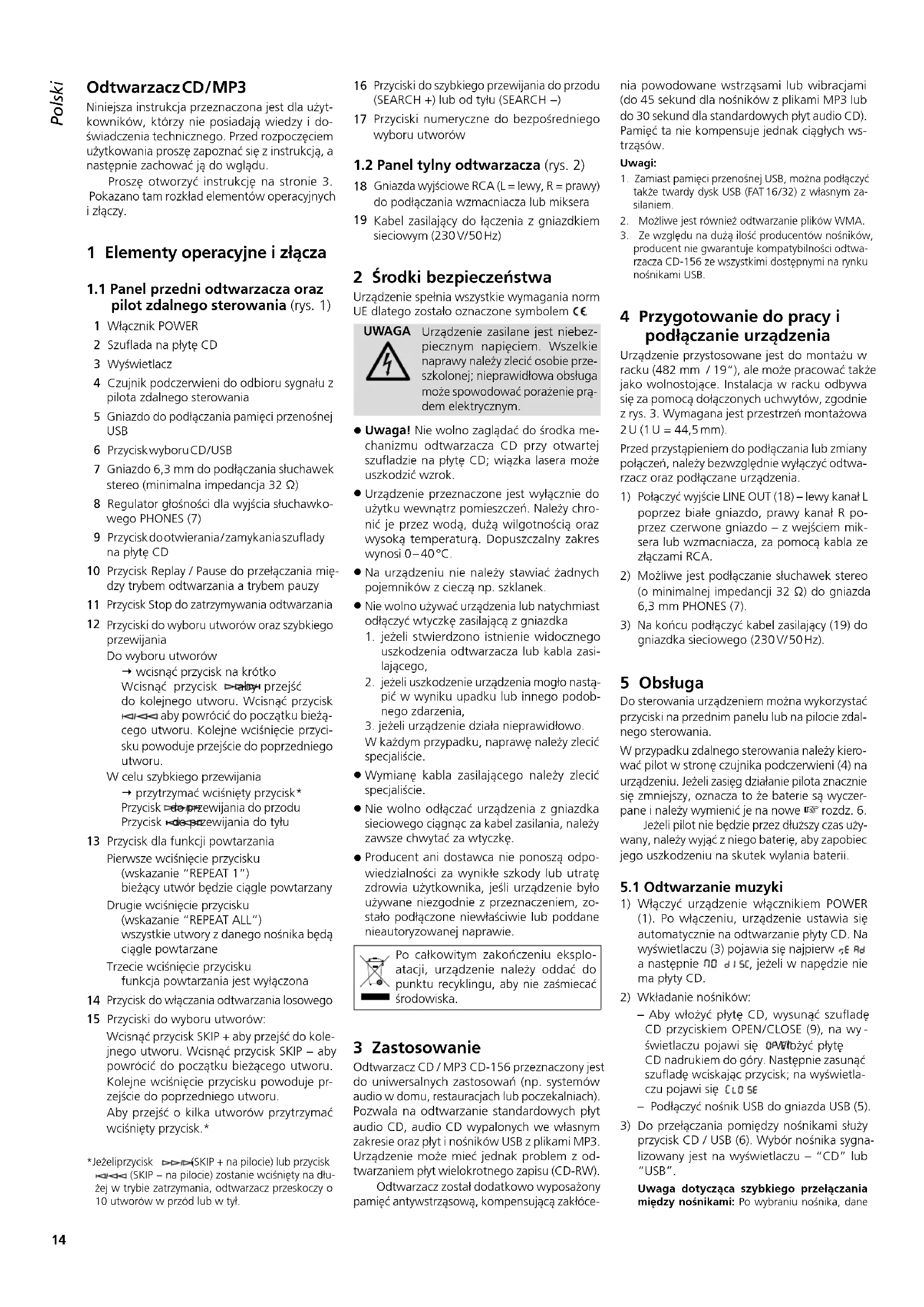 Gniazda wyjściowe RCA (L = lewy, R = prawy) do podłączania wzmacniacza lub miksera Kabel zasilający do łączenia z gniazdkiem sieciowym (230 V/ 50 Hz) 2 Środki bezpieczeństwa Urządzenie spełnia wszystkie wymagania norm UE dlatego zostało oznaczone symbolem .UWAGAUrządzenie zasilane jest niebez-piecznym napięciem. Wszelkie naprawy należy zlecić osobie prze-szkolonej; nieprawidłowa obsługa może spowodować porażenie prą-dem elektrycznym. Uwaga! Nie wolno zaglądać do środka me-chanizmu odtwarzacza CD przy otwartej szufladzie na płytę CD; wiązka lasera może uszkodzić wzrok. Urządzenie przeznaczone jest wyłącznie do użytku wewnątrz pomieszczeń. Należy chro-nić je przez wodą, dużą wilgotnością oraz wysoką temperaturą. Dopuszczalny zakres wynosi 0 – 40 °C. Na urządzeniu nie należy stawiać żadnych pojemników z cieczą np. szklanek. Nie wolno używać urządzenia lub natychmiast odłączyć wtyczkę zasilającą z gniazdka jeżeli stwierdzono istnienie widocznego uszkodzenia odtwarzacza lub kabla zasi-lającego, jeżeli uszkodzenie urządzenia mogło nastą-pić w wyniku upadku lub innego podob-nego zdarzenia,3. jeżeli urządzenie działa nieprawidłowo.W każdym przypadku, naprawę należy zlecić specjaliście. Wymianę kabla zasilającego należy zlecić specjaliście. Nie wolno odłączać urządzenia z gniazdka sieciowego ciągnąc za kabel zasilania, należy zawsze chwytać za wtyczkę. Producent ani dostawca nie ponoszą odpo-wiedzialności za wynikłe szkody lub utratę zdrowia użytkownika, jeśli urządzenie było używane niezgodnie z przeznaczeniem, zo-stało podłączone niewłaściwie lub poddane nieautoryzowanej naprawie.Po całkowitym zakończeniu eksplo-atacji, urządzenie należy oddać do punktu recyklingu, aby nie zaśmiecać środowiska. 3 Zastosowanie Odtwarzacz CD / MP3 CD-156 przeznaczony jest do uniwersalnych zastosowań (np. systemów audio w domu, restauracjach lub poczekalniach). Pozwala na odtwarzanie standardowych płyt audio CD, audio CD wypalonych we własnym zakresie oraz płyt i nośników USB z plikami MP3. Urządzenie może mieć jednak problem z od-twarzaniem płyt wielokrotnego zapisu (CD-RW).Odtwarzacz został dodatkowo wyposażony pamięć antywstrząsową, kompensującą zakłóce-nia powodowane wstrząsami lub wibracjami (do 45sekund dla nośników z plikami MP3 lub do 30sekund dla standardowych płyt audioCD). Pamięć ta nie kompensuje jednak ciągłych ws-trząsów.Uwagi:1. Zamiast pamięci przenośnej USB, można podłączyć także twardy dysk USB (FAT 16 / 32) z własnym za- silaniem.2. Możliwe jest również odtwarzanie plików WMA.3. Ze względu na dużą ilość producentów nośników, producent nie gwarantuje kompatybilności odtwa-rzacza CD-156 ze wszystkimi dostępnymi na rynku nośnikami USB. 4 Przygotowanie do pracy i podłączanie urządzenia Urządzenie przystosowane jest do montażu w racku (482 mm / 19“), ale może pracować także jako wolnostojące. Instalacja w racku odbywa się za pomocą dołączonych uchwytów, zgodnie z rys. 3. Wymagana jest przestrzeń montażowa 2 U (1 U = 44,5 mm).Przed przystąpieniem do podłączania lub zmiany połączeń, należy bezwzględnie wyłączyć odtwa-rzacz oraz podłączane urządzenia. Połączyć wyjście LINE OUT (18) – lewy kanałL poprzez białe gniazdo, prawy kanał R po-przez czerwone gniazdo – z wejściem mik-sera lub wzmacniacza, za pomocą kabla ze złączami RCA.2) Możliwe jest podłączanie słuchawek stereo (o minimalnej impedancji 32 Ω) do gniazda 6,3 mm PHONES (7).3) Na końcu podłączyć kabel zasilający (19) do gniazdka sieciowego (230 V/ 50 Hz). 5 Obsługa Do sterowania urządzeniem można wykorzystać przyciski na przednim panelu lub na pilocie zdal-nego sterowania.W przypadku zdalnego sterowania należy kiero-wać pilot w stronę czujnika podczerwieni (4) na urządzeniu. Jeżeli zasięg działanie pilota znacznie się zmniejszy, oznacza to że baterie są wyczer-pane i należy wymienić je na nowe rozdz. 6.Jeżeli pilot nie będzie przez dłuższy czas uży-wany, należy wyjąć z niego baterię, aby zapobiec jego uszkodzeniu na skutek wylania baterii.