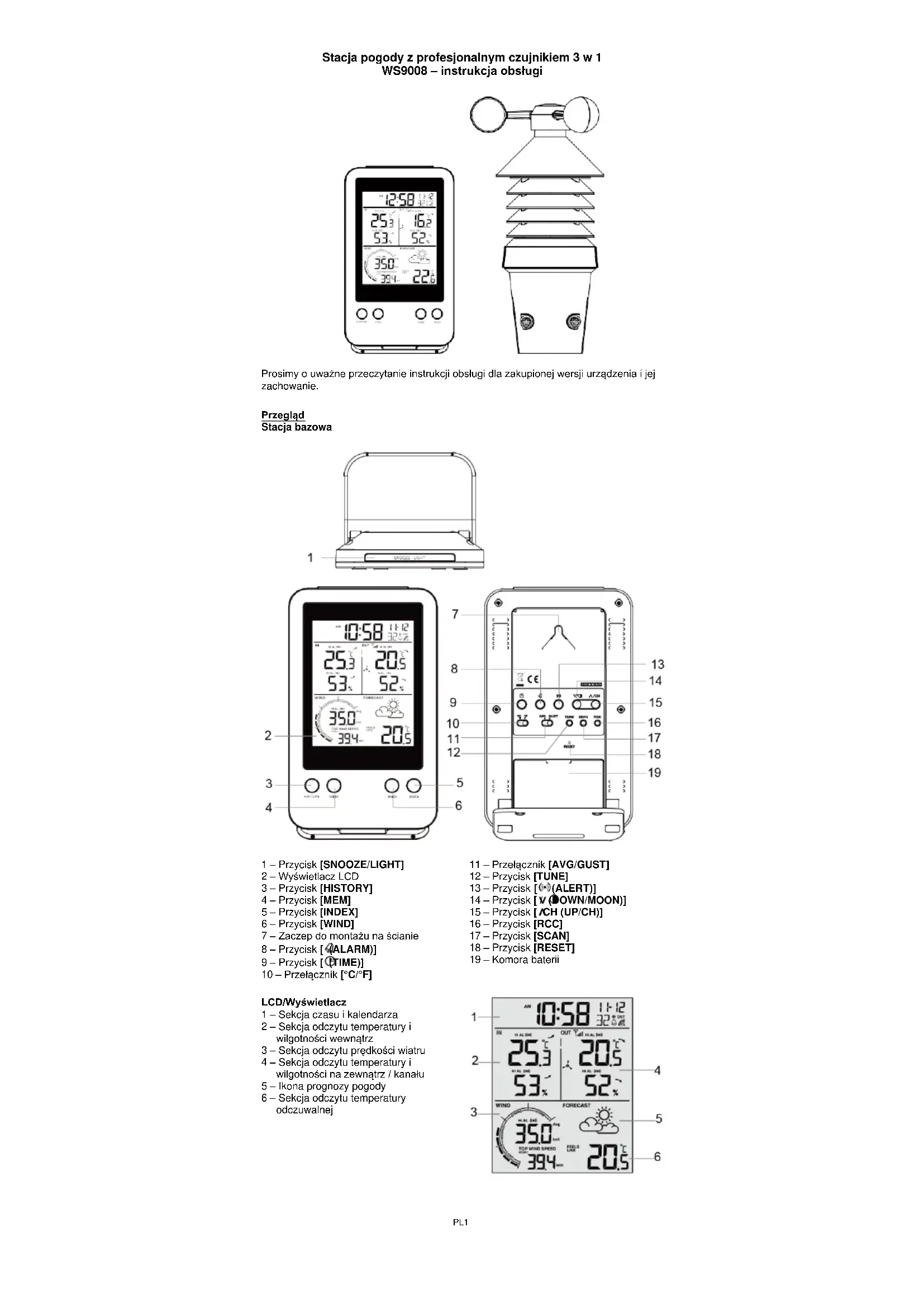 LCD/Wyświetlacz 1 – Sekcja czasu i kalendarza 2 – Sekcja odczytu temperatury i wilgotności wewnątrz 3 – Sekcja odczytu prędkości wiatru 4 – Sekcja odczytu temperatury i wilgotności na zewnątrz / kanału 5 – Ikona prognozy pogody 6 – Sekcja odczytu temperatury odczuwalnejPL2 Czujnik bezprzewodowy 3 w 1 1 – Czasza wiatromierza 2 – Osłona radiacyjna 3 – Komora baterii 4 – Dolna obudowa 5 – Zaciski montażowe do dolnej obudowy 6 – Wskaźnik LED Miga, gdy jednostka zdalna nadaje 7 – Przycisk [RESET]