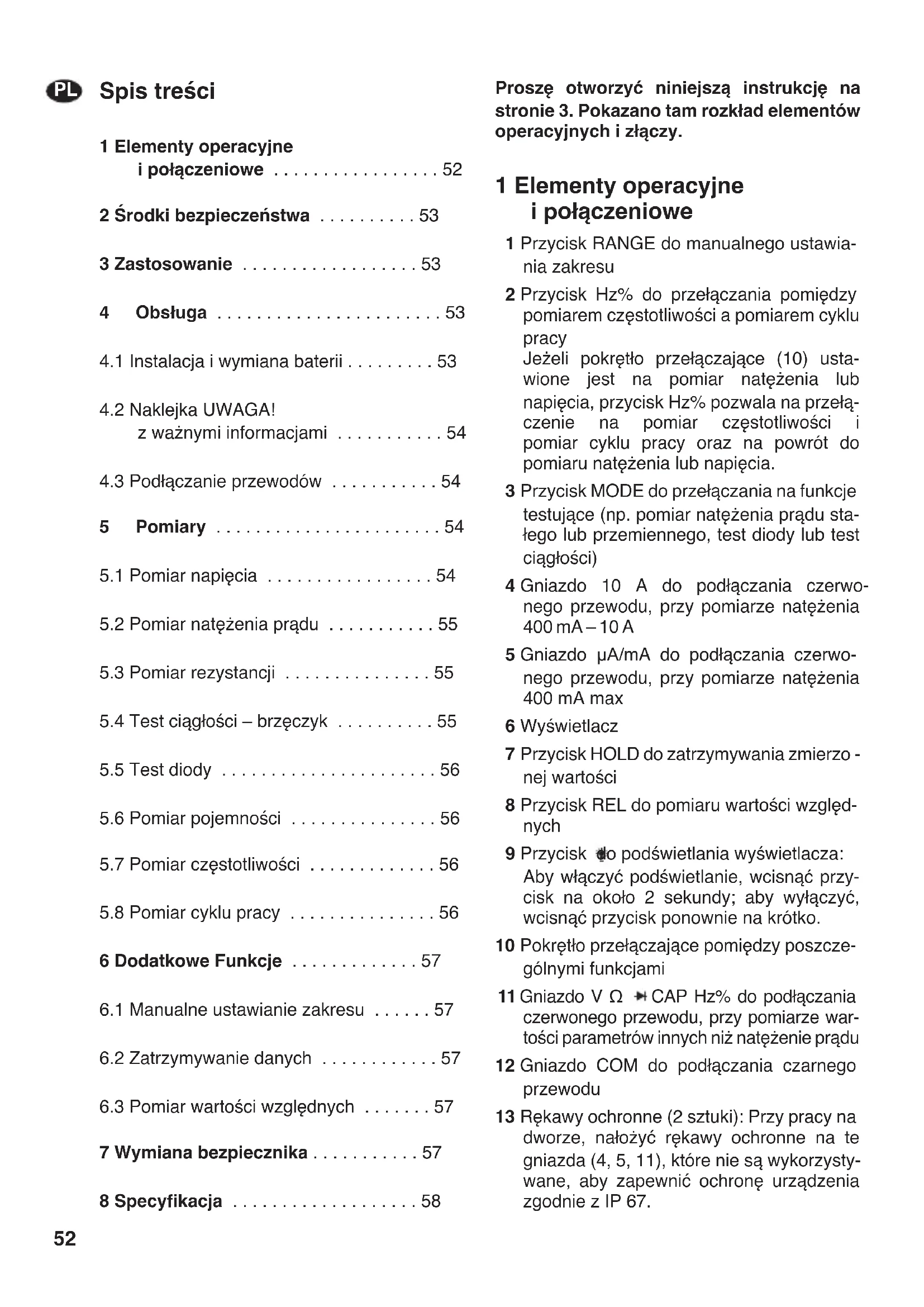 7 Wymiana bezpiecznika . . . . . . . . . . . 57 8 Specyfikacja . . . . . . . . . . . . . . . . . . . 58 Proszę otworzyć niniejszą instrukcję na stronie 3. Pokazano tam rozkład elementów operacyjnych i złączy. 1 Elementy operacyjne i połączeniowe 1 Przycisk RANGE do manualnego ustawia- nia zakresu 2 Przycisk Hz% do przełączania pomiędzy pomiarem częstotliwości a pomiarem cyklu pracy Jeżeli pokrętło przełączające (10) usta- wione jest na pomiar natężenia lub napięcia, przycisk Hz% pozwala na przełą- czenie na pomiar częstotliwości i pomiar cyklu pracy oraz na powrót do pomiaru natężenia lub napięcia. 3 Przycisk MODE do przełączania na funkcje testujące (np. pomiar natężenia prądu sta- łego lub przemiennego, test diody lub test ciągłości) 4 Gniazdo 10 A do podłączania czerwo- nego przewodu, przy pomiarze natężenia 400 mA – 10 A 5 Gniazdo µA/mA do podłączania czerwo- nego przewodu, przy pomiarze natężenia 400 mA max 6 Wyświetlacz 7 Przycisk HOLD do zatrzymywania zmierzo - nej wartości 8 Przycisk REL do pomiaru wartości względ- nych 9 Przycisk do podświetlania wyświetlacza: Aby włączyć podświetlanie, wcisnąć przy- cisk na około 2 sekundy; aby wyłączyć, wcisnąć przycisk ponownie na krótko. 10 Pokrętło przełączające pomiędzy poszcze- gólnymi funkcjami 11 Gniazdo V Ω CAP Hz% do podłączania czerwonego przewodu, przy pomiarze war- tości parametrów innych niż natężenie prądu 12 Gniazdo COM do podłączania czarnego przewodu 13 Rękawy ochronne (2 sztuki): Przy pracy na dworze, nałożyć rękawy ochronne na te gniazda (4, 5, 11), które nie są wykorzysty- wane, aby zapewnić ochronę urządzenia zgodnie z IP 67.