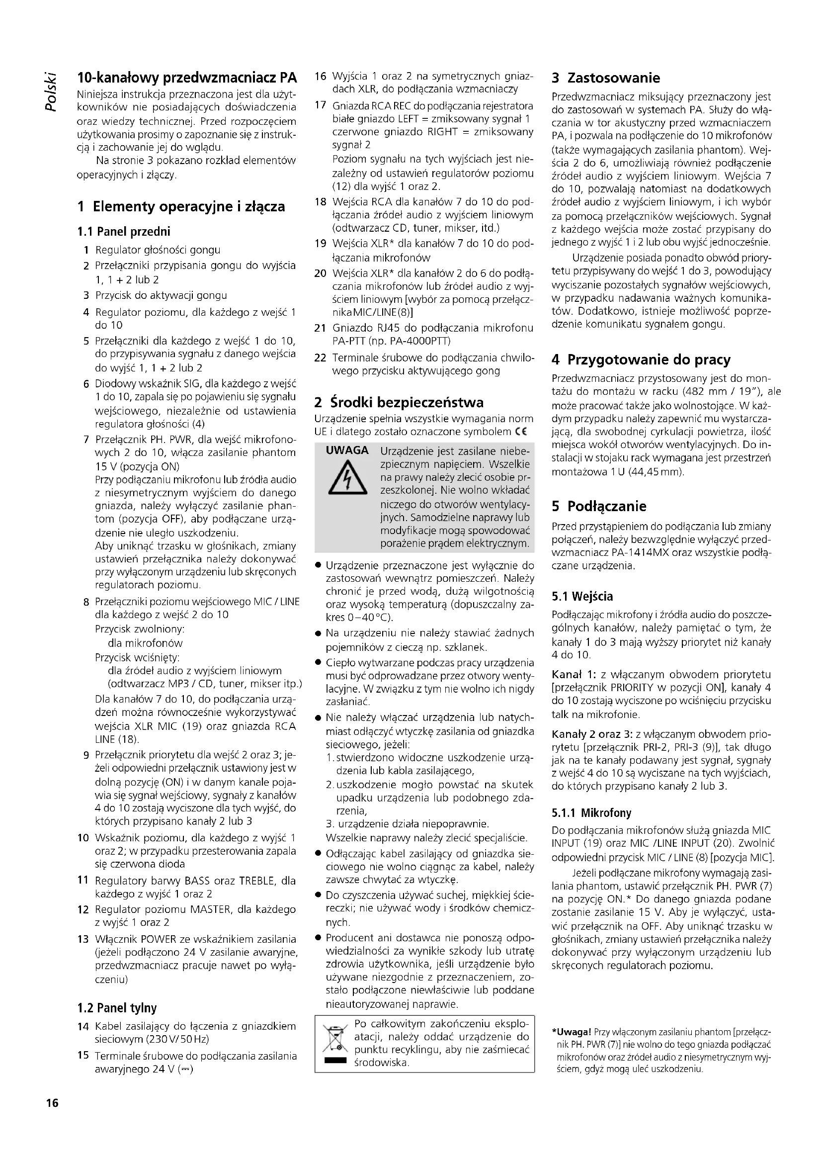 Przedwzmacniacz miksujczy przyznaczony jest do zastosowan w systemach PA. Sluzy do wlaczania w tor akustyczny przyd wzmacniaczem PA, i pozwala na podlaczenia do 10 mikrofonow (takze wymagajych zasilania phantom). Wejscia 2 do 6, umożliwieja rownież podlaczenia zródel audio z wyjsciem liniowym. Wejscia 7 do 10, pozwalaja natomiast na dodatkowych zródel audio z wyjsciem liniowym, i ich wybor za pomocza przy.§czników wejsciowych. Sygnat z kázdego wejscia要去stć przypisany do Jednégo z wyjsć 1 i 2 lub obu wyjsć jederocsznie.