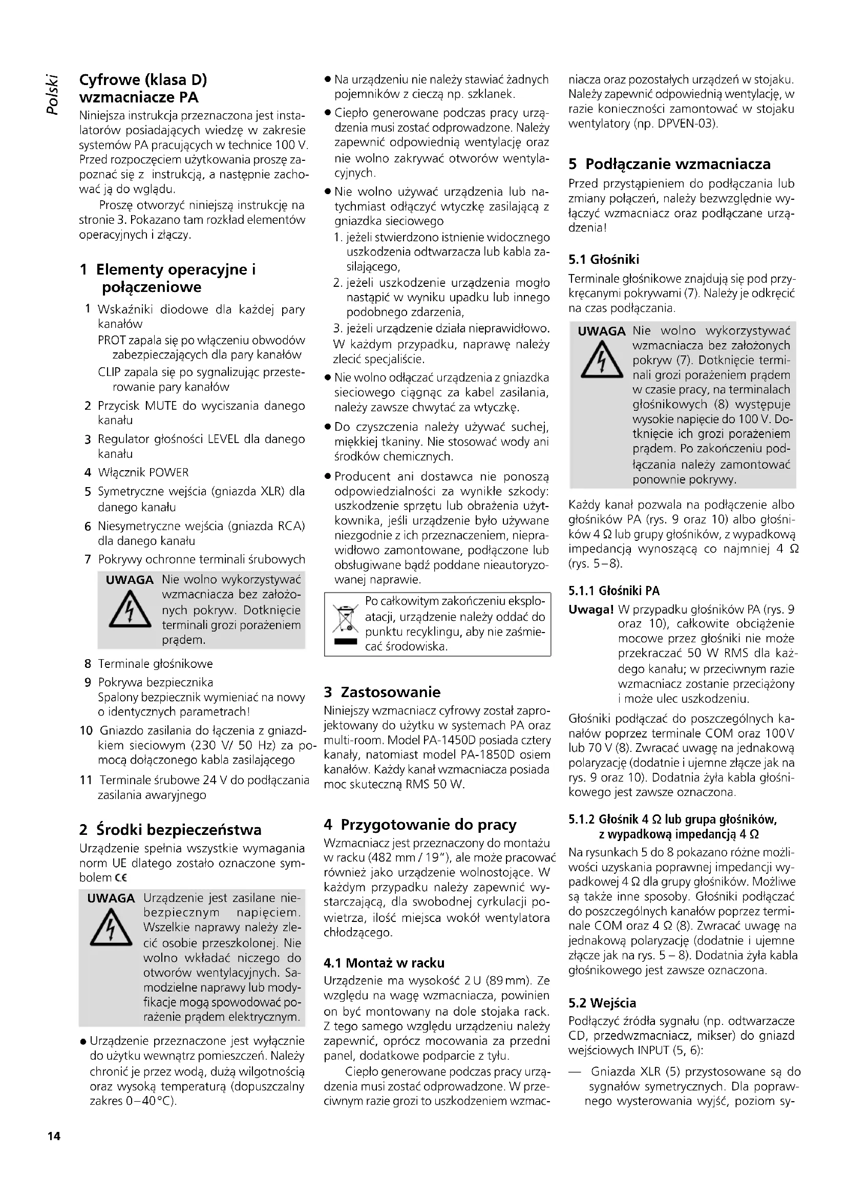 Wzmacniacz jest przyznaczony do montazu w racku (482 mm / 19"), ale要去 prisoneriej sądzenie wolnostojace. W zaźym przypadku nalezy zapewnic wystarczajca, dla swobodnej cyrkulacje po-wietrza, ilosc.), wokot wentylatora chłodźacego.