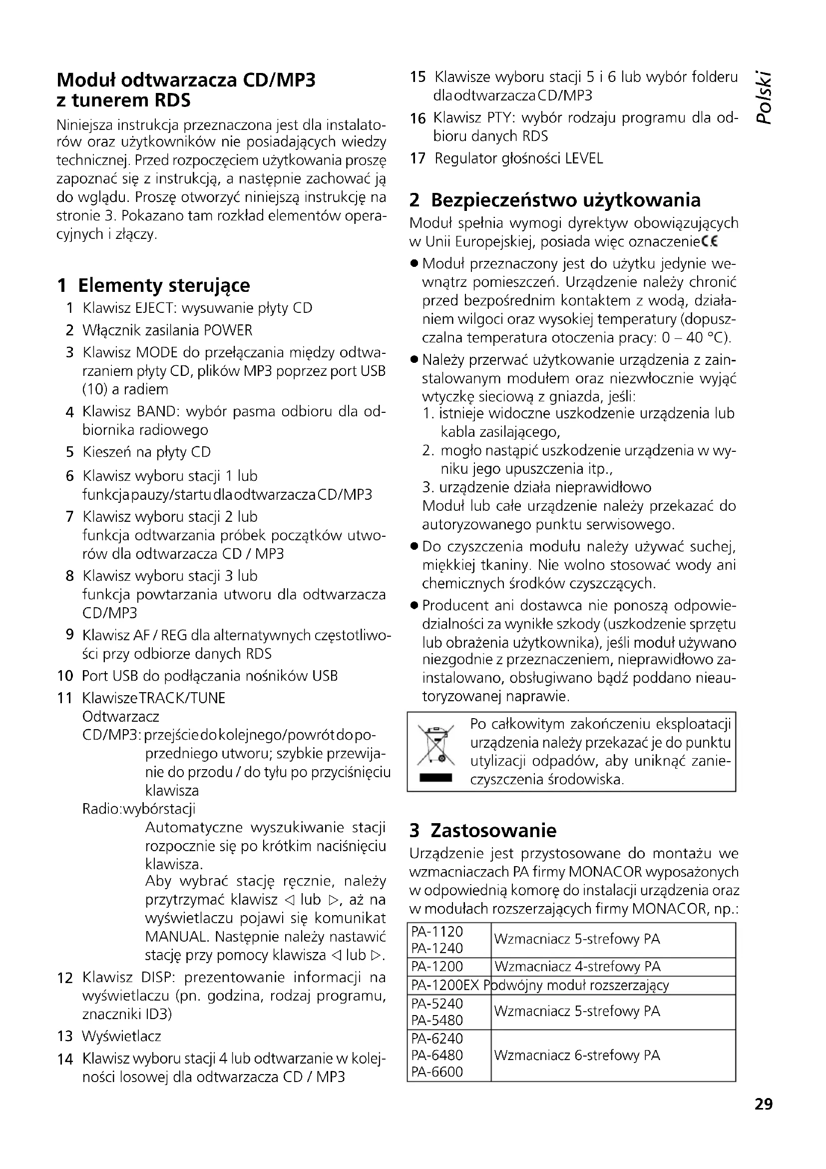 Klawisz PTY: wybór rodzaju programu dla od- bioru danych RDS 17 Regulator głośności LEVEL 2 Bezpieczeństwo użytkowania Moduł spełnia wymogi dyrektyw obowiązujących w Unii Europejskiej, posiada więc oznaczenie .