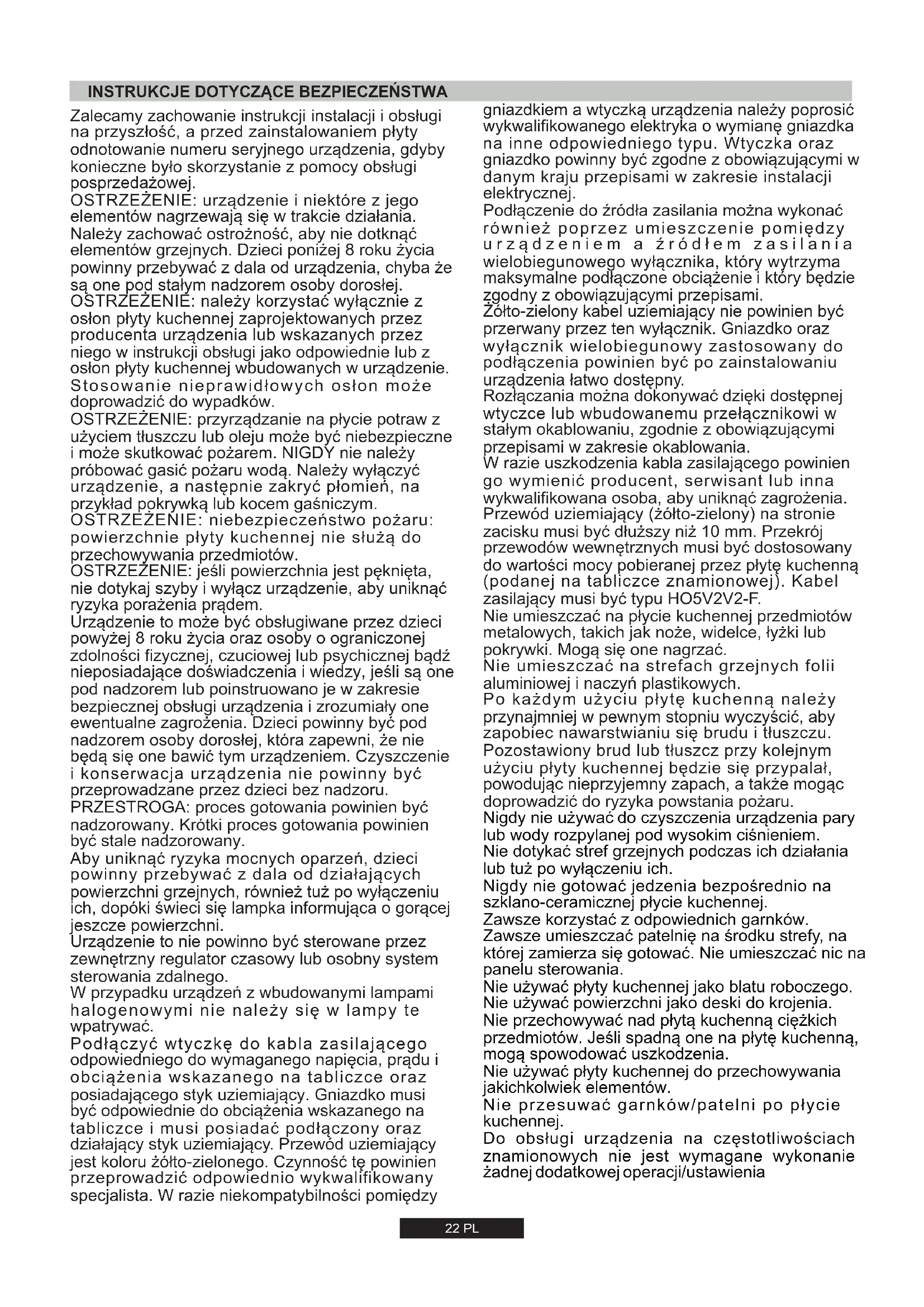 7,7 kW734 l/h560 g/h -22 PL Zalecamy zachowanie instrukcji instalacji i obsługi na przyszłość, a przed zainstalowaniem płyty odnotowanie numeru seryjnego urządzenia, gdyby konieczne było skorzystanie z pomocy obsługi posprzedażowej. OSTRZEŻENIE: urządzenie i niektóre z jego elementów nagrzewają się w trakcie działania. Należy zachować ostrożność, aby nie dotknąć elementów grzejnych. Dzieci poniżej 8 roku życia powinny przebywać z dala od urządzenia, chyba że są one pod stałym nadzorem osoby dorosłej. OSTRZEŻENIE: należy korzystać wyłącznie z osłon płyty kuchennej zaprojektowanych przez producenta urządzenia lub wskazanych przez niego w instrukcji obsługi jako odpowiednie lub z osłon płyty kuchennej wbudowanych w urządzenie. Stosowanie nieprawidłowych osłon może doprowadzić do wypadków. OSTRZEŻENIE: przyrządzanie na płycie potraw z użyciem tłuszczu lub oleju może być niebezpieczne i może skutkować pożarem. NIGDY nie należy próbować gasić pożaru wodą. Należy wyłączyć urządzenie, a następnie zakryć płomień, na przykład pokrywką lub kocem gaśniczym. OSTRZEŻENIE: niebezpieczeństwo pożaru: powierzchnie płyty kuchennej nie służą do przechowywania przedmiotów. W przypadku urządzeń z wbudowanymi lampami halogenowymi nie należy się w lampy te wpatrywać. PRZESTROGA: proces gotowania powinien być nadzorowany. Krótki proces gotowania powinien być stale nadzorowany. Aby uniknąć ryzyka mocnych oparzeń, dzieci powinny przebywać z dala od działających powierzchni grzejnych, również tuż po wyłączeniu ich, dopóki świeci się lampka informująca o gorącej jeszcze powierzchni. Urządzenie to może być obsługiwane przez dzieci powyżej 8 roku życia oraz osoby o ograniczonej zdolności fizycznej, czuciowej lub psychicznej bądź nieposiadające doświadczenia i wiedzy, jeśli są one pod nadzorem lub poinstruowano je w zakresie bezpiecznej obsługi urządzenia i zrozumiały one ewentualne zagrożenia. Dzieci powinny być pod nadzorem osoby dorosłej, która zapewni, że nie będą się one bawić tym urządzeniem. Czyszczenie i konserwacja urządzenia nie powinny być przeprowadzane przez dzieci bez nadzoru. OSTRZEŻENIE: jeśli powierzchnia jest pęknięta, nie dotykaj szyby i wyłącz urządzenie, aby uniknąć ryzyka porażenia prądem. Urządzenie to nie powinno być sterowane przez zewnętrzny regulator czasowy lub osobny system sterowania zdalnego. Podłączyć wtyczkę do kabla zasilającego odpowiedniego do wymaganego napięcia, prądu i obciążenia wskazanego na tabliczce oraz posiadającego styk uziemiający. Gniazdko musi być odpowiednie do obciążenia wskazanego na tabliczce i musi posiadać podłączony oraz działający styk uziemiający. Przewód uziemiający jest koloru żółto-zielonego. Czynność tę powinien przeprowadzić odpowiednio wykwalifikowany specjalista. W razie niekompatybilności pomiędzy