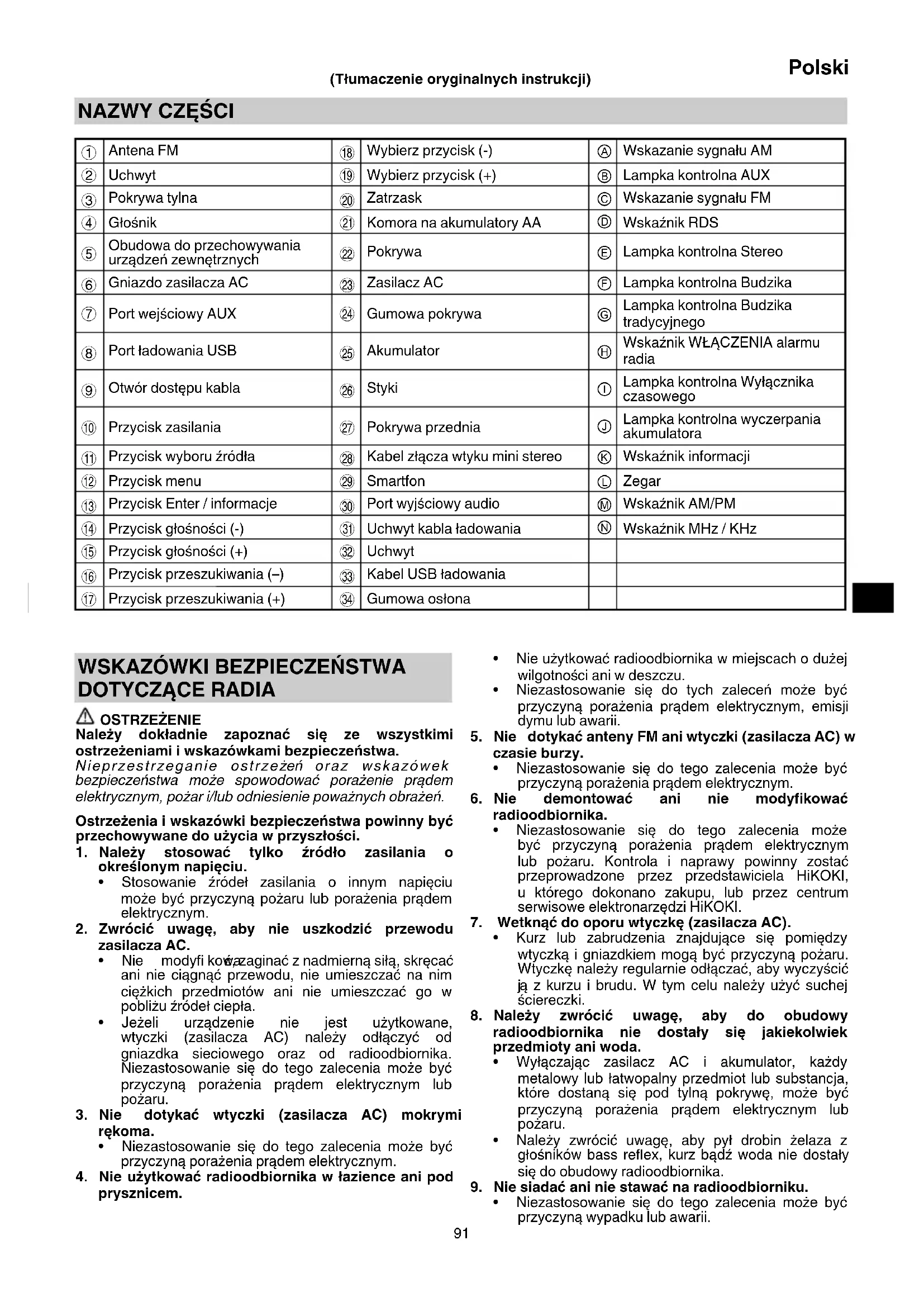 Wymiary zewnętrzne Dł. 366 mm x Szer. 303 mm x Wys. 261 mm (z załamaną anteną) Masa 3,4 kg ○ Aby uzyskać informacje dotyczące stosowanego zasilania, patrz instrukcja obsługi: Stosowane zasilanie: Dong Guan Sun Hung Kin Electrical Co., Ltd. (Produkcja) HKP12-1201200dV, HKP12-1201200dB (Model) ○ Można używać wyłącznie akumulatora typu slide (Model) BSL1430: 14,4 V 3000 mAh Akumulator litowy (Model) BSL1830: 18 V 3000 mAh Akumulator litowy (Produkcja) Koki Holdings Co., Ltd. SYMBOLE OSTRZEŻENIE Następujące oznaczenia są symbolami używanymi w instrukcji elektronarzędzia. Przed rozpoczęciem użytkowania należy się upewnić, że ich znacznie jest zrozumiałe. UR18DSAL : Radio Aby uzyskać informacje dotyczące stosowanego zasilania, patrz instrukcja obsługi. Dotyczy tylko państw UE Elektronarzędzi nie wolno wyrzucać wraz z odpadami z gospodarstwa domowego! Zgodnie z Dyrektywą Europejską 2012/19/ UE w sprawie zużytego sprzętu elektrycznego i elektronicznego oraz wprowadzeniem jej zgodnie z prawem krajowym, zużyte elektronarzędzia należy posegregować i oddać do recyklingu w sposób przyjazny dla środowiska w wyspecjalizowanym zakładzie utylizacji. Przycisk zasilania Przycisk wyboru źródła Przycisk menu Przycisk Enter / informacje Przycisk głośności Przycisk przeszukiwania Wybierz przycisk Lampka kontrolna Budzika tradycyjnego Wskaźnik WŁĄCZENIA alarmu radia Lampka kontrolna wyczerpania akumulatora AKCESORIA STANDARDOWE Poza elektronarzędziem (1 narzędzie) w opakowaniu znajdują się akcesoria wymienione poniżej. ○ Zasilacz AC ...................................................................1 ○ Bateria AA .....................................................................2 ○ Uchwyt kabla ładowania ...............................................1 (dla złącza Apple Lightning)