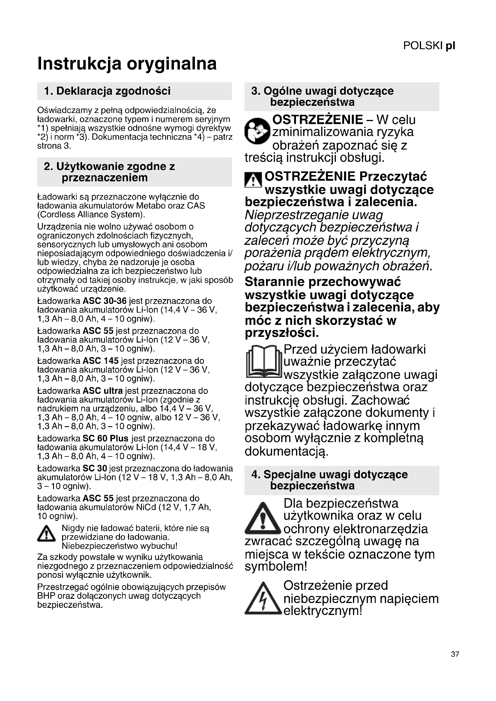 Instrukcja oryginalna Oświadczamy z pełną odpowiedzialnością, że ładowarki, oznaczone typem i numerem seryjnym *1) spełniają wszystkie odnośne wymogi dyrektyw *2) i norm *3). Dokumentacja techniczna *4) – patrz strona 3. Ładowarki są przeznaczone wyłącznie do ładowania akumulatorów Metabo oraz CAS (Cordless Alliance System). Urządzenia nie wolno używać osobom o ograniczonych zdolnościach fizycznych, sensorycznych lub umysłowych ani osobom nieposiadającym odpowiedniego doświadczenia i/ lub wiedzy, chyba że nadzoruje je osoba odpowiedzialna za ich bezpieczeństwo lub otrzymały od takiej osoby instrukcje, w jaki sposób użytkować urządzenie. Ładowarka ASC 30-36 jest przeznaczona do ładowania akumulatorów Li-Ion (14,4 V – 36 V, 1,3 Ah – 8,0 Ah, 4 – 10 ogniw). Ładowarka ASC 55 jest przeznaczona do ładowania akumulatorów Li-Ion (12 V – 36 V, 1,3 Ah – 8,0 Ah, 3 – 10 ogniw). Ładowarka ASC 145 jest przeznaczona do ładowania akumulatorów Li-Ion (12 V – 36 V, 1,3 Ah – 8,0 Ah, 3 – 10 ogniw). Ładowarka ASC ultra jest przeznaczona do ładowania akumulatorów Li-Ion (zgodnie z nadrukiem na urządzeniu, albo 14,4 V – 36 V, 1,3 Ah – 8,0 Ah, 4 – 10 ogniw, albo 12 V – 36 V, 1,3 Ah – 8,0 Ah, 3 – 10 ogniw). Ładowarka SC 60 Plus jest przeznaczona do ładowania akumulatorów Li-Ion (14,4 V – 18 V, 1,3 Ah – 8,0 Ah, 4 – 10 ogniw). Ładowarka SC 30 jest przeznaczona do ładowania akumulatorów Li-Ion (12 V – 18 V, 1,3 Ah – 8,0 Ah, 3 – 10 ogniw). Ładowarka ASC 55 jest przeznaczona do ładowania akumulatorów NiCd (12 V, 1,7 Ah, 10 ogniw). Nigdy nie ładować baterii, które nie są przewidziane do ładowania. Niebezpieczeństwo wybuchu! Za szkody powstałe w wyniku użytkowania niezgodnego z przeznaczeniem odpowiedzialność ponosi wyłącznie użytkownik. Przestrzegać ogólnie obowiązujących przepisów BHP oraz dołączonych uwag dotyczących bezpieczeństwa. OSTRZEŻENIE – W celu zminimalizowania ryzyka obrażeń zapoznać się z treścią instrukcji obsługi. OSTRZEŻENIE Przeczytać wszystkie uwagi dotyczące bezpieczeństwa i zalecenia. Nieprzestrzeganie uwag dotyczących bezpieczeństwa i zaleceń może być przyczyną porażenia prądem elektrycznym, pożaru i/lub poważnych obrażeń. Starannie przechowywać wszystkie uwagi dotyczące bezpieczeństwa i zalecenia, aby móc z nich skorzystać w przyszłości. Przed użyciem ładowarki uważnie przeczytać wszystkie załączone uwagi dotyczące bezpieczeństwa oraz instrukcję obsługi. Zachowa
