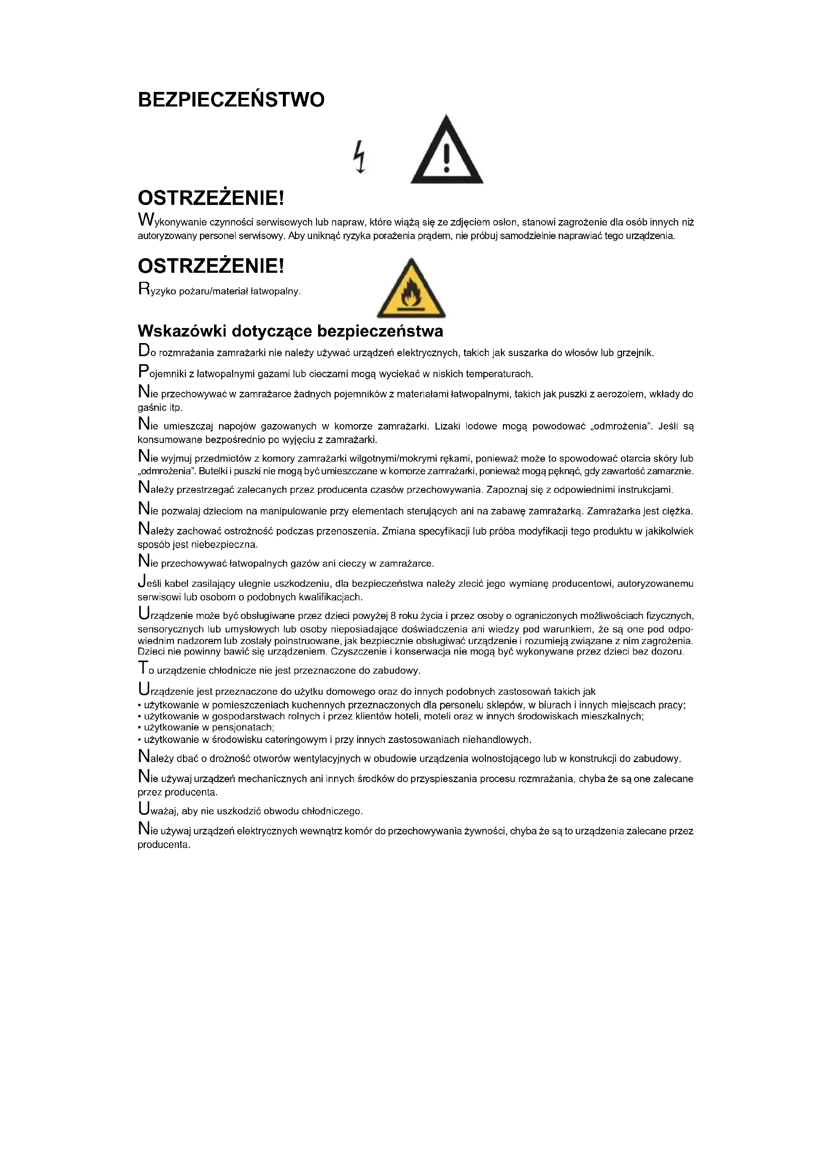 Wskazówki dotyczące bezpieczeństwa Do rozmrażania zamrażarki nie należy używać urządzeń elektrycznych, takich jak suszarka do włosów lub grzejnik. Pojemniki z łatwopalnymi gazami lub cieczami mogą wyciekać w niskich temperaturach. Nie przechowywać w zamrażarce żadnych pojemników z materiałami łatwopalnymi, takich jak puszki z aerozolem, wkłady do gaśnic itp. Nie umieszczaj napojów gazowanych w komorze zamrażarki. Lizaki lodowe mogą powodować „odmrożenia”. Jeśli są konsumowane bezpośrednio po wyjęciu z zamrażarki. Nie wyjmuj przedmiotów z komory zamrażarki wilgotnymi/mokrymi rękami, ponieważ może to spowodować otarcia skóry lub „odmrożenia”. Butelki i puszki nie mogą być umieszczane w komorze zamrażarki, ponieważ mogą pęknąć, gdy zawartość zamarznie. Należy przestrzegać zalecanych przez producenta czasów przechowywania. Zapoznaj się z odpowiednimi instrukcjami. Nie pozwalaj dzieciom na manipulowanie przy elementach sterujących ani na zabawę zamrażarką. Zamrażarka jest ciężka. Należy zachować ostrożność podczas przenoszenia. Zmiana specyfikacji lub próba modyfikacji tego produktu w jakikolwiek sposób jest niebezpieczna. Nie przechowywać łatwopalnych gazów ani cieczy w zamrażarce. Jeśli kabel zasilający ulegnie uszkodzeniu, dla bezpieczeństwa należy zlecić jego wymianę producentowi, autoryzowanemu serwisowi lub osobom o podobnych kwalifikacjach. Urządzenie może być obsługiwane przez dzieci powyżej 8 roku życia i przez osoby o ograniczonych możliwościach fizycznych, sensorycznych lub umysłowych lub osoby nieposiadające doświadczenia ani wiedzy pod warunkiem, że są one pod odpo- wiednim nadzorem lub zostały poinstruowane, jak bezpiecznie obsługiwać urządzenie i rozumieją związane z nim zagrożenia. Dzieci nie powinny bawić się urządzeniem. Czyszczenie i konserwacja nie mogą być wykonywane przez dzieci bez dozoru. To urządzenie chłodnicze nie jest przeznaczone do zabudowy. Urządzenie jest przeznaczone do użytku domowego oraz do innych podobnych zastosowań takich jak