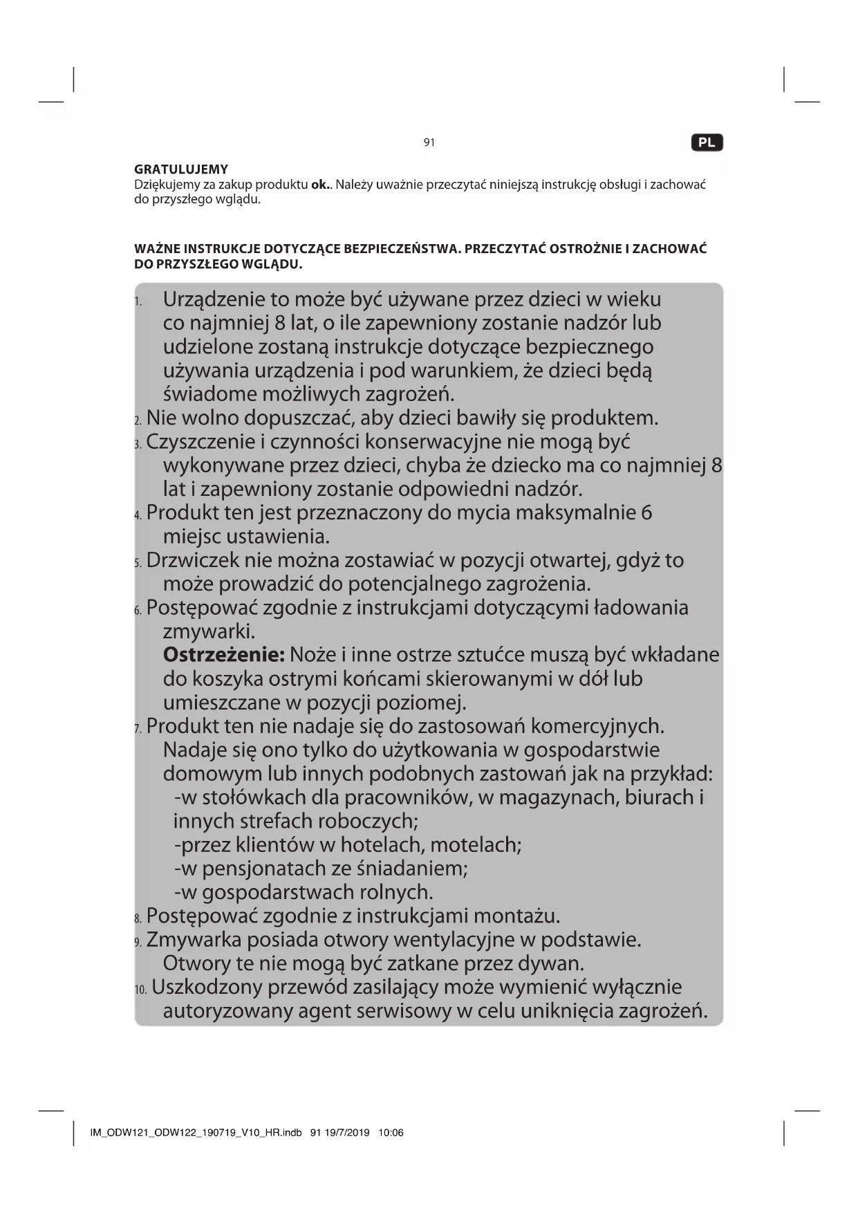 w gospodarstwie domowym. PRZEZNACZENIE Produkt ten jest przeznaczony wyłącznie do mycia naczyń i sztućców, które wytrzymują mycie w zmywarce lub nadają się do zmywarek do naczyń. Użycie jakichkolwiek innych może doprowadzić do uszkodzenia urządzenia lub do obrażeń ciała. Produkt ten jest przeznaczony wyłącznie do użytku domowego i nie nadaje się do użytku komercyjnego. IM_ODW121_ODW122_190719_V10_HR.indb 92 19/7/2019 10:0693