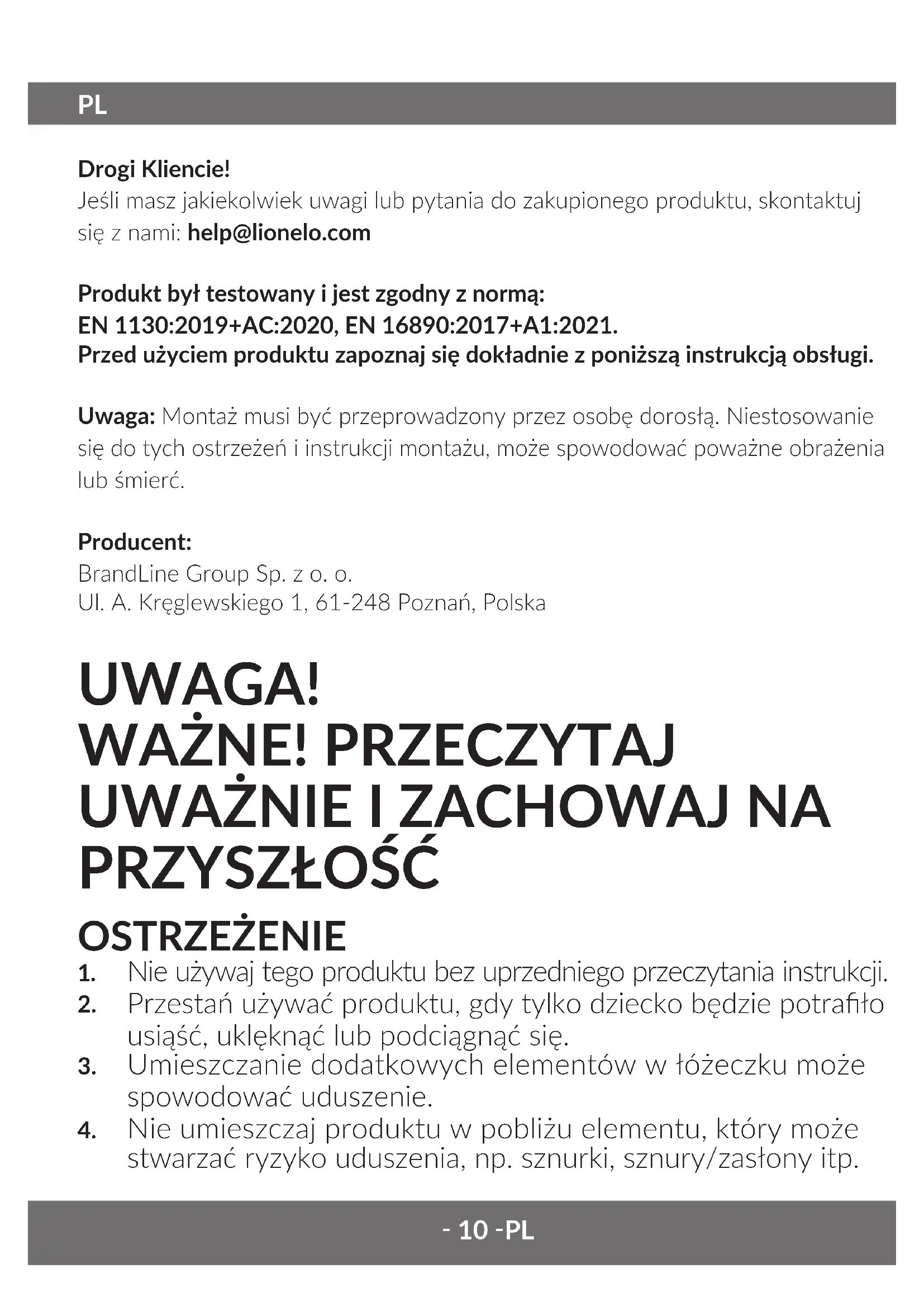 Jesli masz jakiekolwiek uwagi lub pytania do zakupionego produktu, skontaju sie z nami: help@lionelo.com