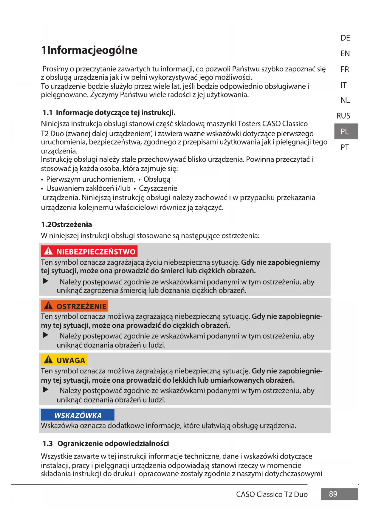 Niniejsza instrukcja obsługi stanowi część składową maszynki Tosters CASO Classico T2 Duo (zwanej dalej urządzeniem) i zawiera ważne wskazówki dotyczące pierwszego uruchomienia, bezpieczeństwa, zgodnego z przepisami użytkowania jak i pielęgnacji tego urządzenia. Instrukcję obsługi należy stale przechowywać blisko urządzenia. Powinna przeczytać i stosować ją każda osoba, która zajmuje się:
