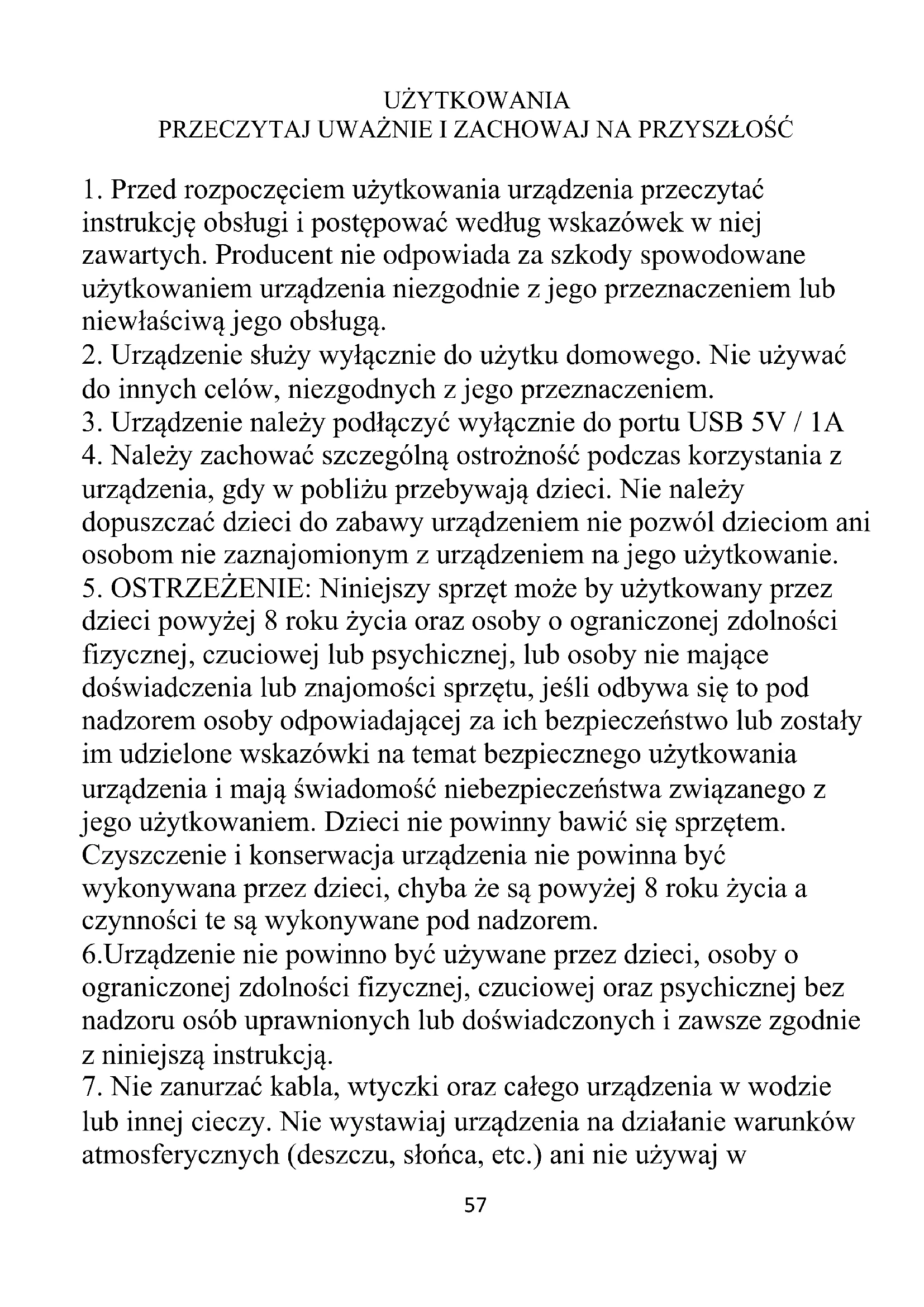 dzieci powyżej 8 roku życia oraz osoby o ograniczonej zdolności fizycznej, czuciowej lub psychicznej, lub osoby nie mające doświadczenia lub znajomości sprzętu, jeśli odbywa się to pod nadzorem osoby odpowiadającej za ich bezpieczeństwo lub zostały im udzielone wskazówki na temat bezpiecznego użytkowania urządzenia i mają świadomość niebezpieczeństwa związanego z jego użytkowaniem. Dzieci nie powinny bawić się sprzętem. Czyszczenie i konserwacja urządzenia nie powinna być wykonywana przez dzieci, chyba że są powyżej 8 roku życia a czynności te są wykonywane pod nadzorem. 6.Urządzenie nie powinno być używane przez dzieci, osoby o ograniczonej zdolności fizycznej, czuciowej oraz psychicznej bez nadzoru osób uprawnionych lub doświadczonych i zawsze zgodnie z niniejszą instrukcją.