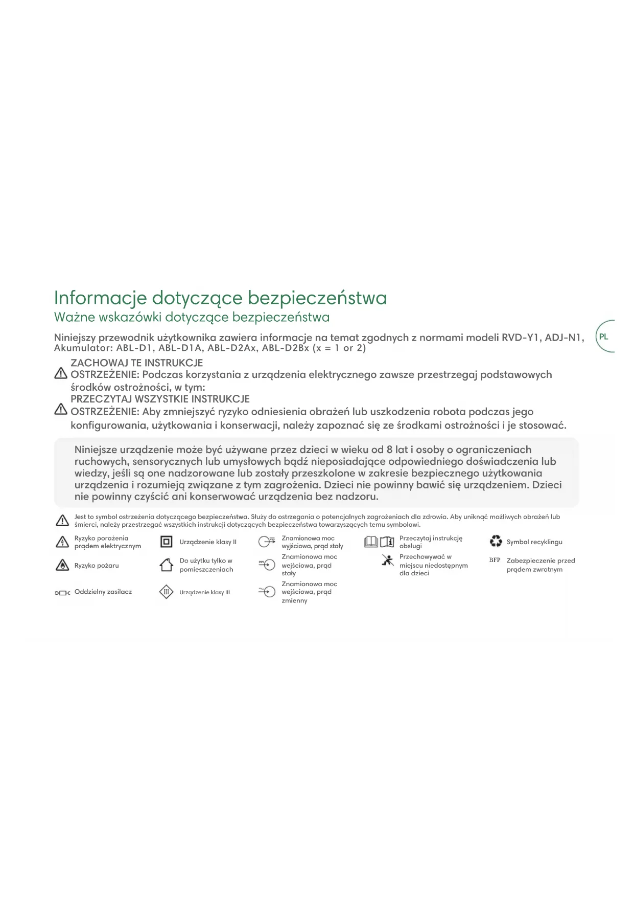 OSTRZEŻENIE: Aby zmniejszyć ryzyko odniesienia obrażeń lub uszkodzenia robota podczas jego kongurowania, użytkowania i konserwacji, należy zapoznać się ze środkami ostrożności i je stosować. Niniejszy przewodnik użytkownika zawiera informacje na temat zgodnych z normami modeli RVD-Y1, ADJ-N1, Akumulator: ABL-D1, ABL-D1A, ABL-D2Ax, ABL-D2Bx (x = 1 or 2) Jest to symbol ostrzeżenia dotyczącego bezpieczeństwa. Służy do ostrzegania o potencjalnych zagrożeniach dla zdrowia. Aby uniknąć możliwych obrażeń lub śmierci, należy przestrzegać wszystkich instrukcji dotyczących bezpieczeństwa towarzyszących temu symbolowi.Ryzyko porażenia prądem elektrycznymUrządzenie klasy IIZnamionowa moc wyjściowa, prąd stały Przeczytaj instrukcję obsługiSymbol recyklinguRyzyko pożaruDo użytku tylko w pomieszczeniachZnamionowa moc wejściowa, prąd stałyPrzechowywać w miejscu niedostępnym dla dzieci BFP Zabezpieczenie przed prądem zwrotnymOddzielny zasilaczUrządzenie klasy IIIZnamionowa moc wejściowa, prąd zmienny PLOSTRZEŻENIE: Wskazuje potencjalnie niebezpieczną sytuację, która może być przyczyną śmierci lub poważnych obrażeń ciała. UWAGA: Wskazuje potencjalnie niebezpieczną sytuację, która może być przyczyną lekkich lub średnich obrażeń ciała. UWAGA: Wskazuje potencjalnie niebezpieczną sytuację, która może być przyczyną uszkodzenia mienia.