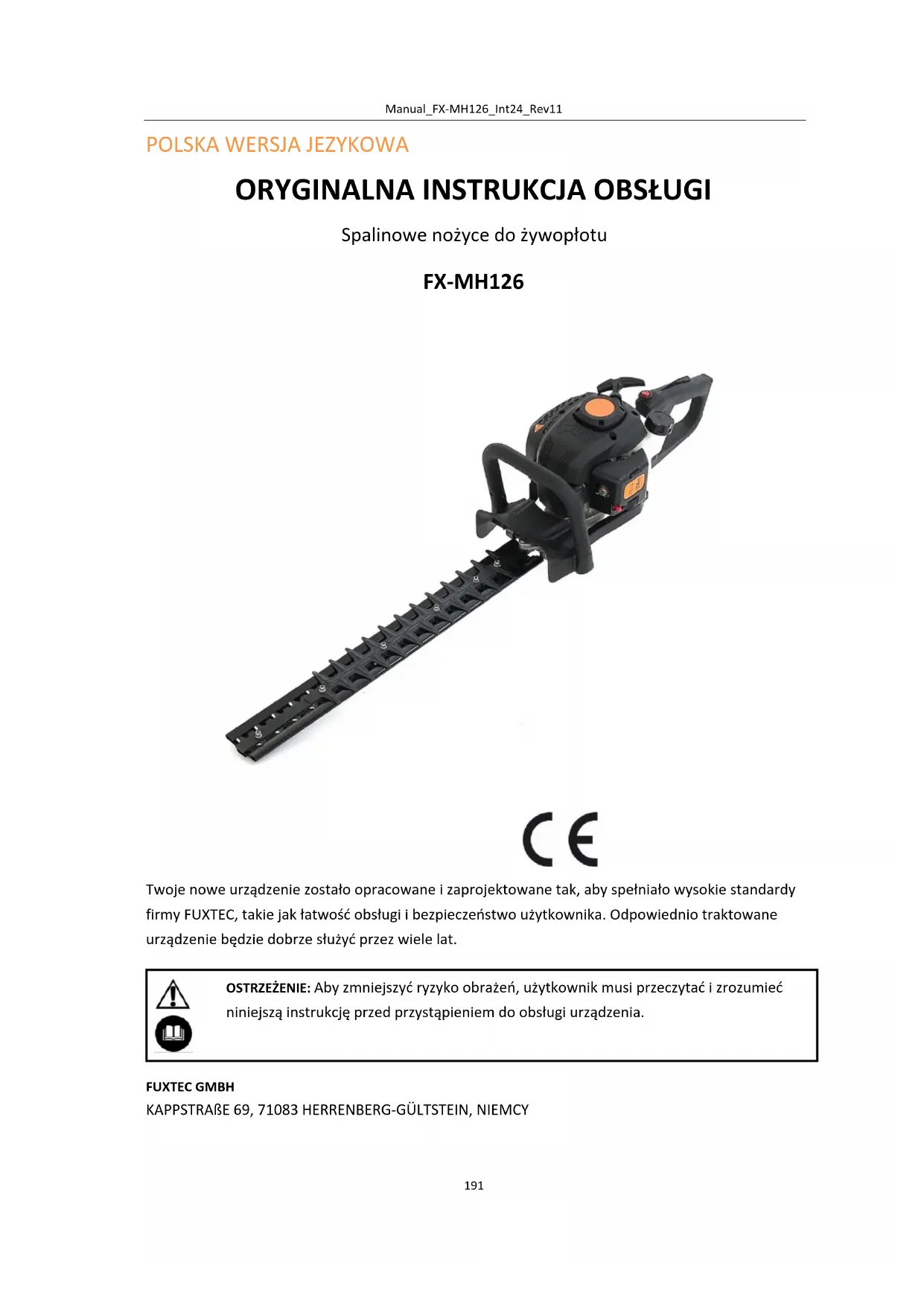Jeśli usunięcie usterki nie rozwiąże problemu, należy skontaktować się bezpośrednio z działem obsługi klienta firmy FUXTEC GmbH. Należy używać wyłącznie oryginalnych części zatwierdzonych przez firmę FUXTEC, w przeciwnym razie istnieje ryzyko zagrożenia.Manual_FX-MH126_Int24_Rev11