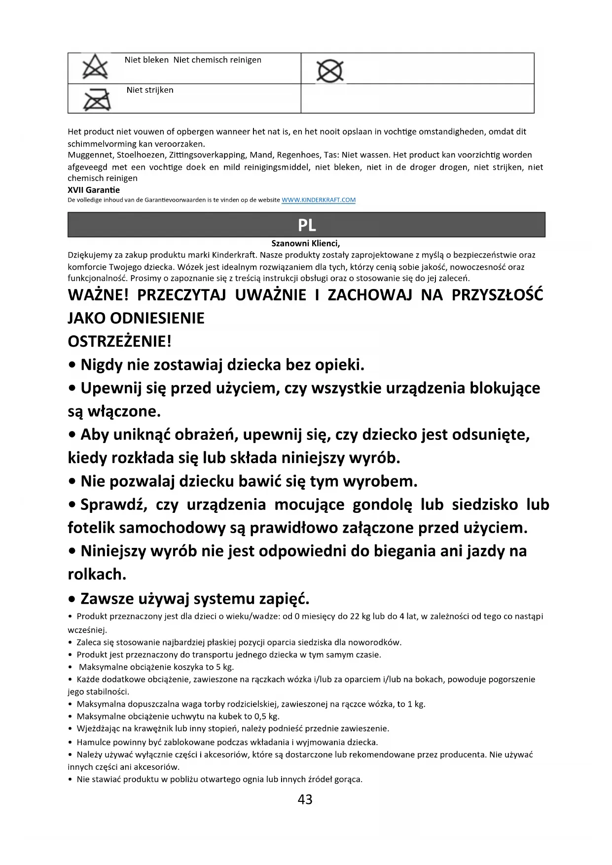 Prać ręcznie w temperaturze maks 40˚C. Nie składać, ani przechowywać produktu, gdy jest mokry i nigdy nie przechowywać go w wilgotnych warunkach, ponieważ może to doprowadzić do tworzenia się pleśni. Moskitiera, Pokrowiec siedziska, Daszek siedziska, Koszyk, Folia przeciwdeszczowa, Torba: nie prać. Produkt można przemywać delikatnie wilgotną ściereczką i łagodnym środkiem myjącym, nie wybielać, nie suszyć w suszarce bębnowej, nie prasować, nie czyścić chemicznie.46 XVII Gwarancja Pełna treść Warunków Gwarancji jest dostępna na stronie internetowej WWW.KINDERKRAFT.COM